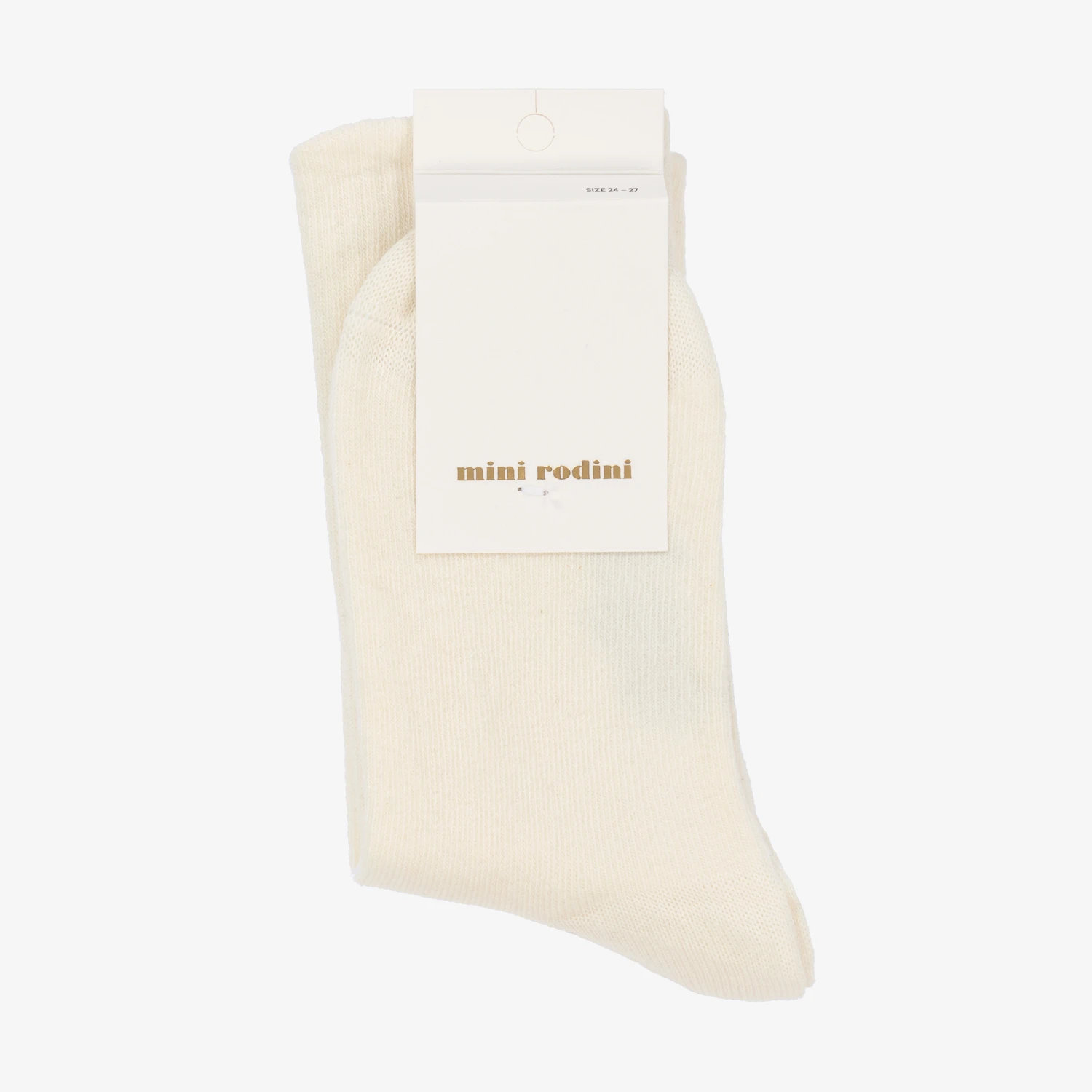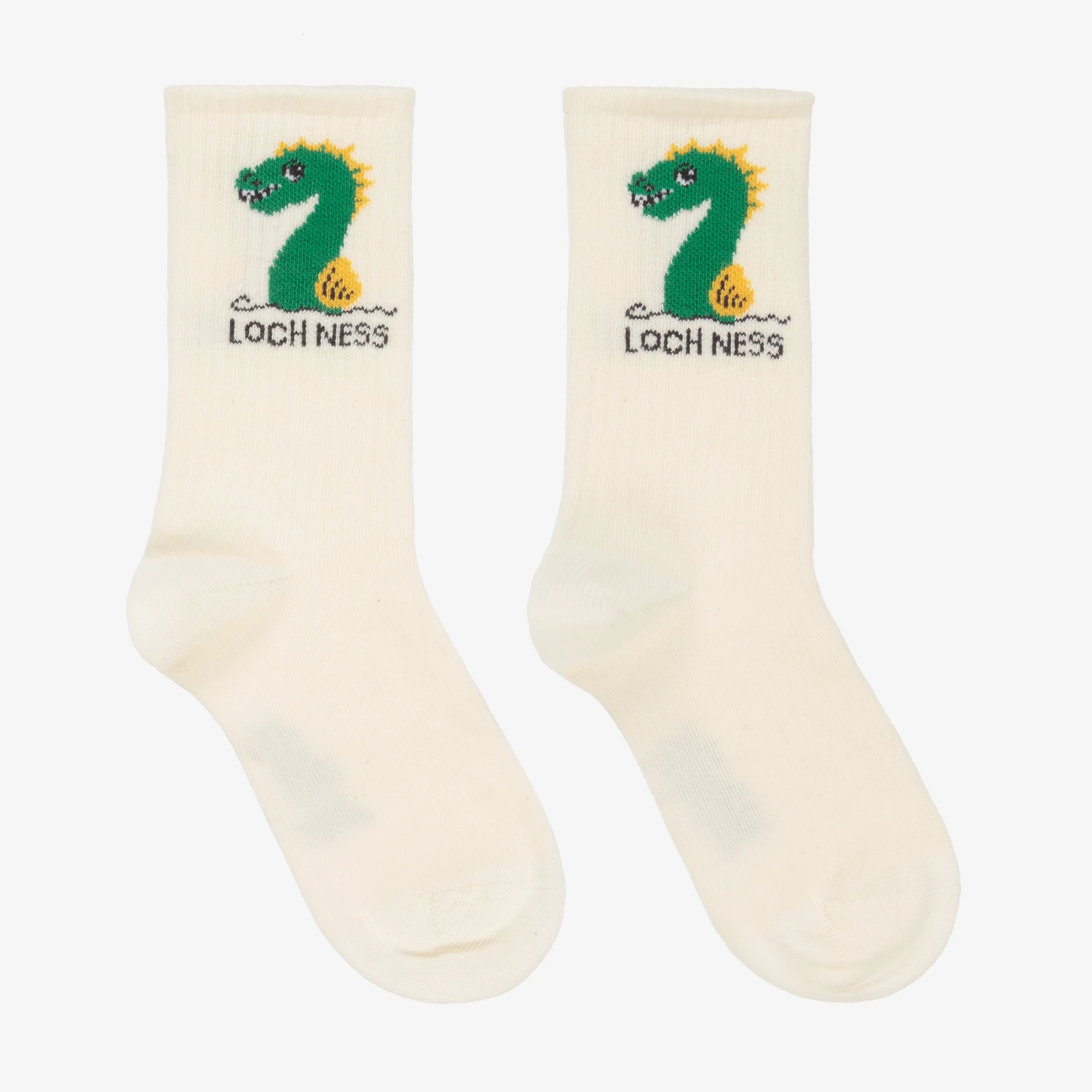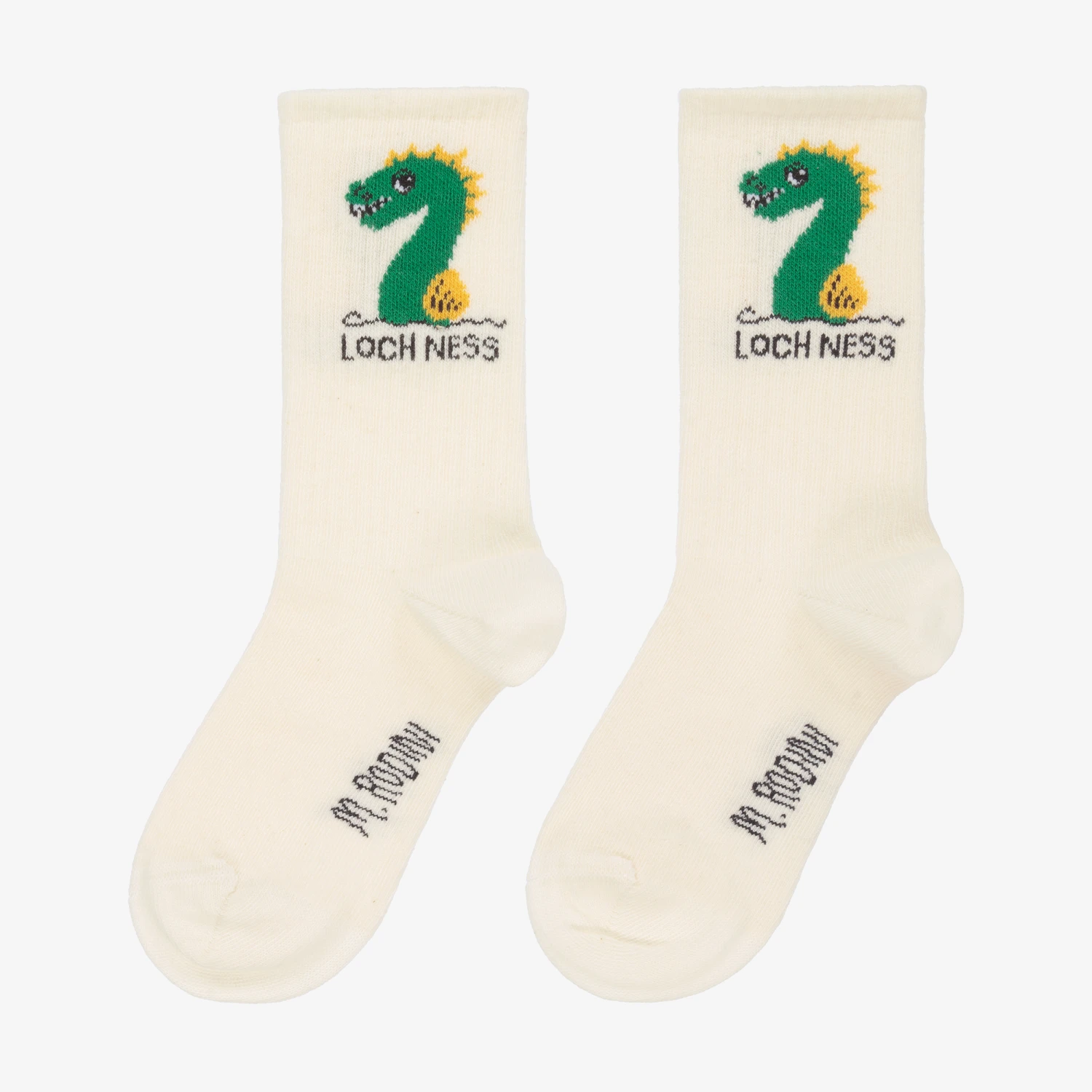 Super cute ivory socks for boys and girls by Mini Rodini, made from super soft organic cotton. The ribbed legs have a green and yellow Loch Ness monster motif on both sides and a logo under the feet.
