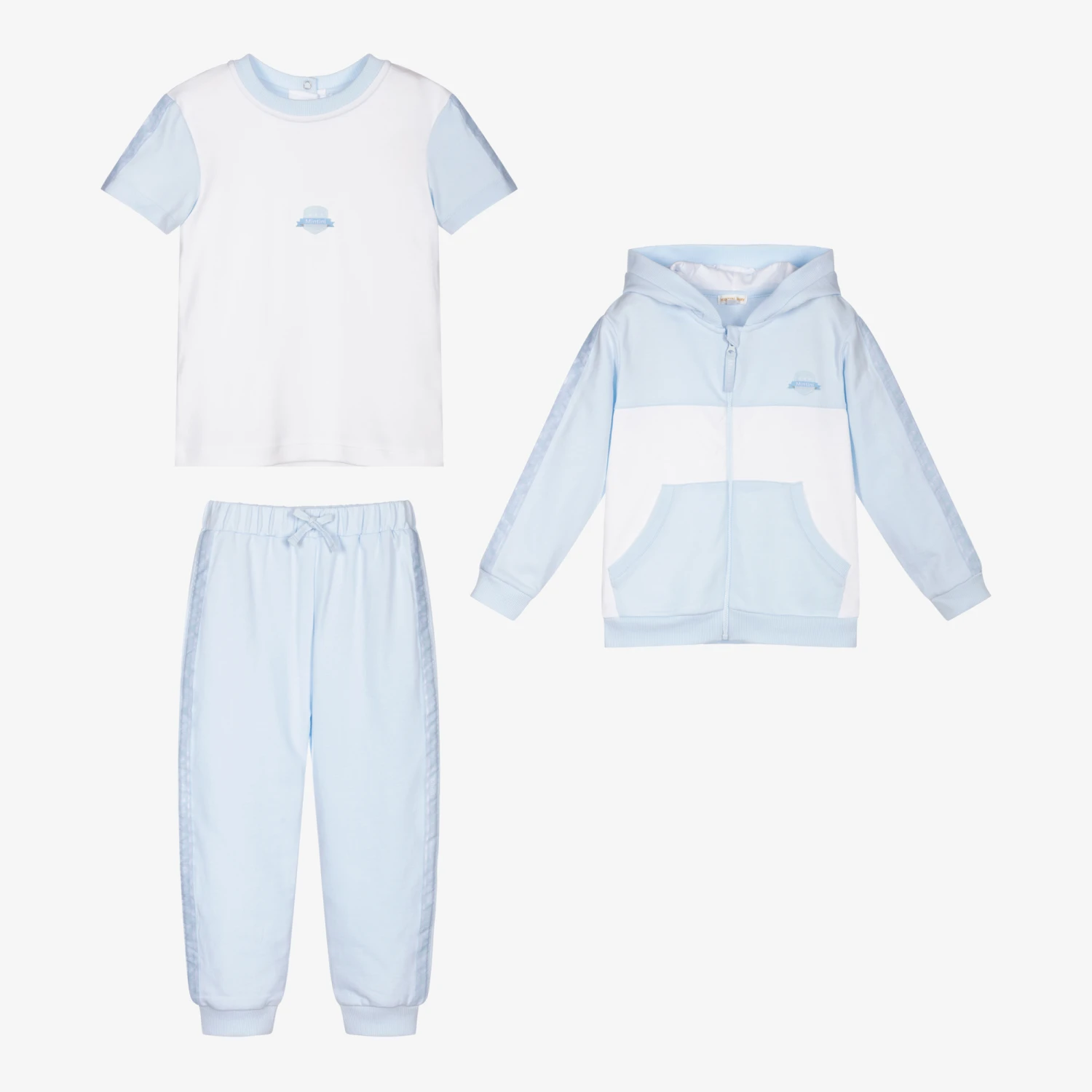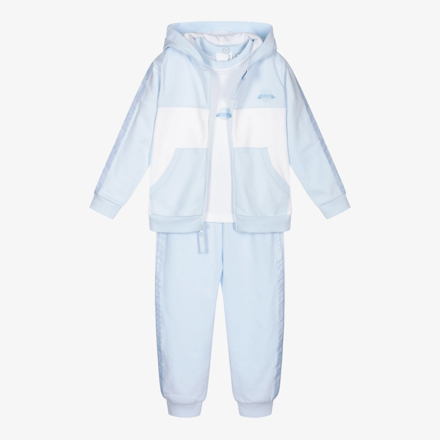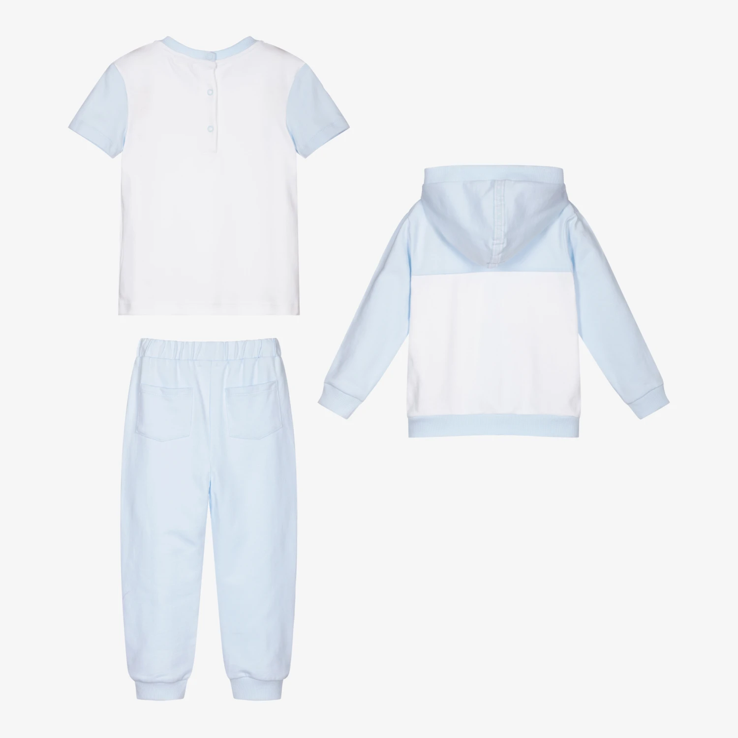 Made in soft cotton jersey, this pale blue and white tracksuit and T-shirt set for boys is by Mintini Baby. The tracksuit top and joggers have logo tape down the sides. The tracksuit top is hooded and has pouch pockets on the front. The joggers have an elasticated waistband with a faux drawstring.