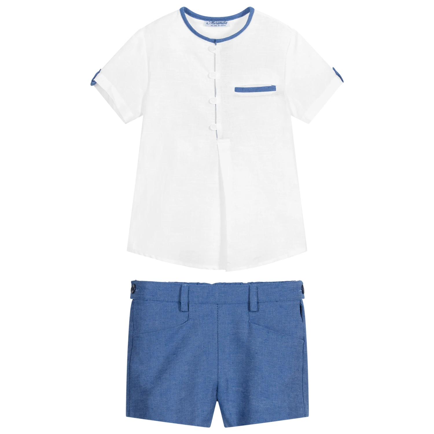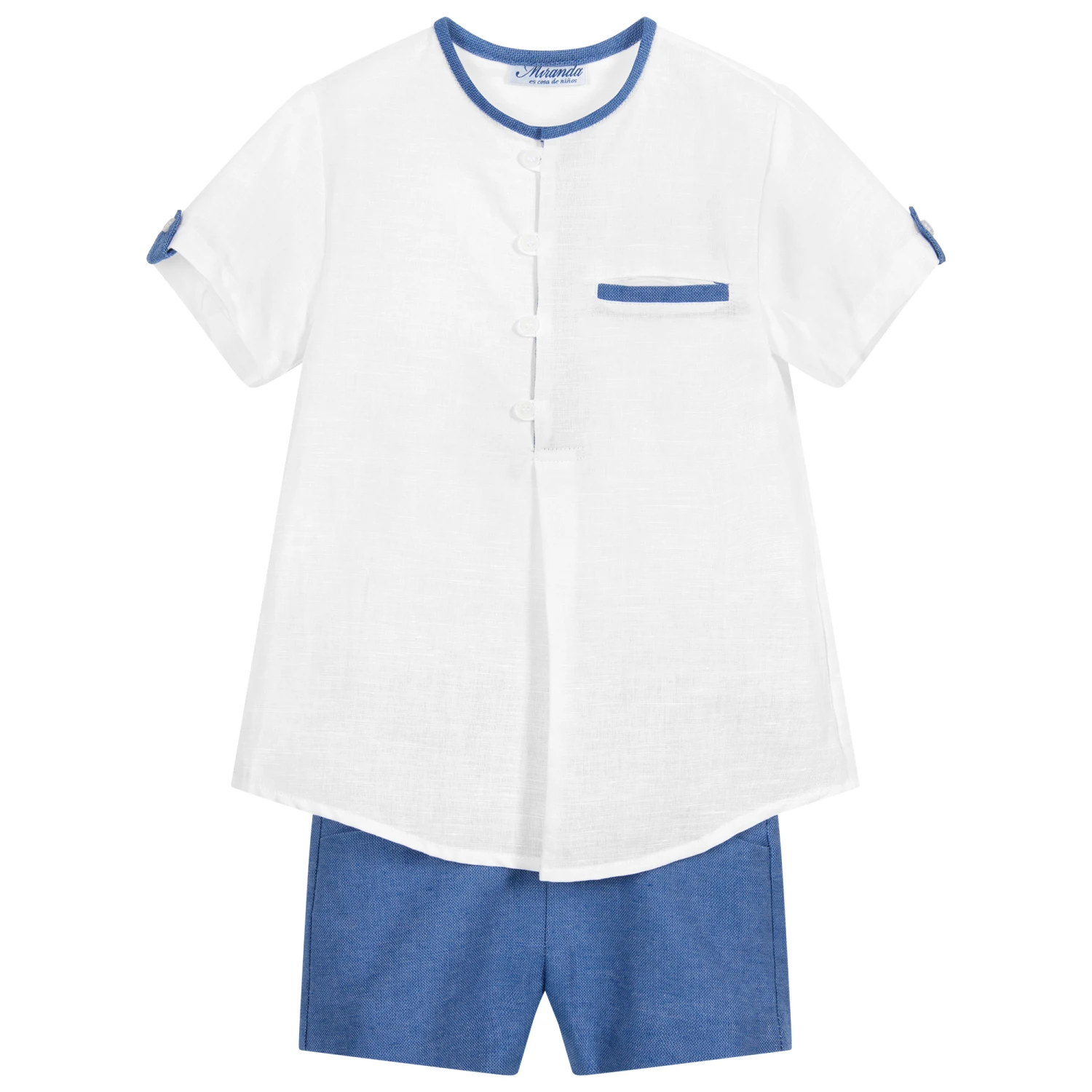 Blue and white shorts set for boys by Miranda, made in a soft, lightweight linen blend. The white, collarless shirt has blue trims, with a chest pocket and button fastenings. The blue shorts have front pockets and button fastenings on the sides.