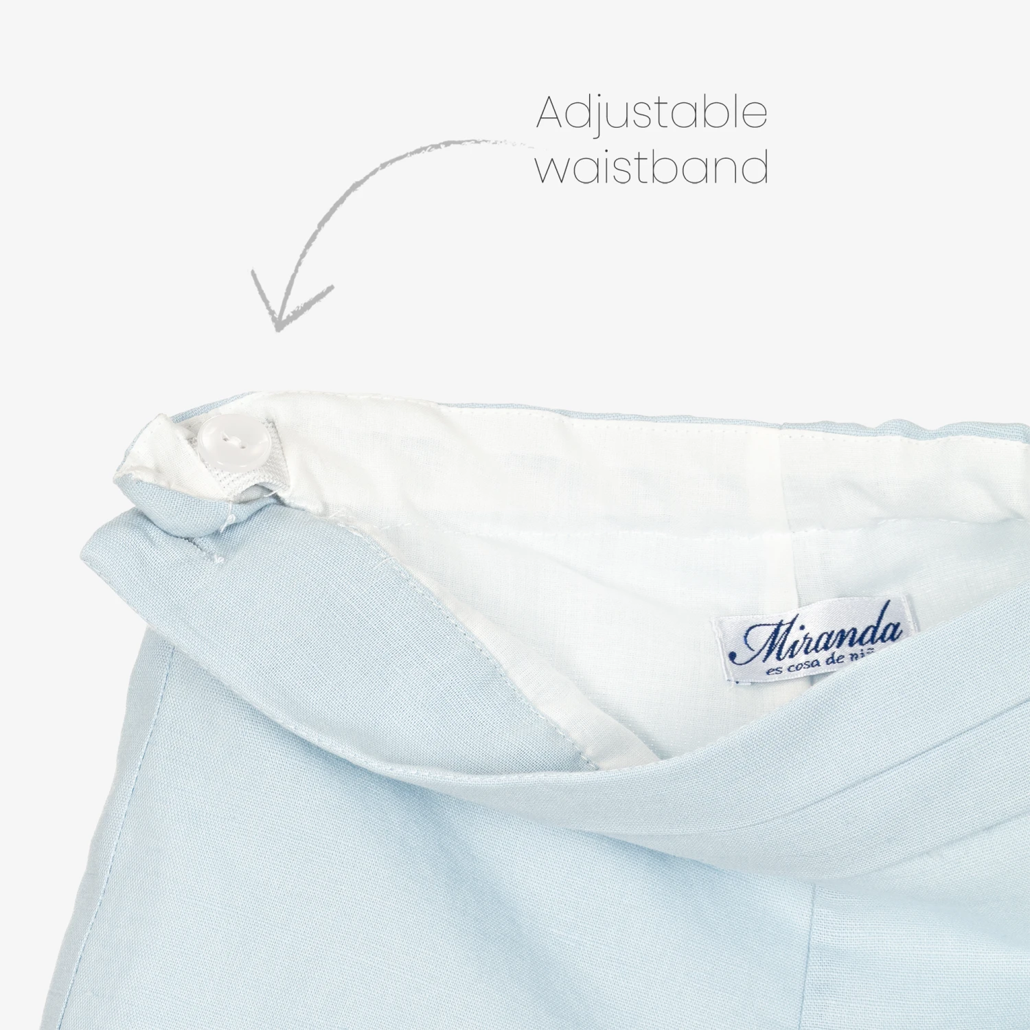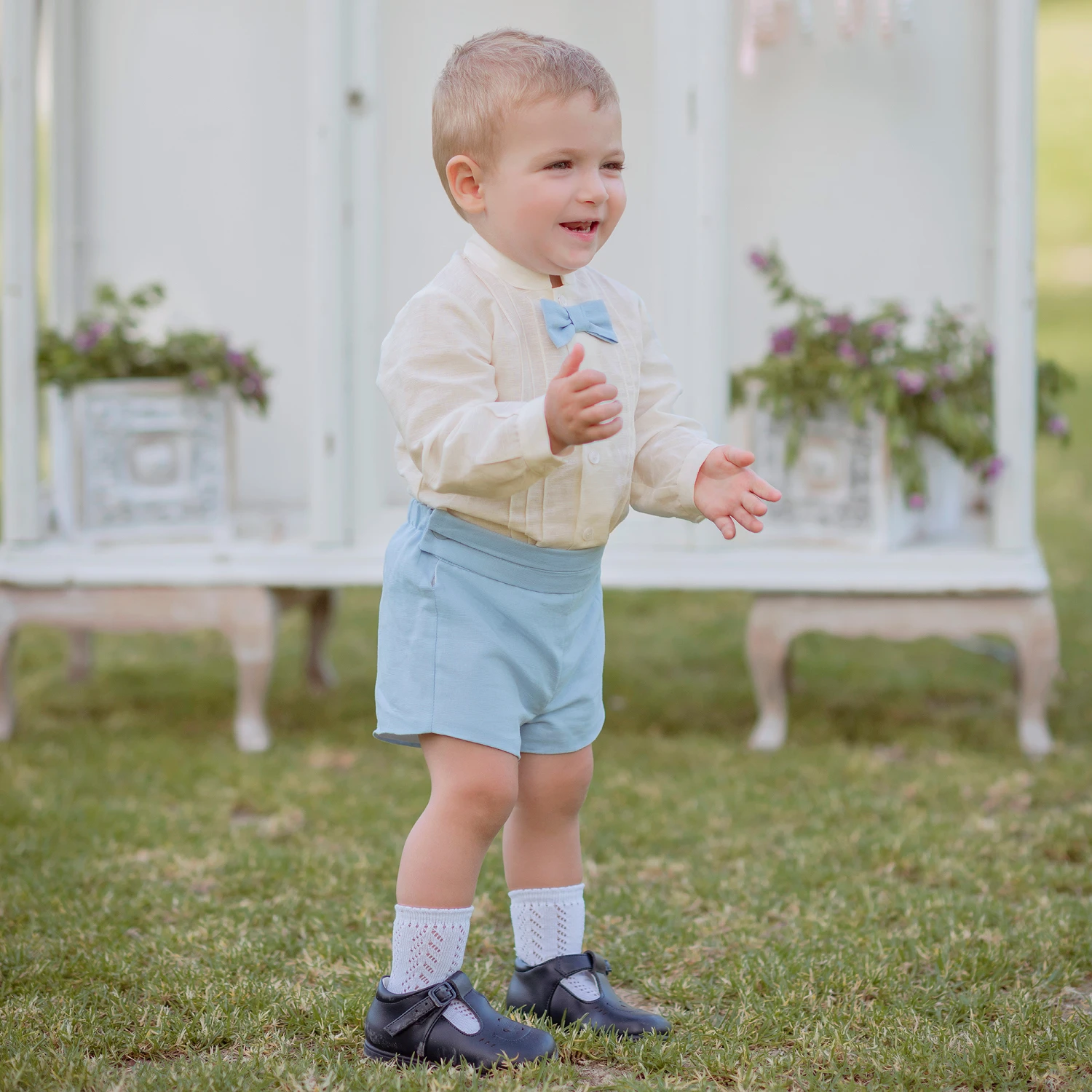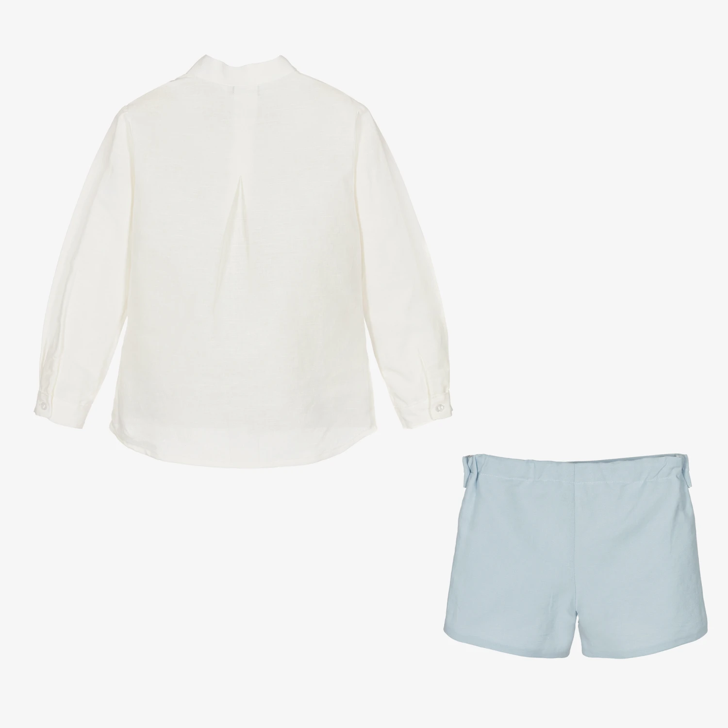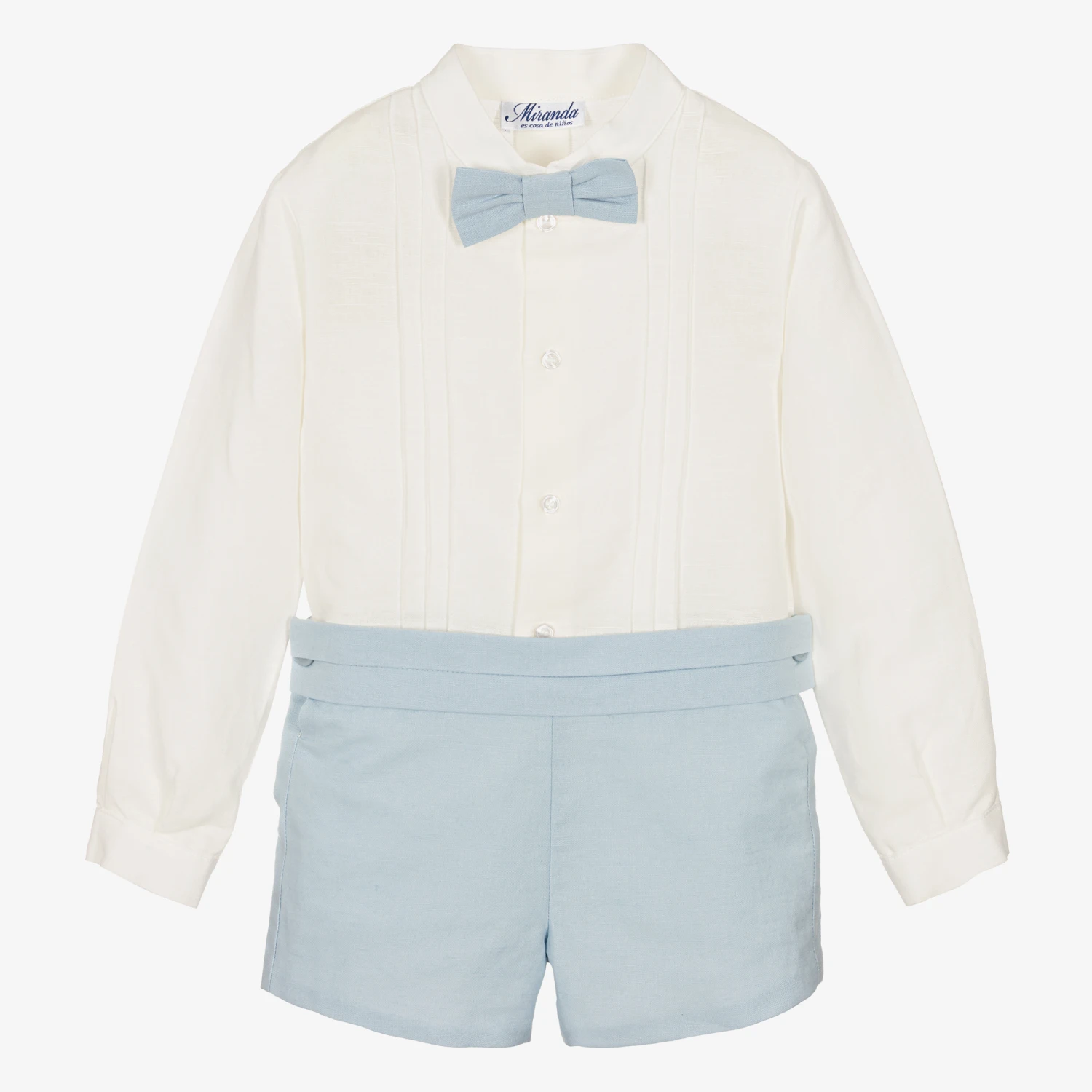 Smart ivory and pale blue shorts set for little boys from Miranda, made in a lightweight linen blend. The collarless ivory shirt fastens with front buttons and has an attached blue bow tie. The coordinating tailored blue shorts have a pleated panel across the front of the waist for a timeless touch. They have side button fastenings and a useful adjustable waist to allow room for growth.
