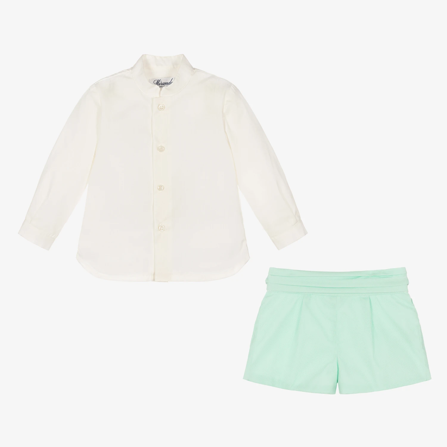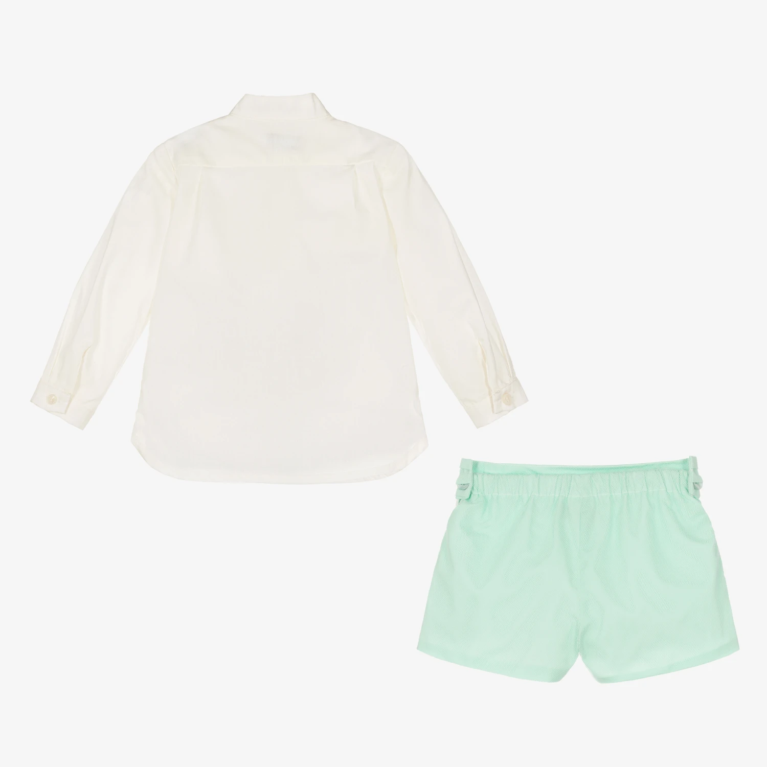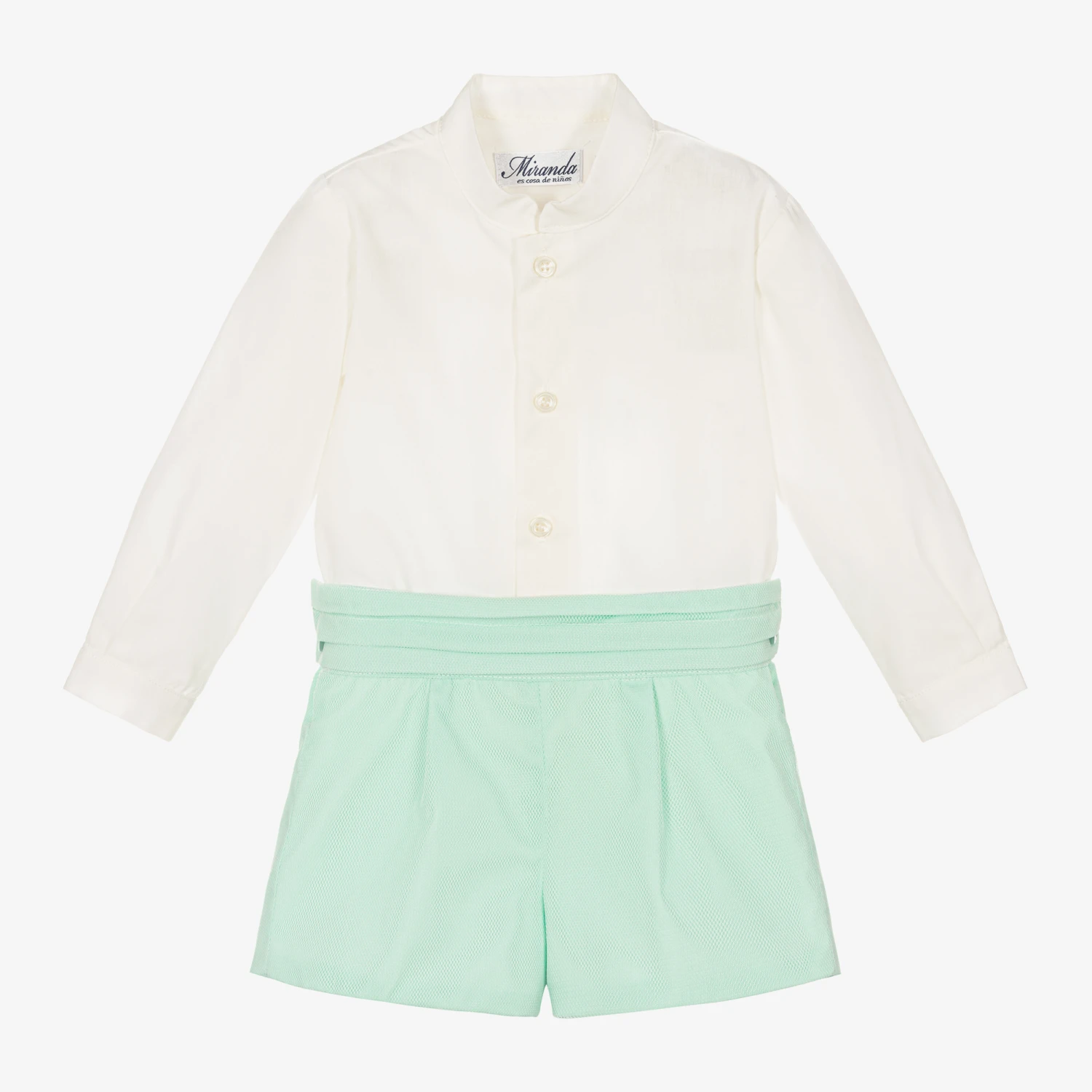 Smart ivory and green shorts set for little boys, by Miranda. Woven in a lightweight cotton blend, the long-sleeved shirt has a timeless stand-up collar and pearlescent buttons on the front. The mint green button fastening shorts have a fine ivory tulle overlayer and traditionally-styled pleats to complete the classic look. The waistband is adjustable for a comfortable fit.