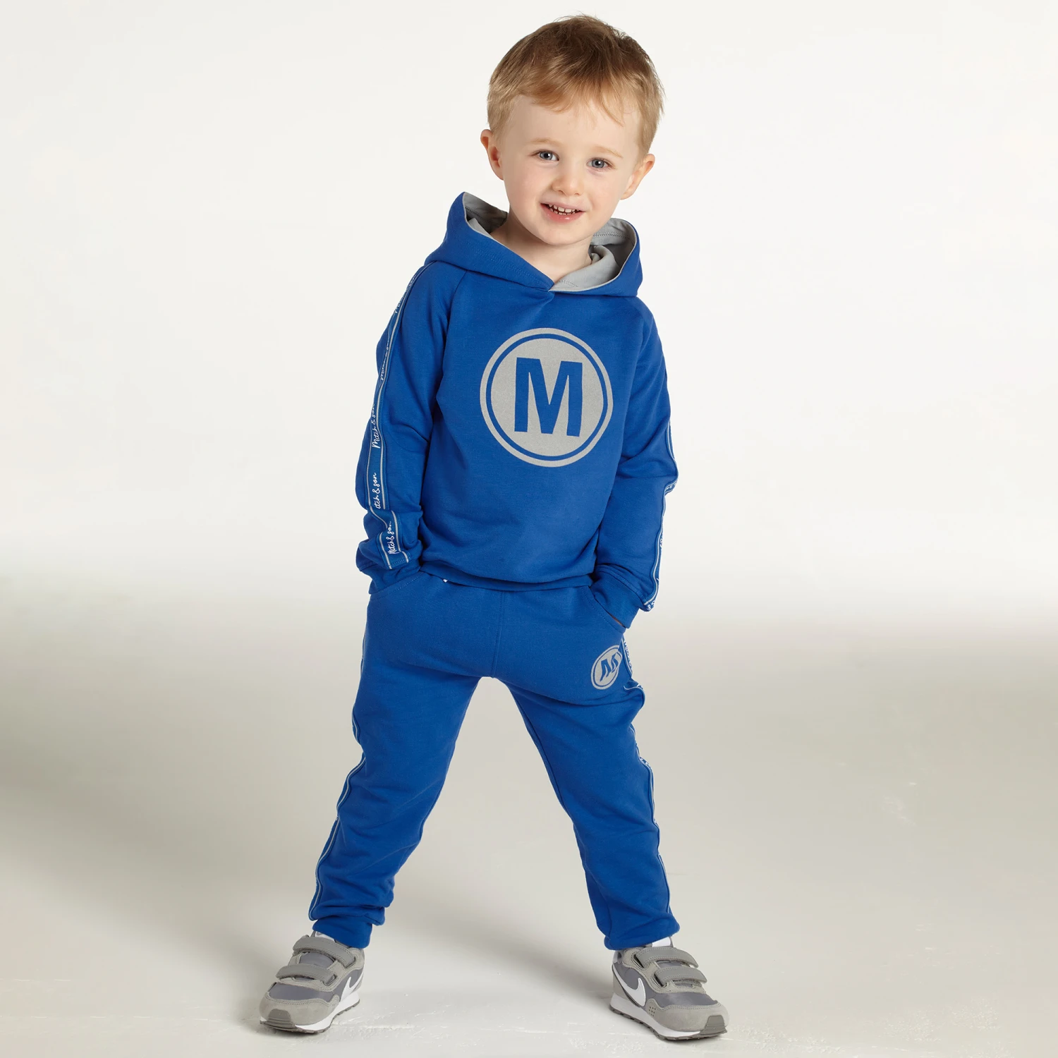 Royal blue hooded tracksuit for boys by Mitch & Son. It has royal blue and white logo tape trims, with grey logo motifs. Lightweight, it is made in soft cotton jersey with a warm fleecy inside. The joggers have an elasticated drawstring waist.