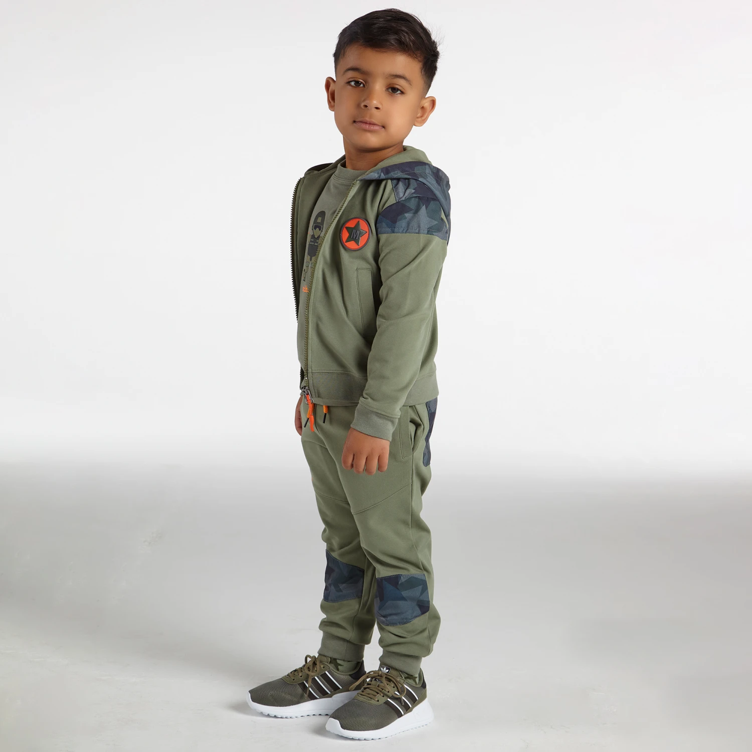 Lightweight khaki green tracksuit for boys by Mitch & Son. It is made in soft cotton jersey, with blue and green star-patterned trims. The hooded top has an orange and green rubberised logo on the chest. The joggers have an elasticated waist, with orange drawstring ties.