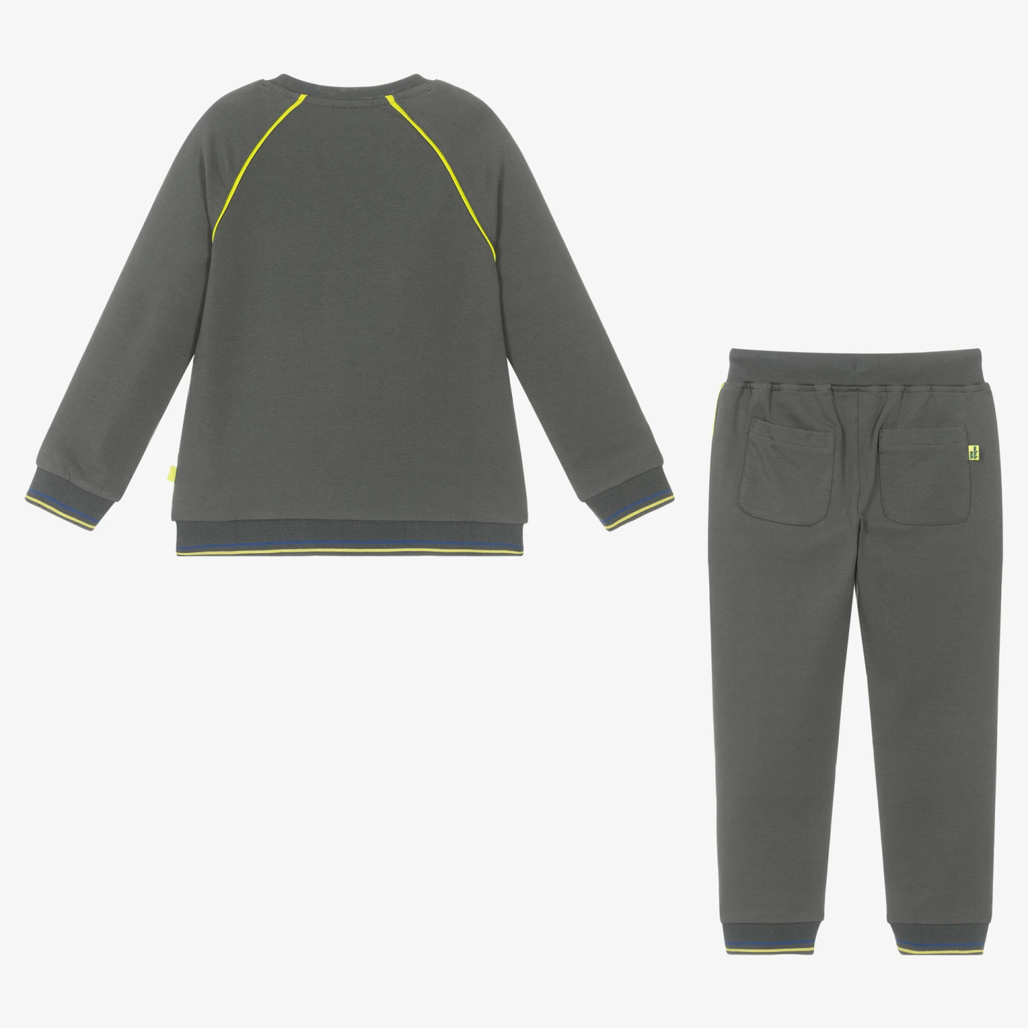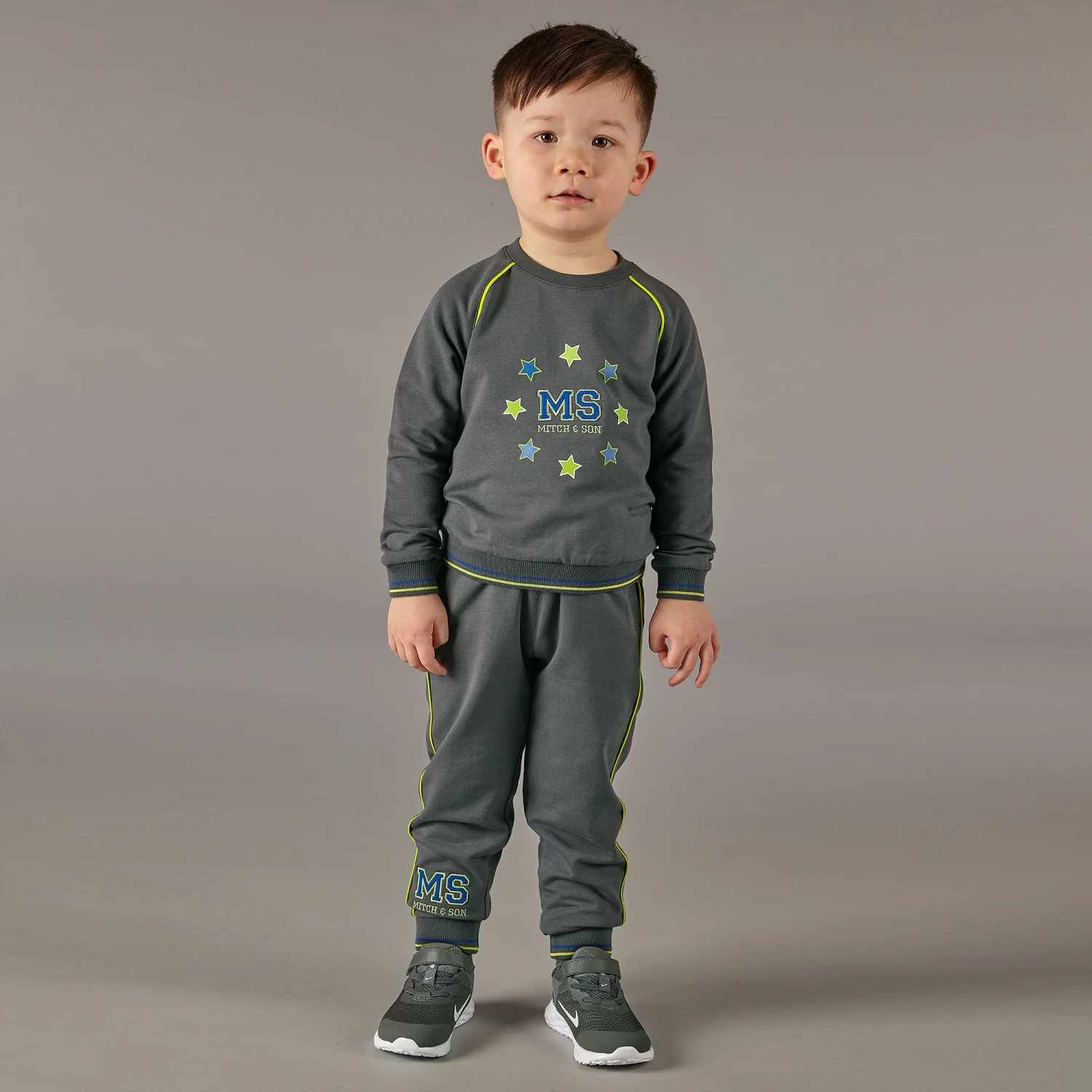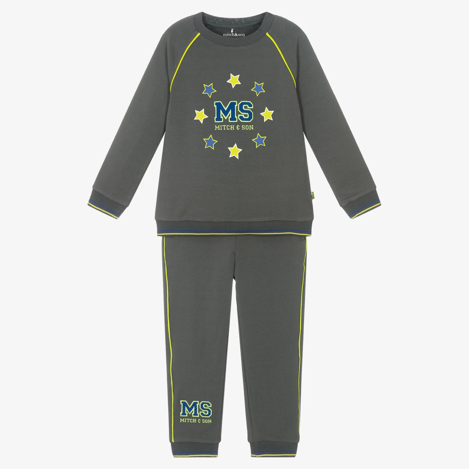 Dark grey cotton tracksuit for boys by Mitch & Son. The sweatshirt top has lime green trims, with embroidered logo initials and star prints. This design is repeated on the joggers, for a co-ordinated finish. They have a drawstring waist and two useful side pockets.