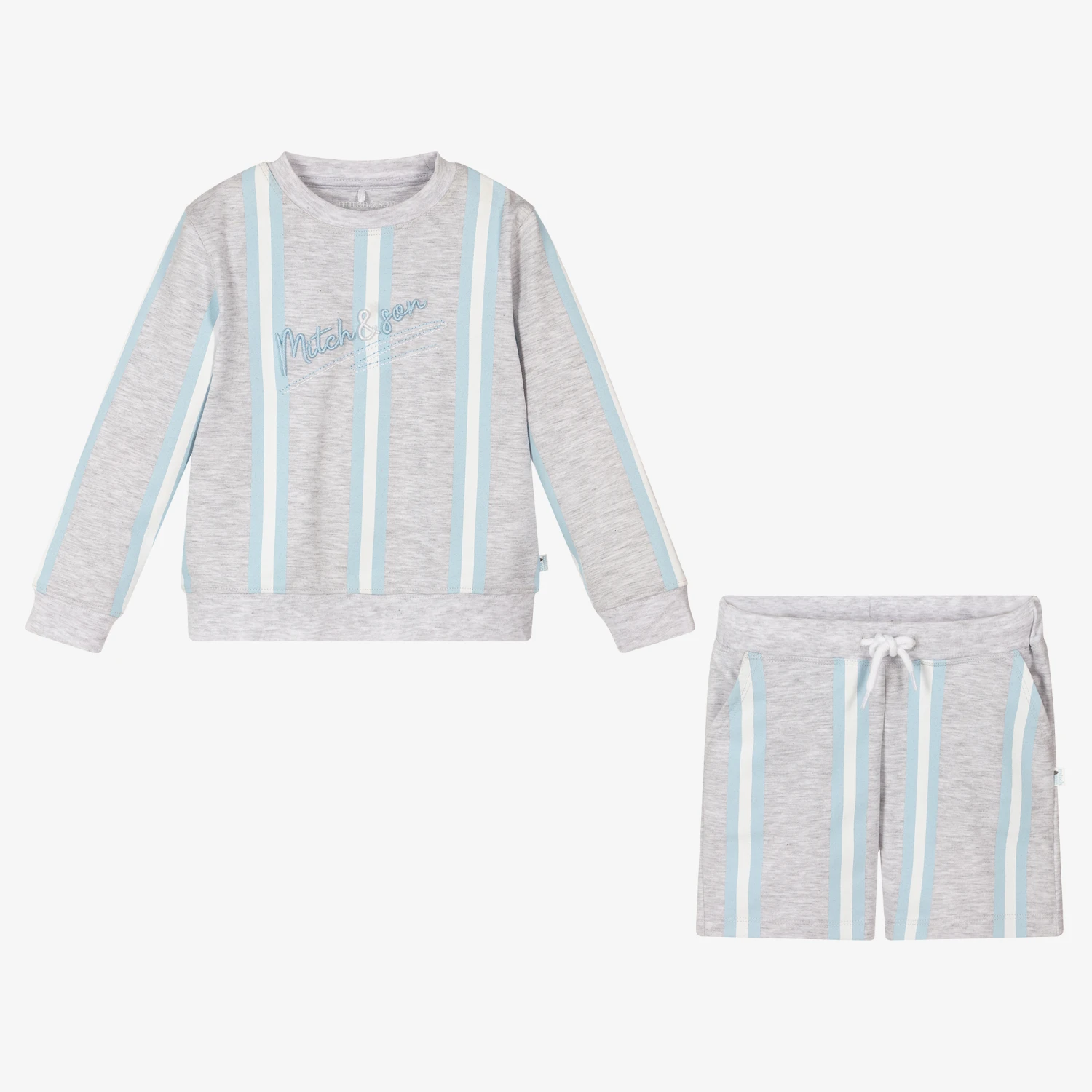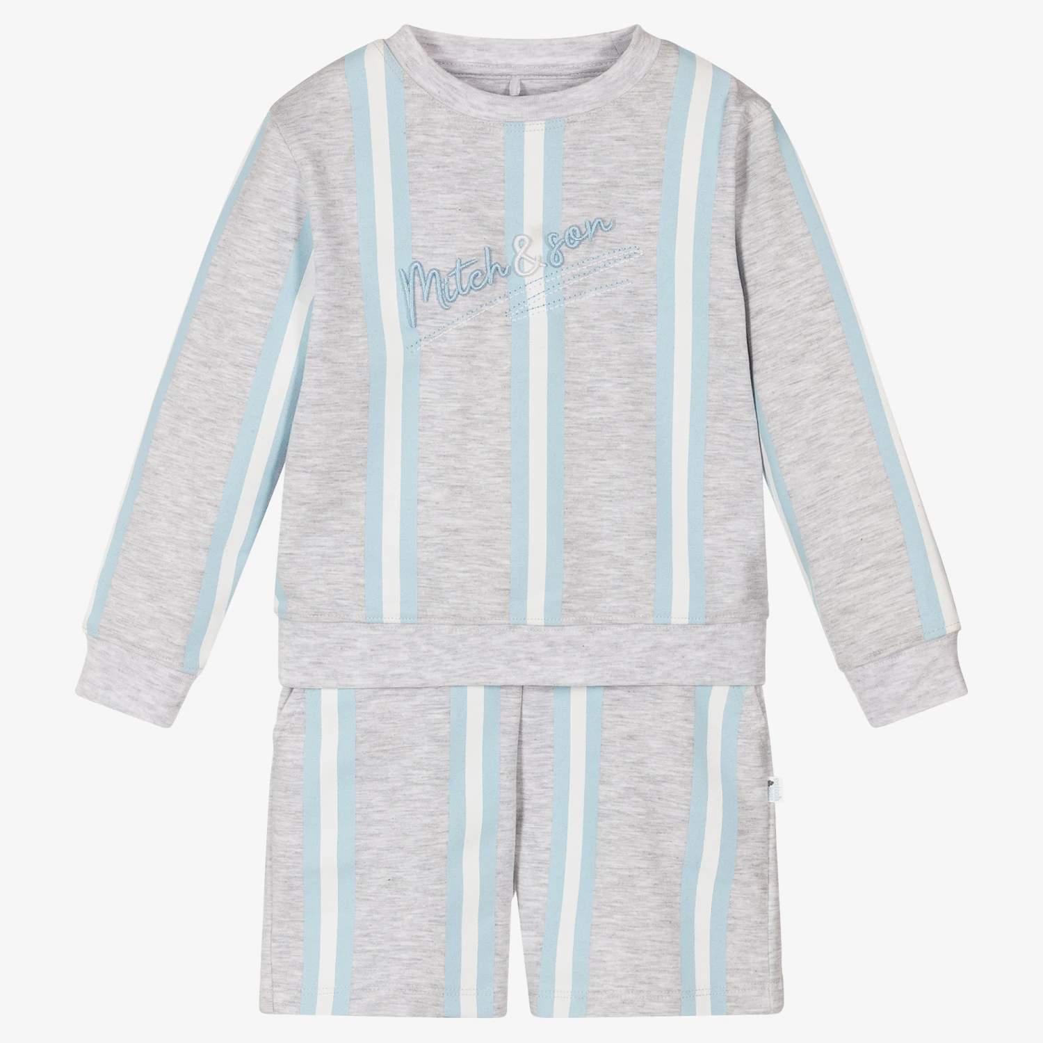 Casual grey marl shorts tracksuit for boys by Mitch & Son, with a fun blue and white striped design. Made in soft cotton jersey, the sweatshirt has the brand’s script logo embroidered in blue and white. It comes with matching striped grey marl shorts, with an adjustable drawstring waist for a comfortable fit.