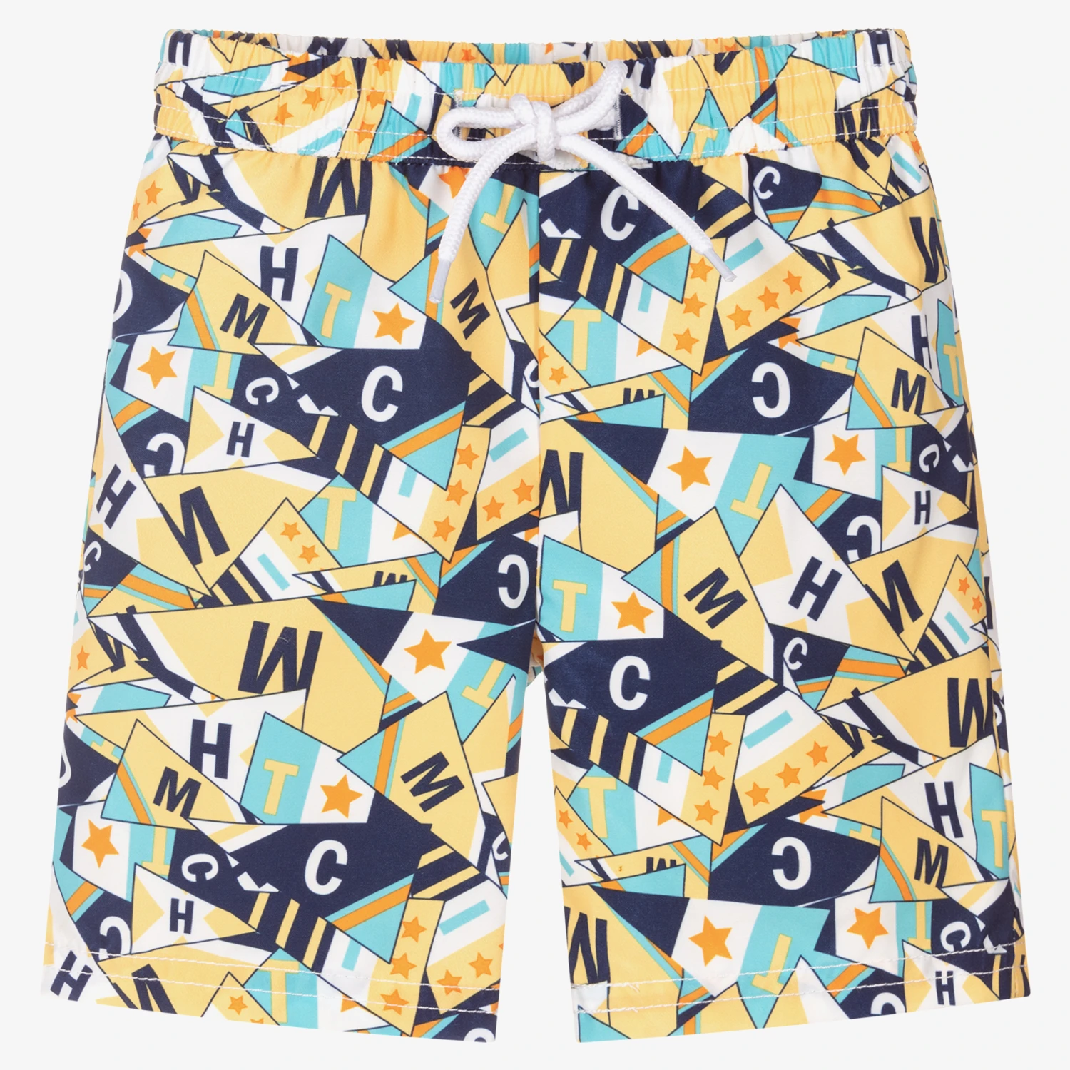 Fun blue and yellow swim shorts for little boys, by Mitch & Son. Made from soft polyester with a mesh lining, they have a colourful logo flag design all-over, and an elasticated waist for a comfortable fit.
