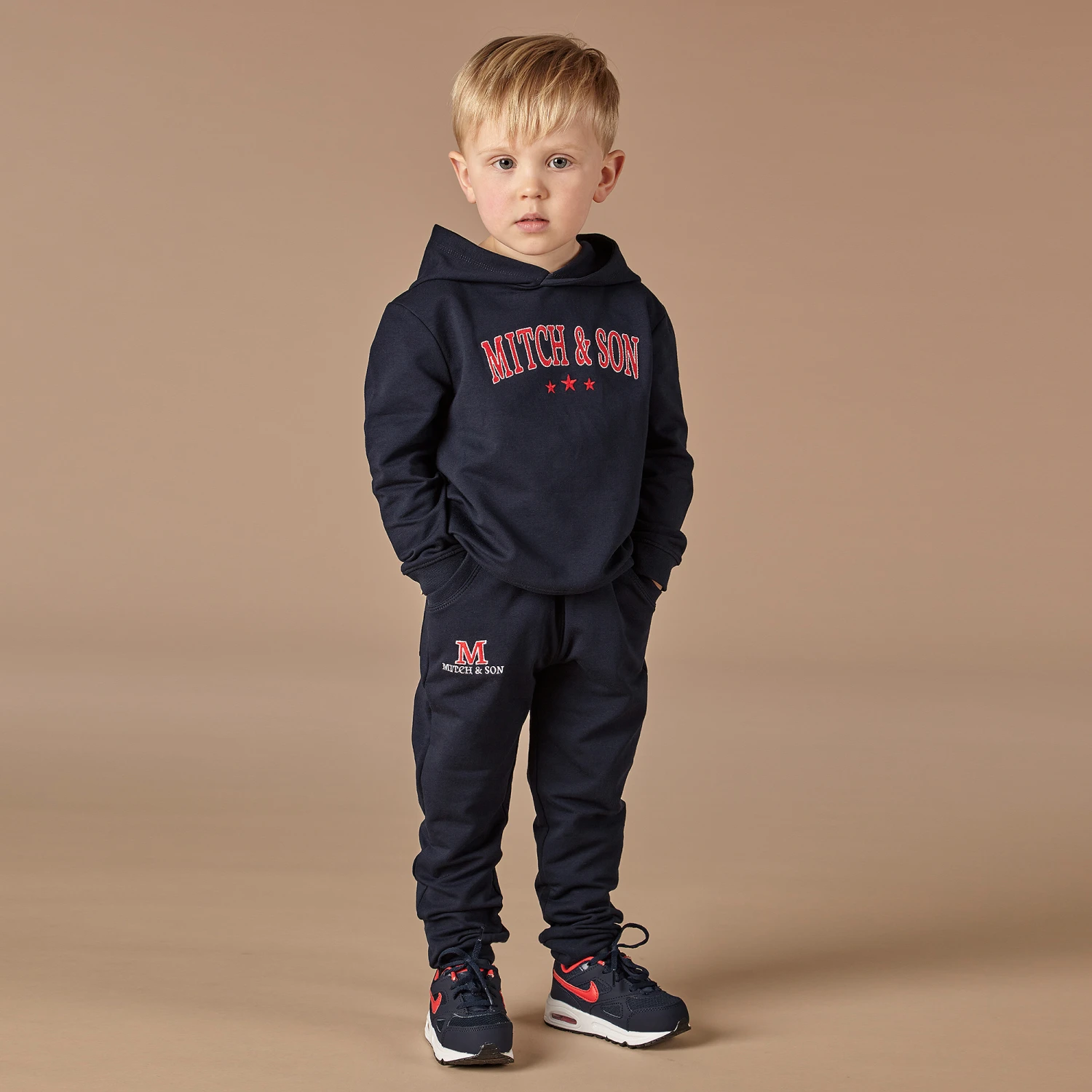 Little boys navy blue cotton tracksuit by Scottish designer Mitch & Son. The hoodie and joggers are made in comfortable, medium-weight jersey, with red and white embroidered logo detailing and softly ribbed trims, gentle on delicate skin. The joggers have four pockets and an elasticated drawstring waist for a great fit.