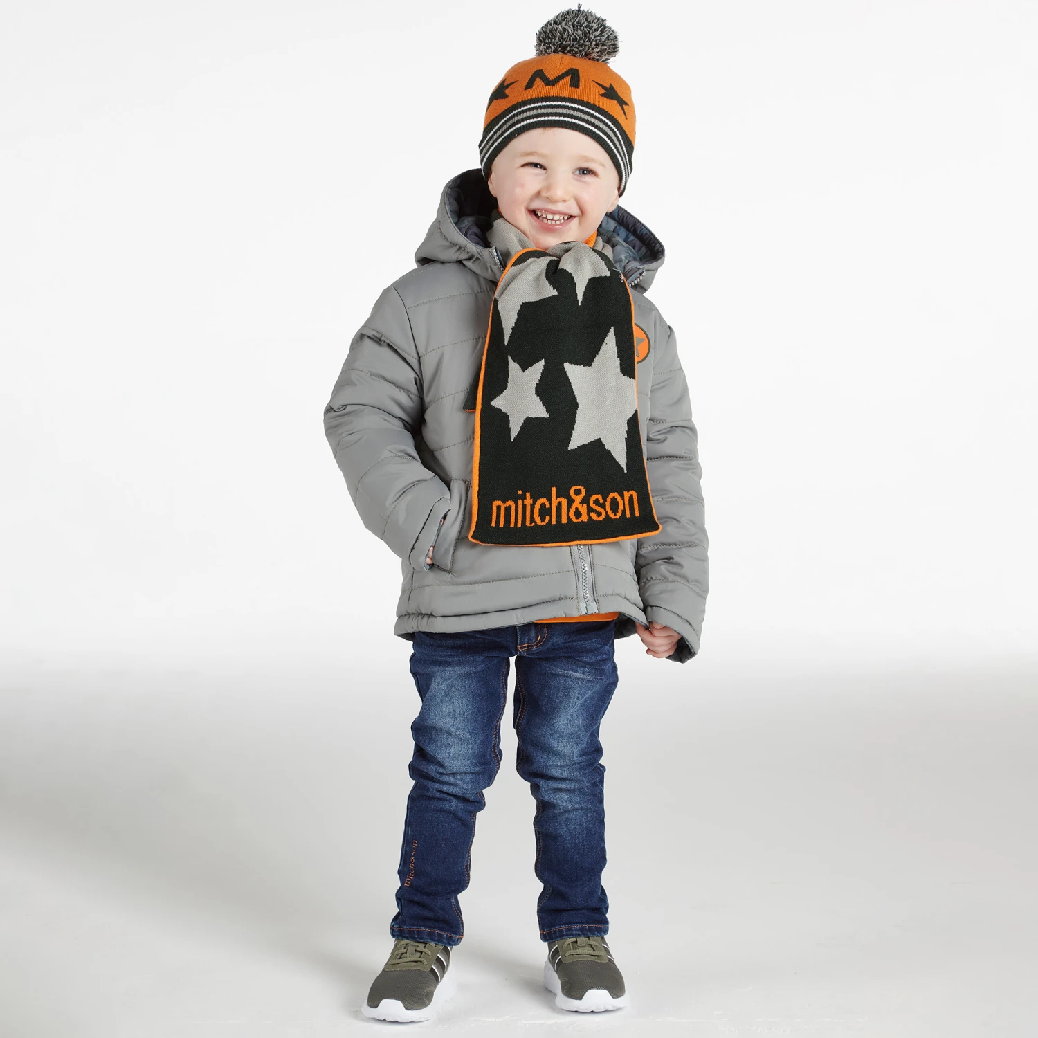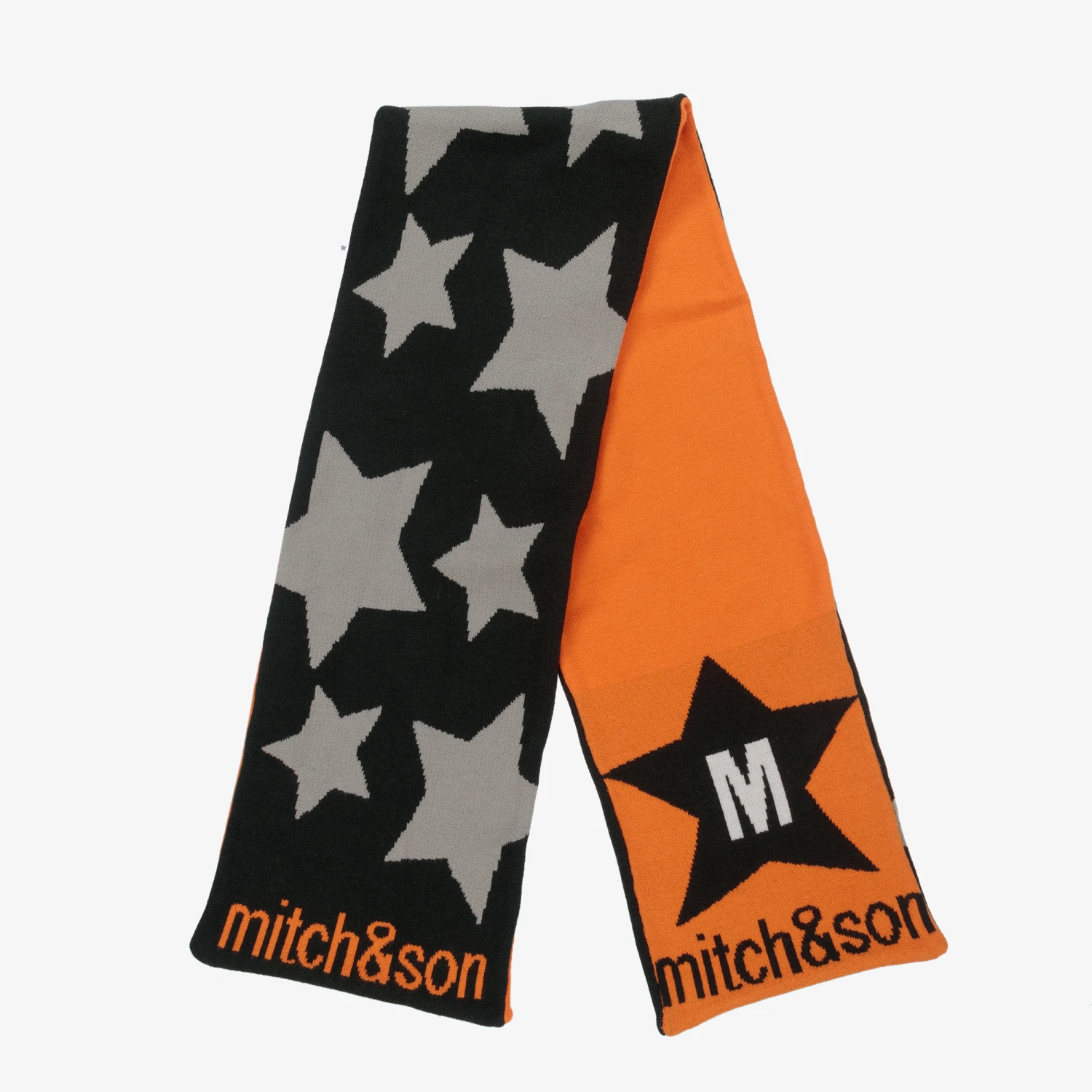 Double sided scarf for boys by Mitch & Son, knitted in a soft acrylic blend. The orange side has a dark green star and logo name, while the dark green side has a grey star pattern, with an orange logo name.