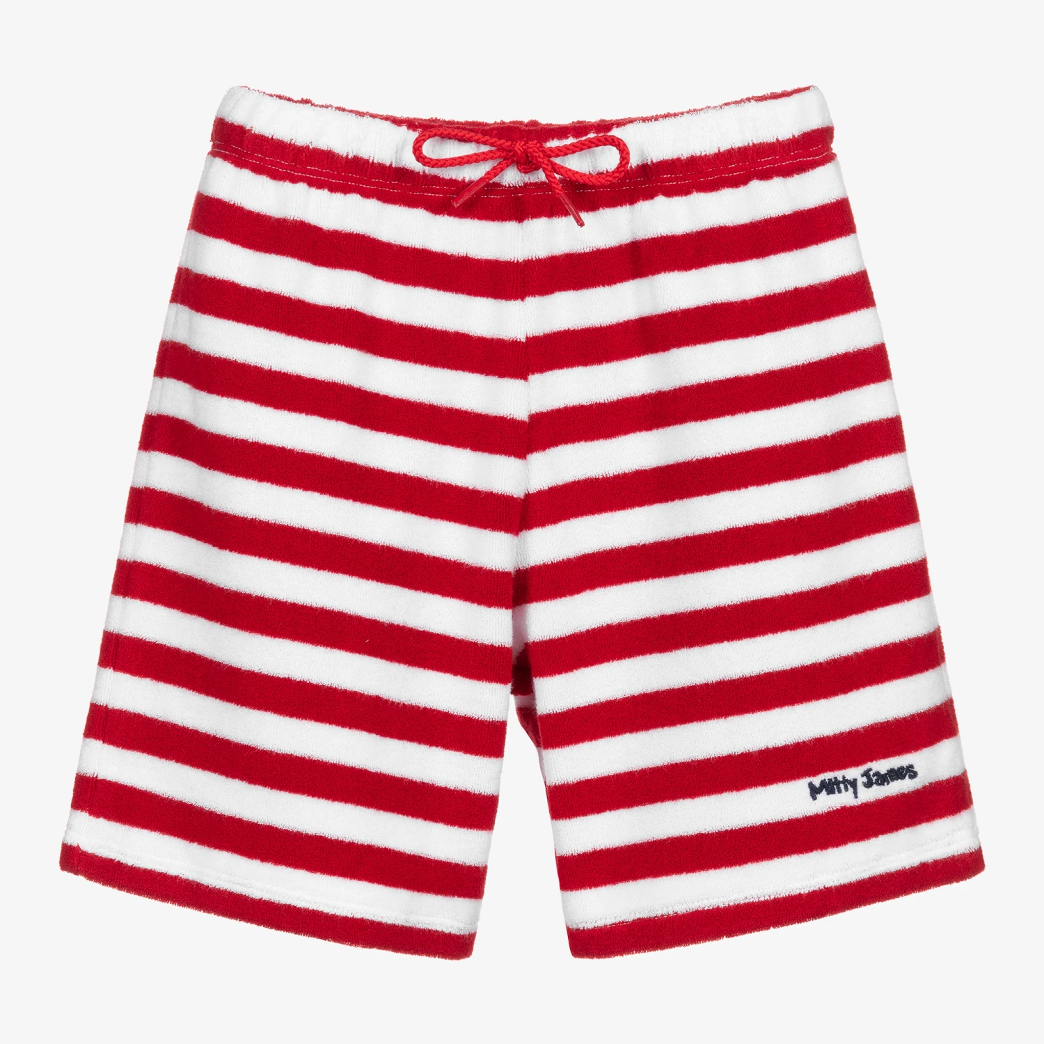 Red and white striped shorts for boys and girls by Mitty James, exclusive to Childrensalon and just right for the beach or poolside. They are made in soft, absorbent cotton towelling with a smooth reverse side and have a comfortable elasticated waistband with a faux drawstring tie. There is navy blue logo embroidery on one leg.