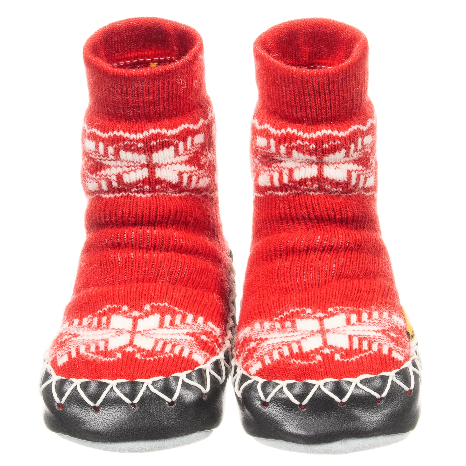 Red and ivory Fair Isle slipper socks by Moccis, made in a soft wool blend, for boys & girls. The durable and flexible leather sole allows the feet to move freely and the invisible elastic around the ankles of the stretchy sock helps prevent them from falling off. They make the ideal non-slip indoor shoe or slipper.