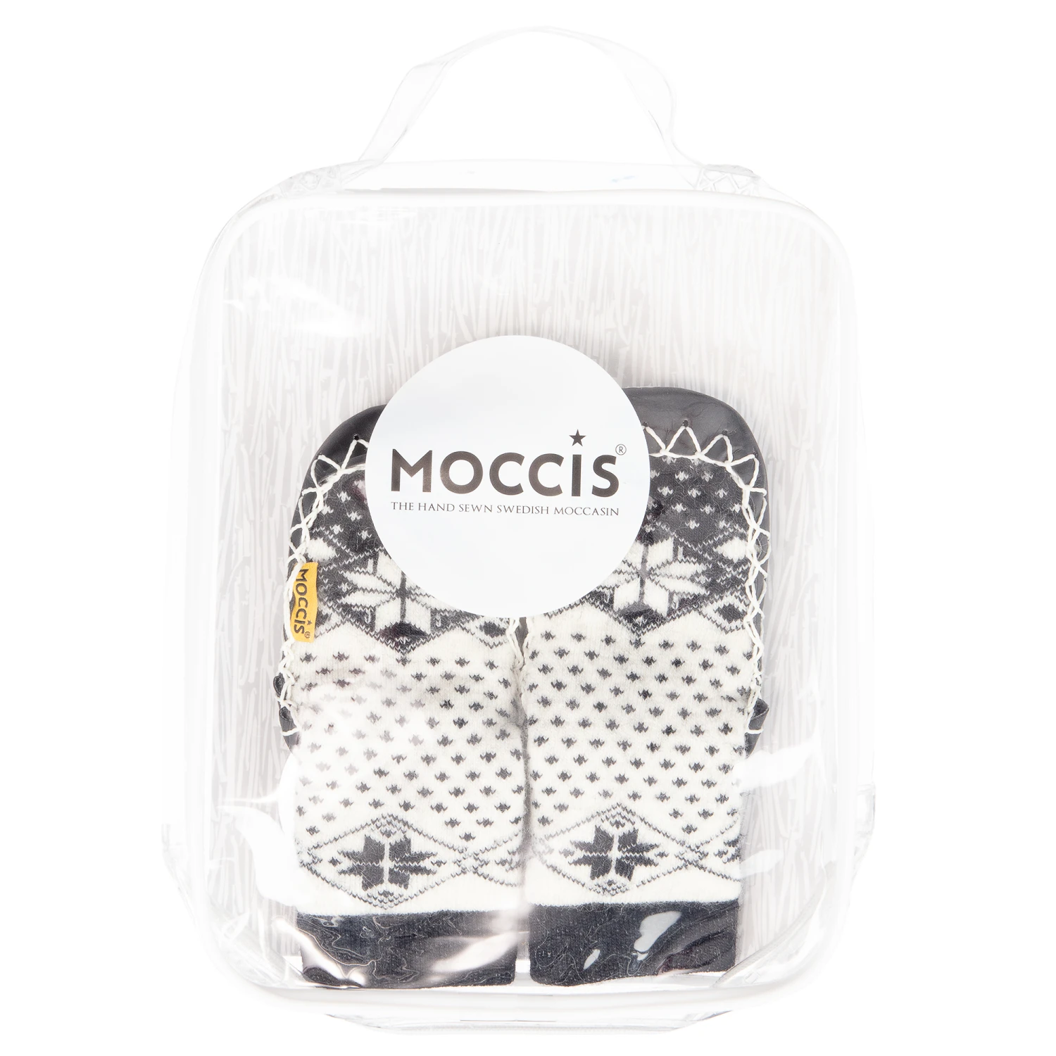 Black and ivory Fair Isle slipper socks by Moccis, for boys and girls, made in a soft wool blend. The durable and flexible leather sole allows the feet to move freely and the invisible elastic around the ankles of the sock helps prevent them from falling off. They make the ideal non-slip indoor shoe or slipper.