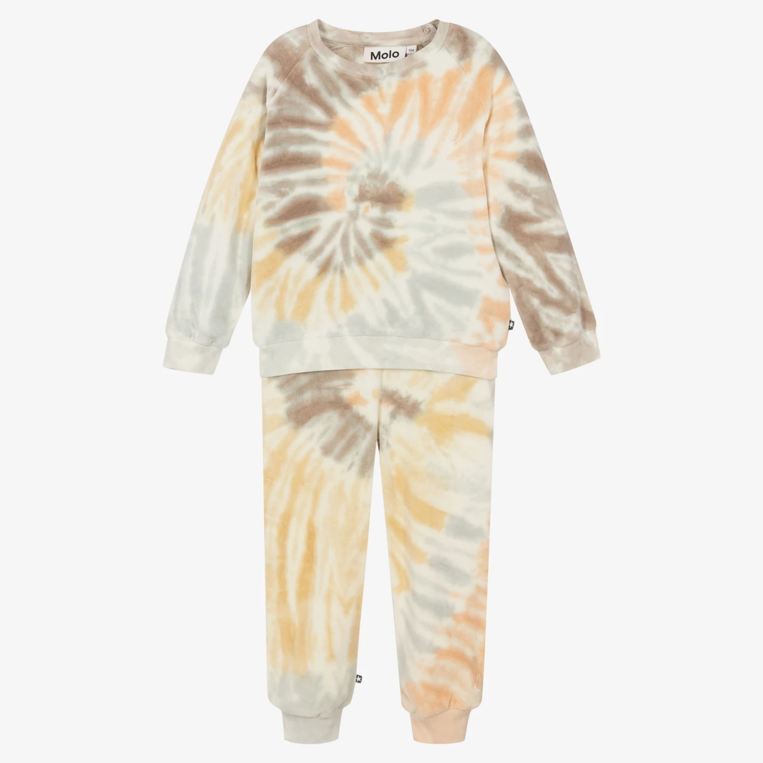 Lovely for lounging, this cosy velour tracksuit is made for boys and girls by Danish brand Molo. Patterned in a pastel, orange, beige and yellow tie-dye print, the screw neck sweatshirt has useful shoulder poppers and the iconic Molo smiling face embroidered on the chest.