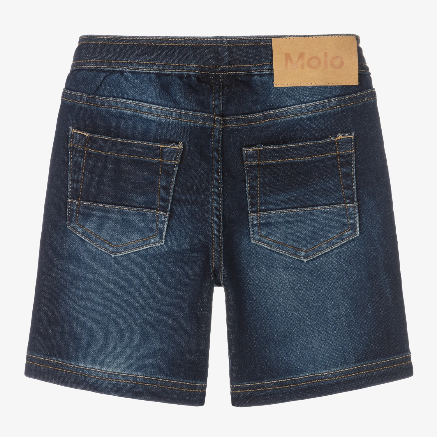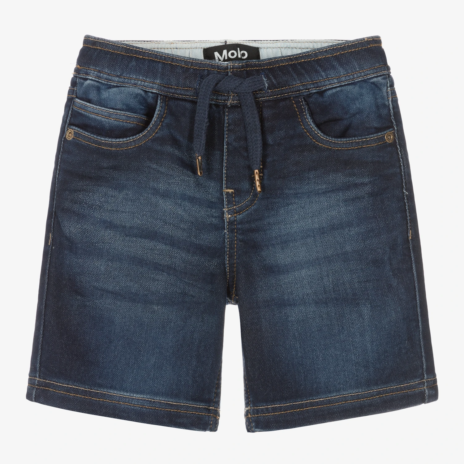 Boys dark blue shorts by Molo, made in soft, stretchy cotton-blend jersey. With the look of denim and the comfort of jersey, these washed and worn-look shorts have classic five pocket styling and a brown embossed logo patch on the back. There is a blue drawstring on the elasticated waist for an adjustable fit.