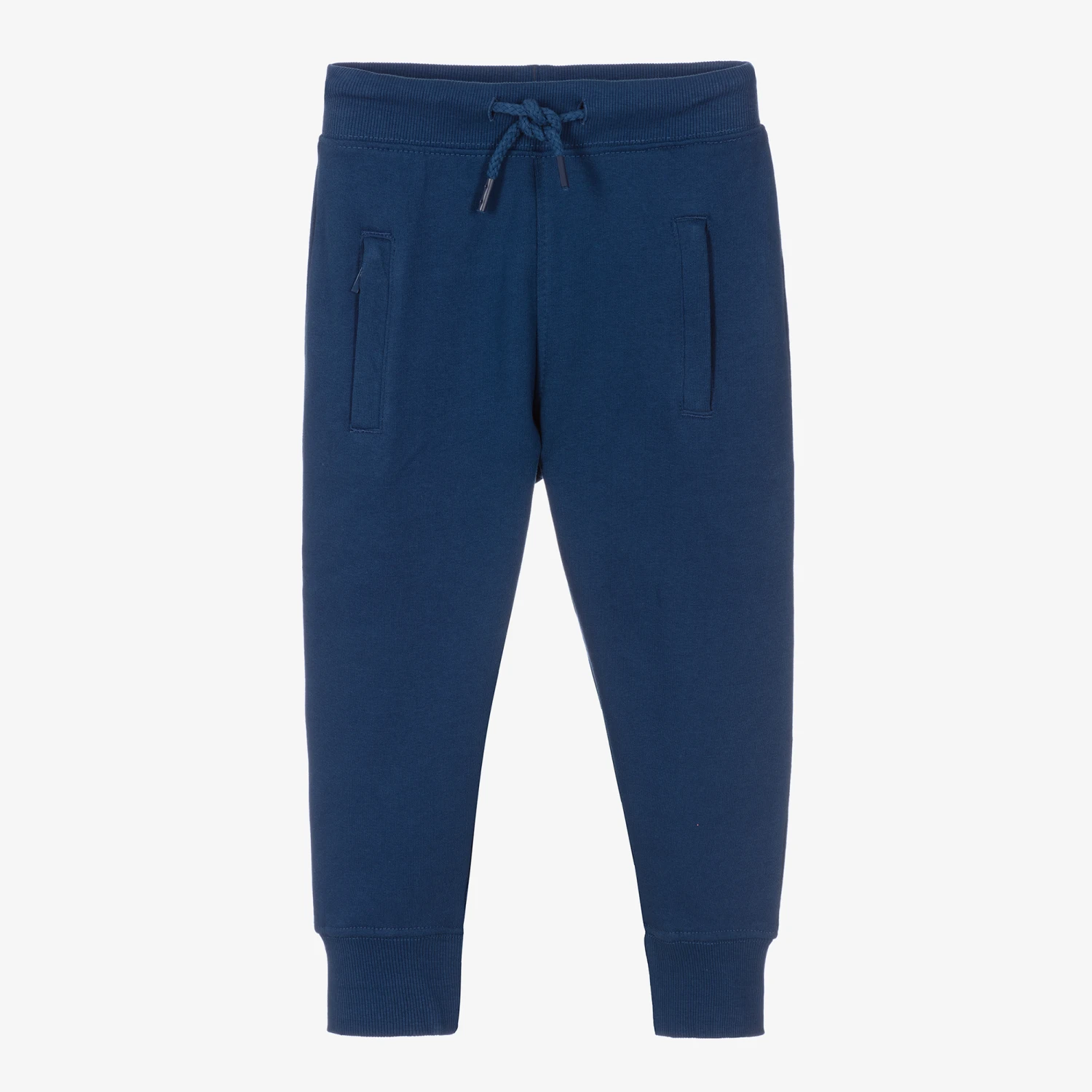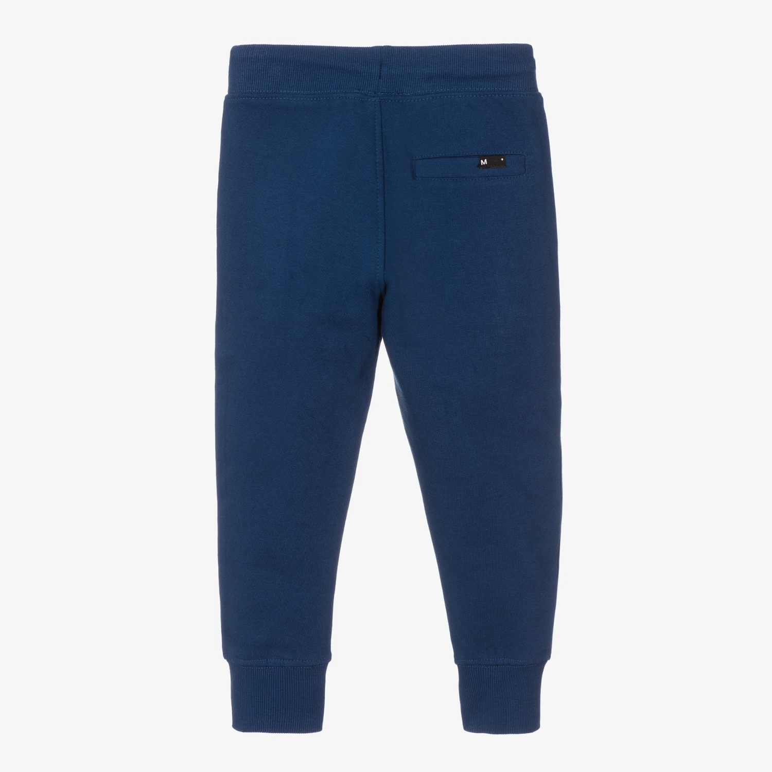 Casual blue joggers for boys by Molo, made in super soft organic cotton jersey. Great for comfortable lounging, they have a stretchy drawstring waist and useful zip fastening front pockets.