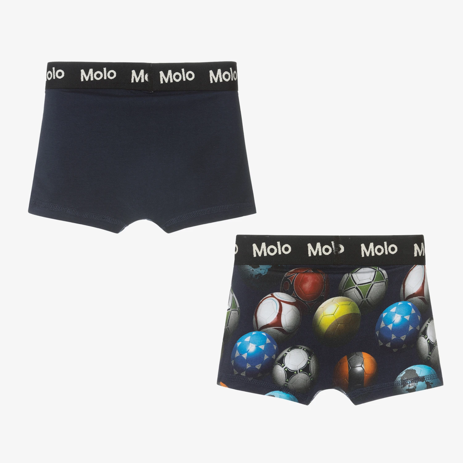 Two pack of organic cotton jersey boxer shorts for boys by Molo. One pair is navy blue and the other has a realistic print of different footballs, both have jacquard logo elasticated waistbands for a comfortable fit.