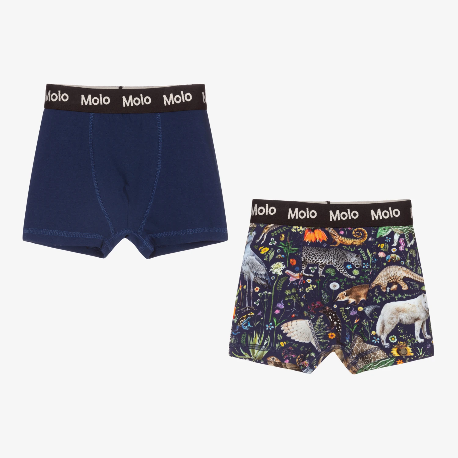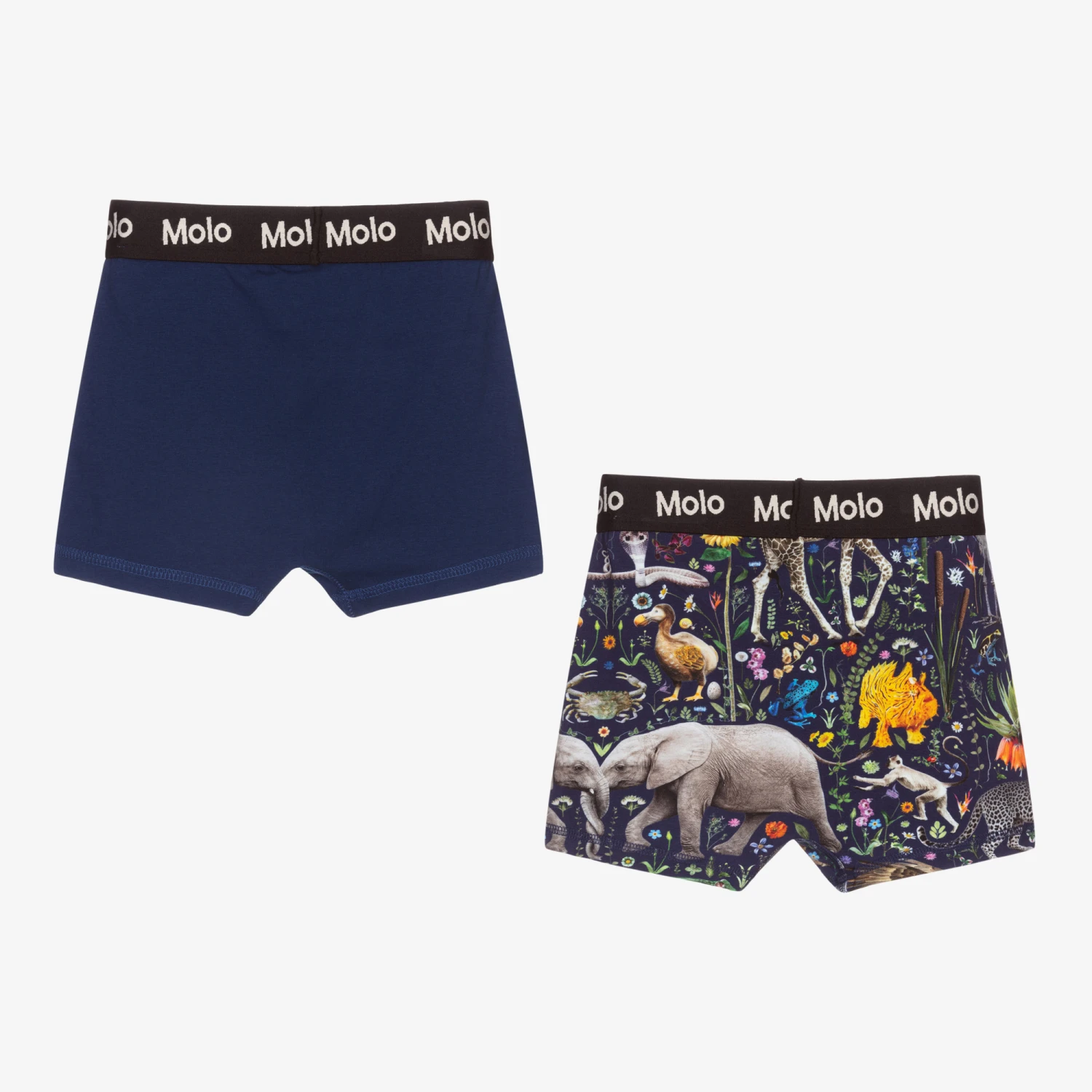 Two pack of navy blue boxers for boys, by Molo, made from soft organic cotton jersey. Featuring a black and white elasticated logo waistband for a comfortable fit, one pair is navy blue and the other pair has a fun all-over print of multicoloured animals and flowers.