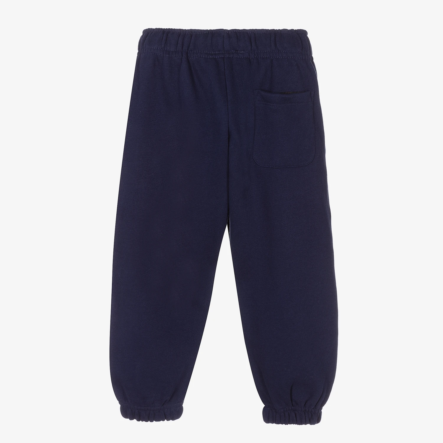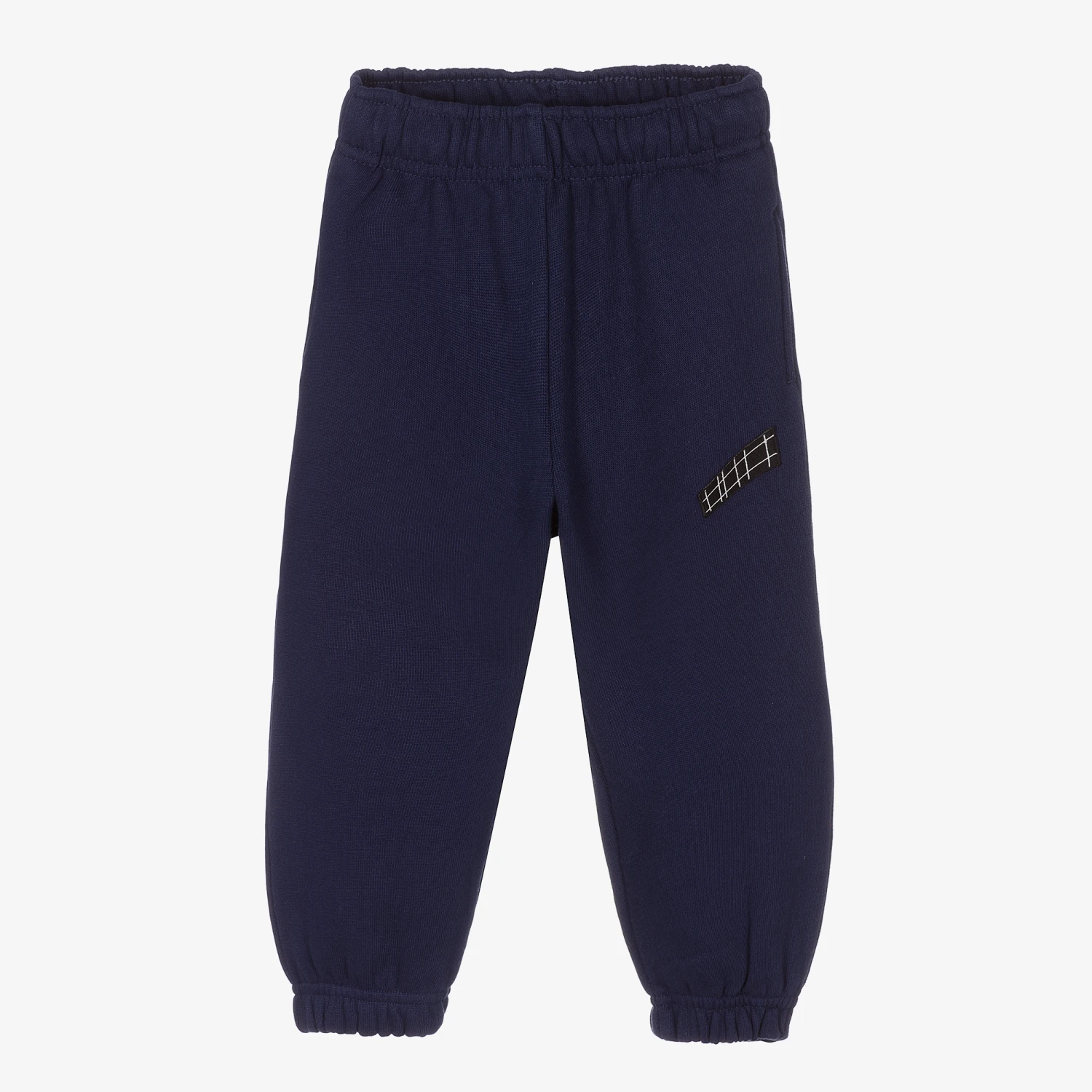 Boys navy blue joggers by Molo, made in mid-weight organic cotton jersey. They have an internal drawstring waist for comfort, three handy pockets, and a black and white grid patch on the front.