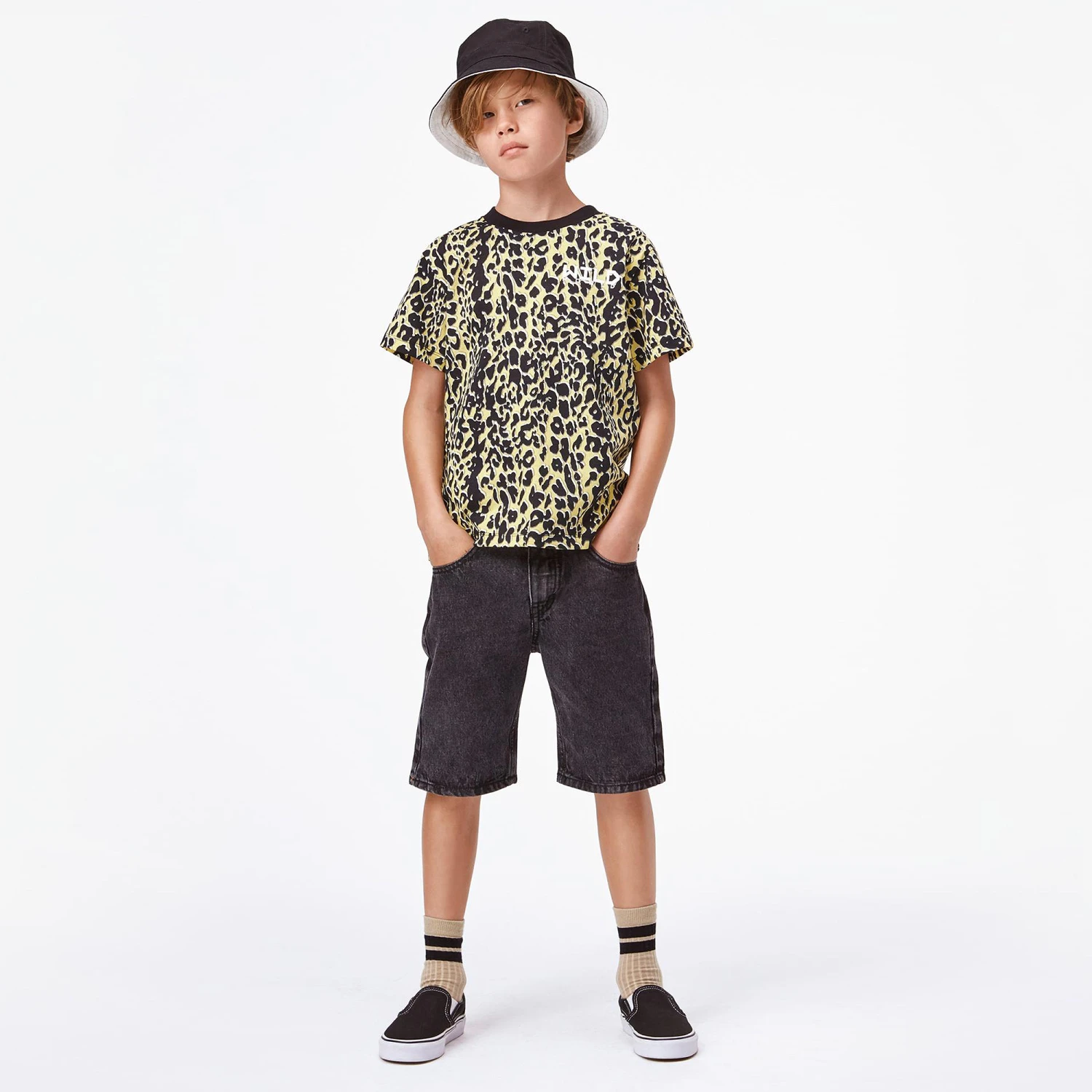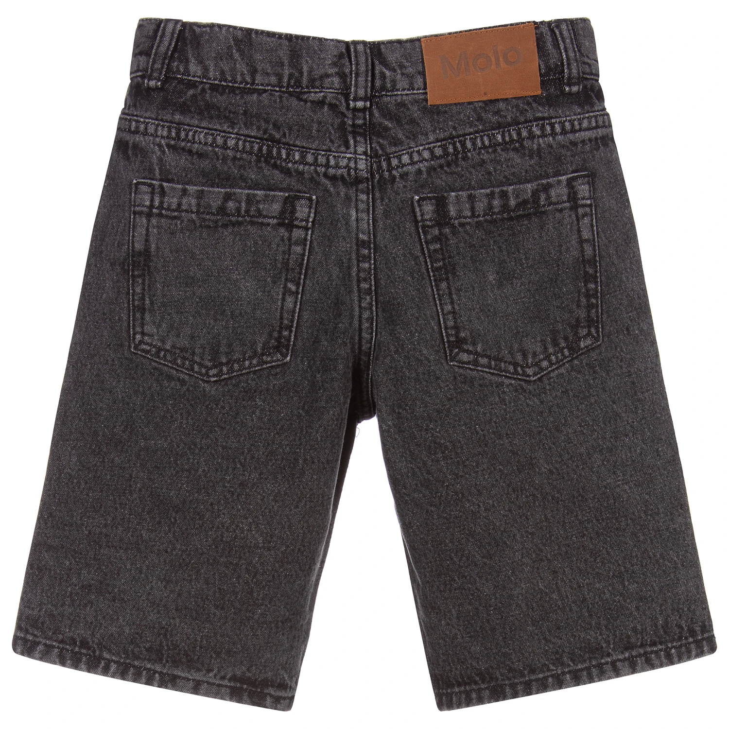 Washed black, Bermuda length, denim shorts for boys by Molo. They have a useful adjustable waist, with a popper and zip to fasten