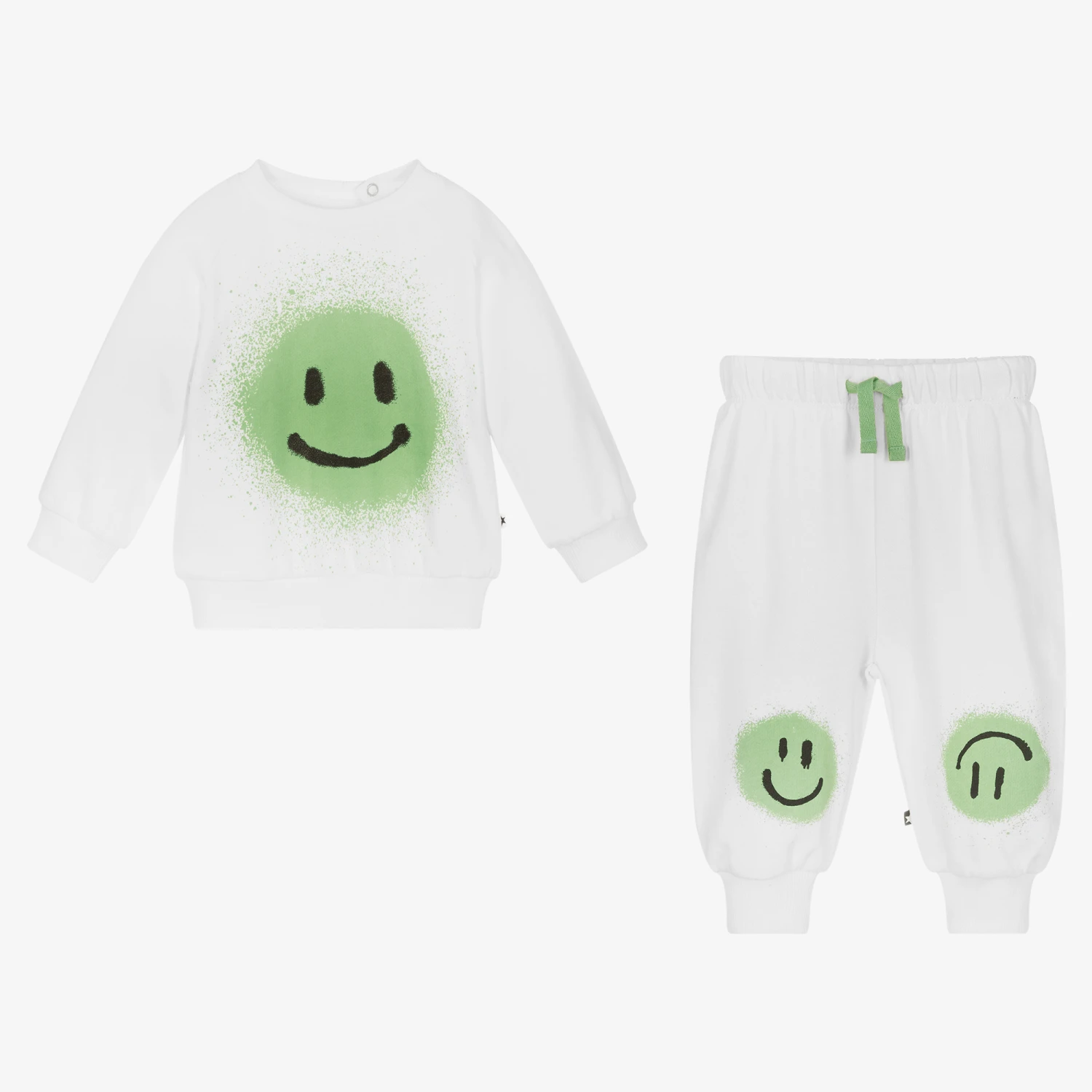 Super cute off-white tracksuit for younger boys and girls by Molo. Both pieces are printed with matching green and black happy faces. Comfortable and casual, they are made in organic cotton jersey with ribbed trims and little logo tabs on the sides. The sweatshirt fastens with poppers on the back for easy pull-over. The joggers are cuffed on the legs for extra cosiness and have a drawstring waistband for an adjustable fit.