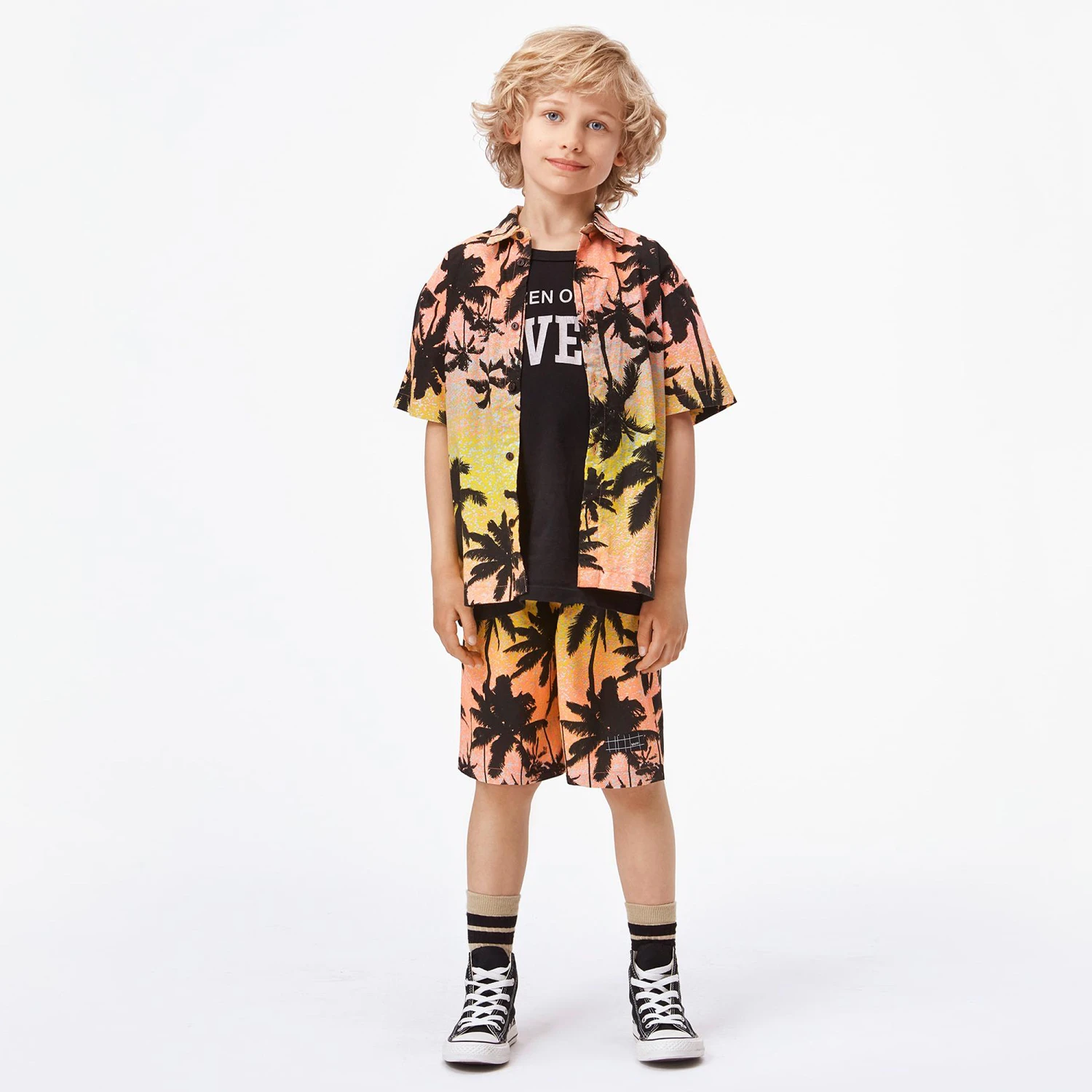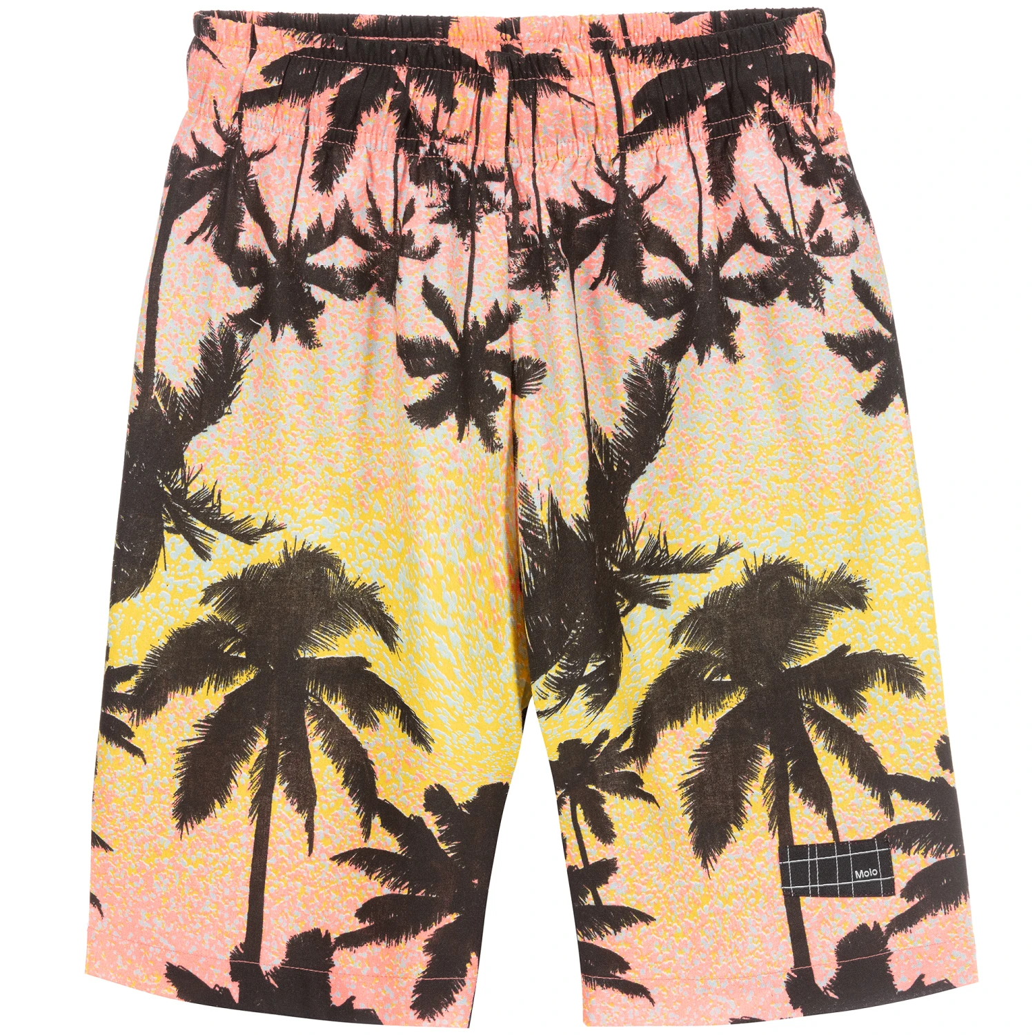 Boys sunset palm print Bermuda length shorts by Molo. In shades of red, pink and yellow, with a black silhouette palm print, they are made in lightweight cotton and have an internal adjustable waistband.