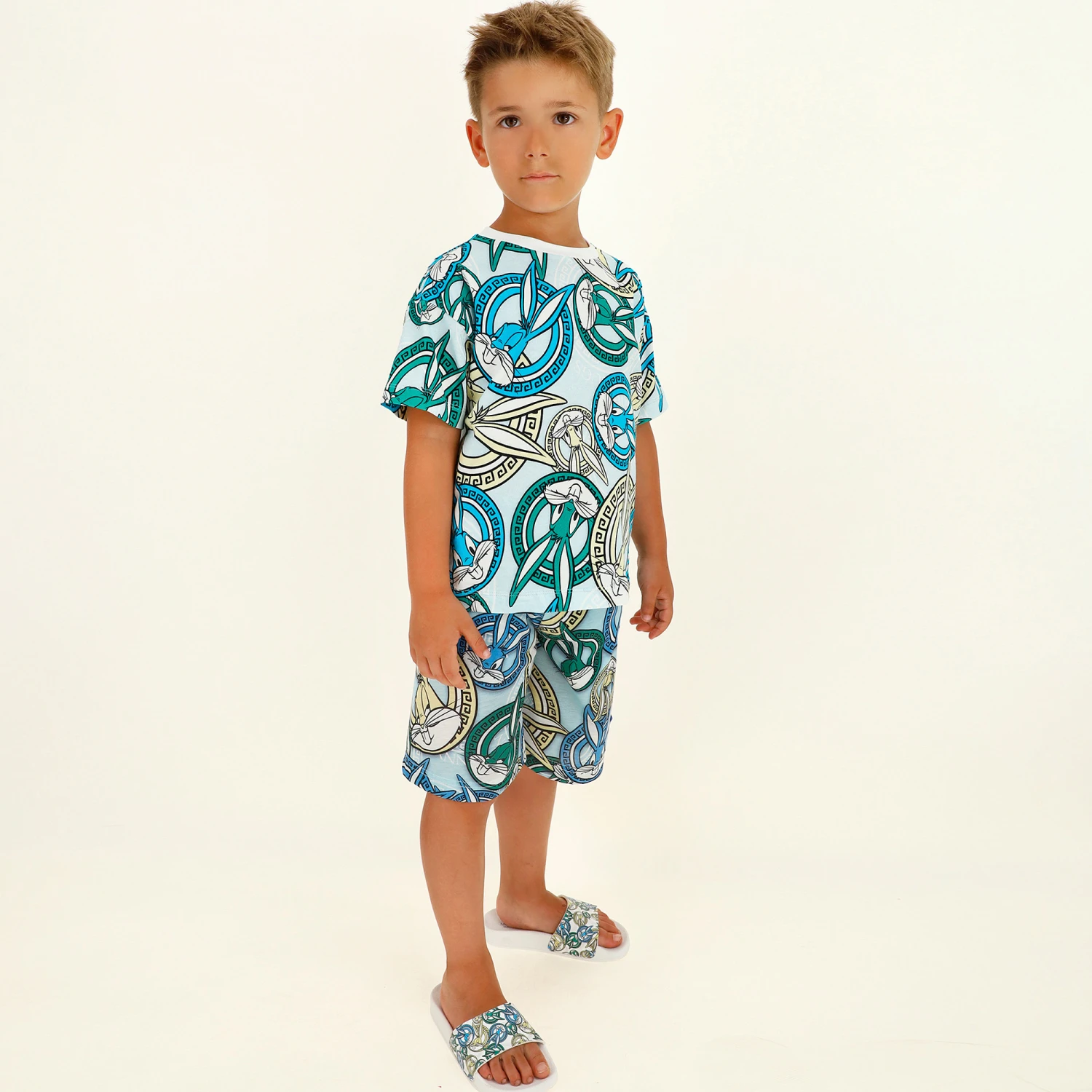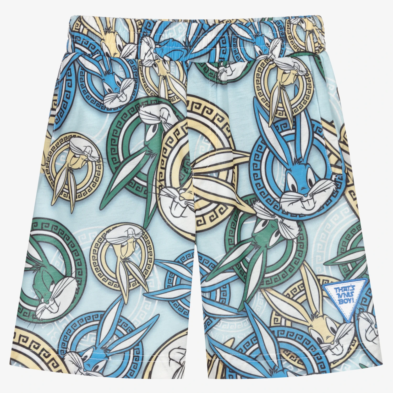 Pale blue shorts for boys by Italian designer Monnalisa, patterned with Bugs Bunny in blue, yellow and green, with Greek key detailing. Made in comfortable cotton jersey, they have a comfortable, elasticated waistband and side pockets.