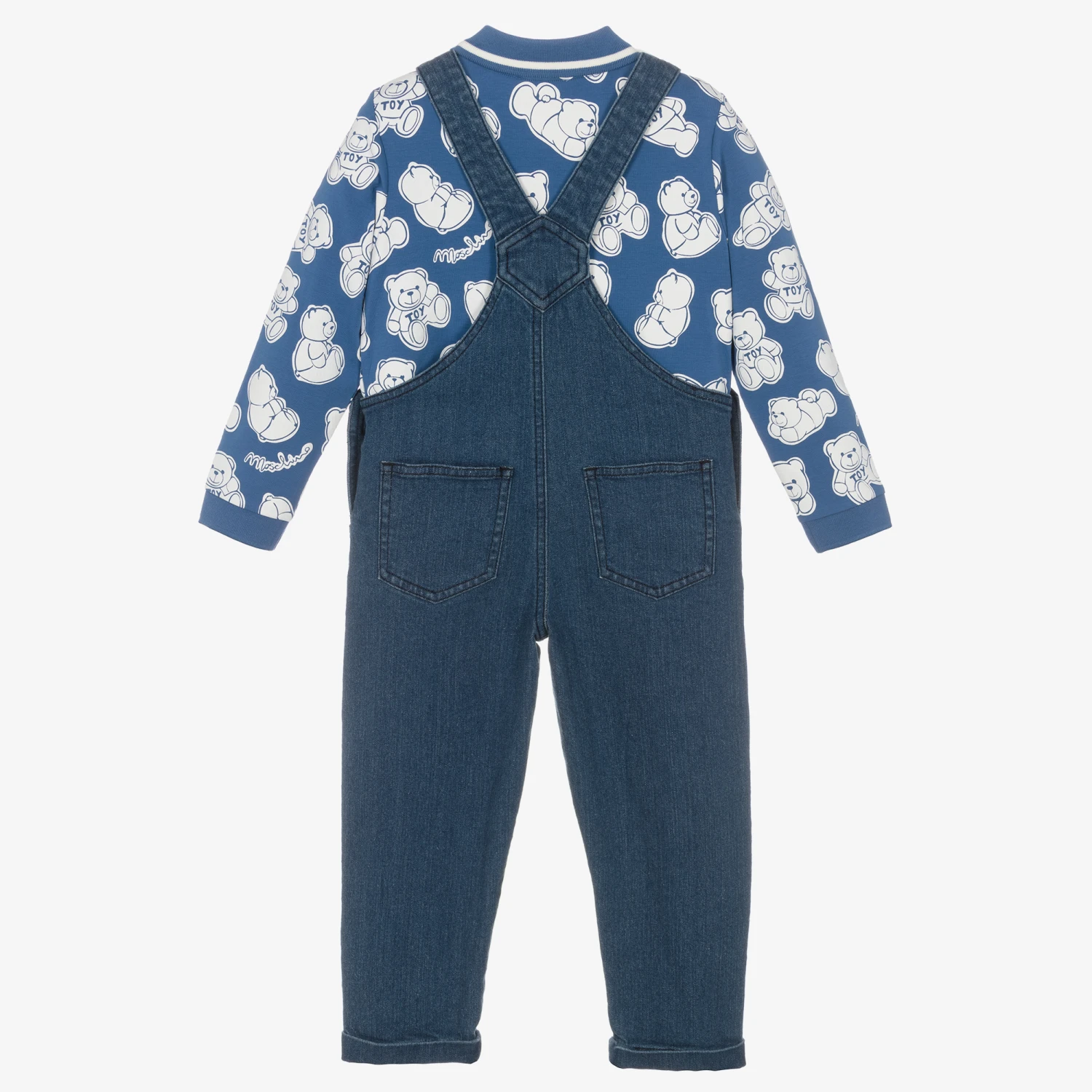 Blue cotton dungaree set for little boys by Italian brand Moschino Baby. The blue and white long-sleeved polo shirt has a smart ribbed collar, front button fastenings and the label’s iconic Moschino Teddy Logo prints. Made in soft denim with stretch, the dungarees have shoulder straps with branded popper fastenings for an adjustable fit, turned-up cuffs and matching Teddy Bear logo graphics on the bib pocket.