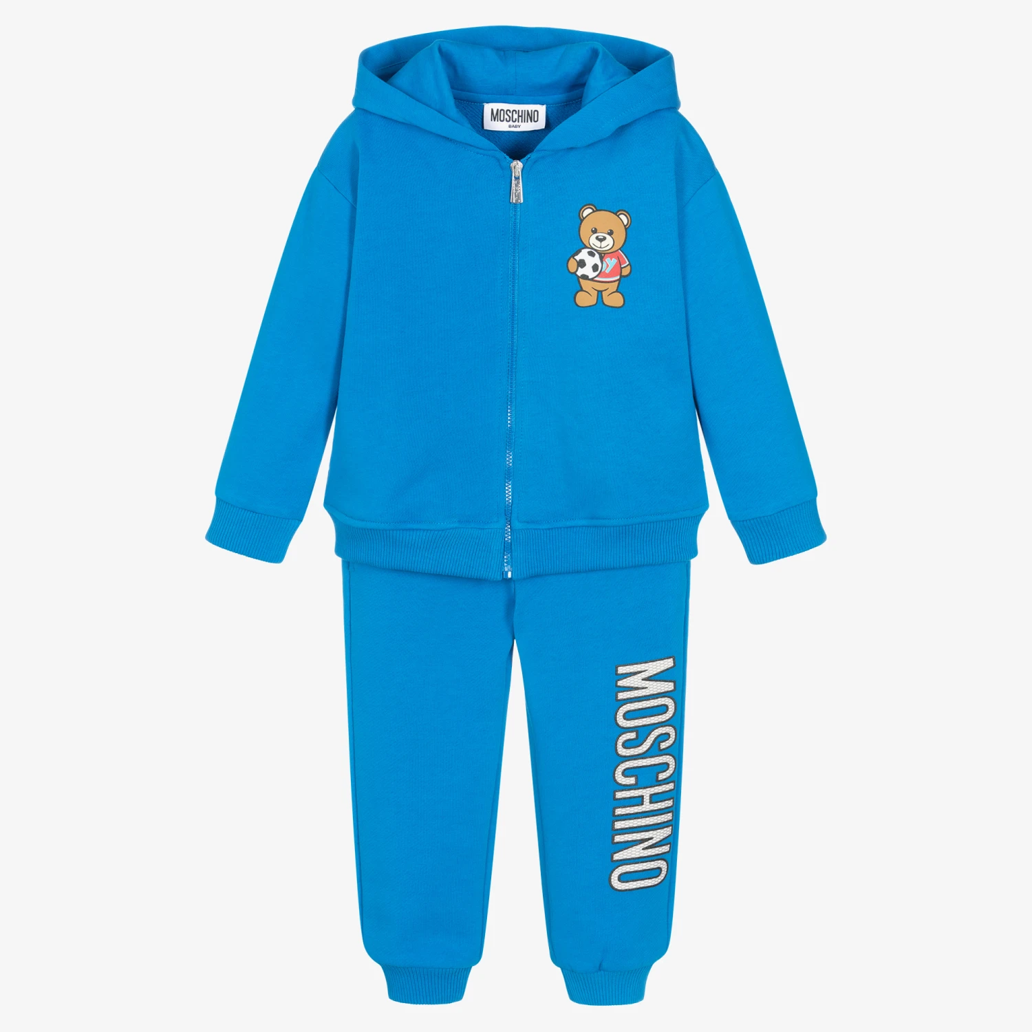 Casual cobalt blue tracksuit for little boys, by Moschino Baby. Made in soft cotton sweatshirt jersey, the zip-up hoodie has a Moschino Teddy Bear print on the chest, holding a fun football. The back is printed with a spell-out grid logo, designed to look like a football net, and has a logo-embossed front zip fastening for a discreet designer detail. It pairs with matching joggers to complete the sporty look.