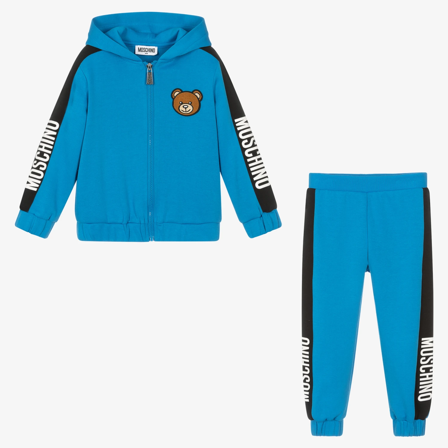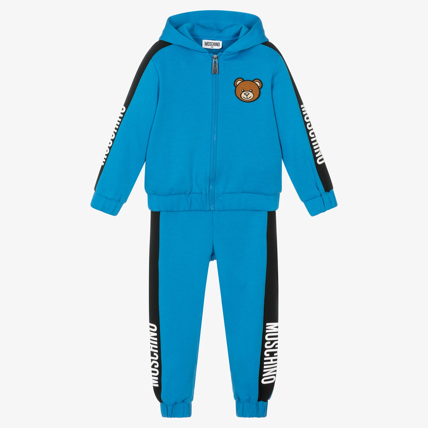 Designed by Moschino Kid-Teen, a blue tracksuit for boys and girls. Made in soft and stretchy cotton-blend jersey, both pieces feature black and white logo tape trims. The hooded top has the Italian label’s iconic Moschino Teddy bear logo appliqué in soft bouclé, a branded zip fastening and concealed side pockets. The cuffed joggers have an elasticated waist, gentle on little tummies.