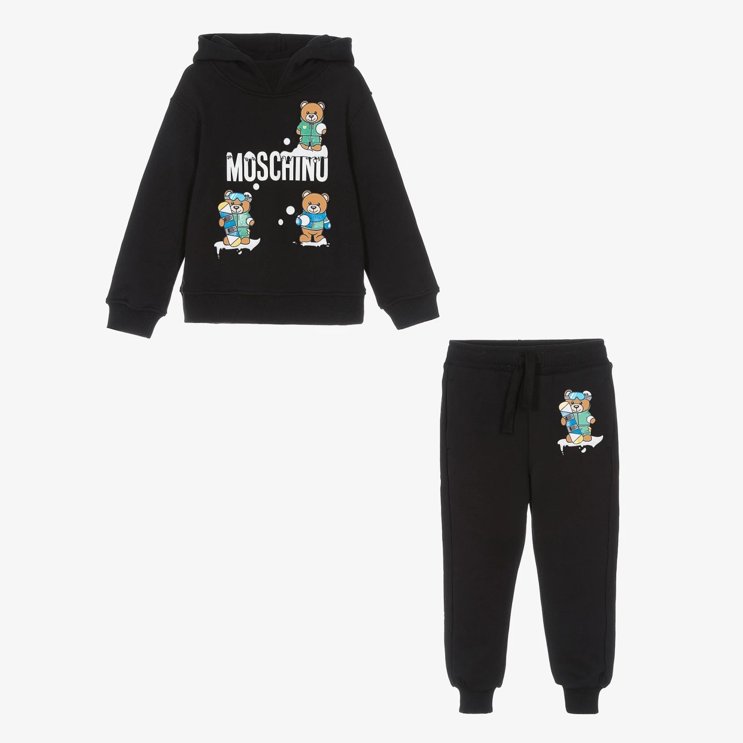 Black cotton tracksuit for boys by luxury Italian brand Moschino Kid-Teen. Both the hoodie and joggers have a festive print of the designer’s signature Teddy Bears and a white logo. Just right for relaxed days, the tracksuit is made in comfortable jersey with cosy ribbed trims. The joggers have useful, concealed side pockets, a back pocket and a drawstring waistband for a good fit.
