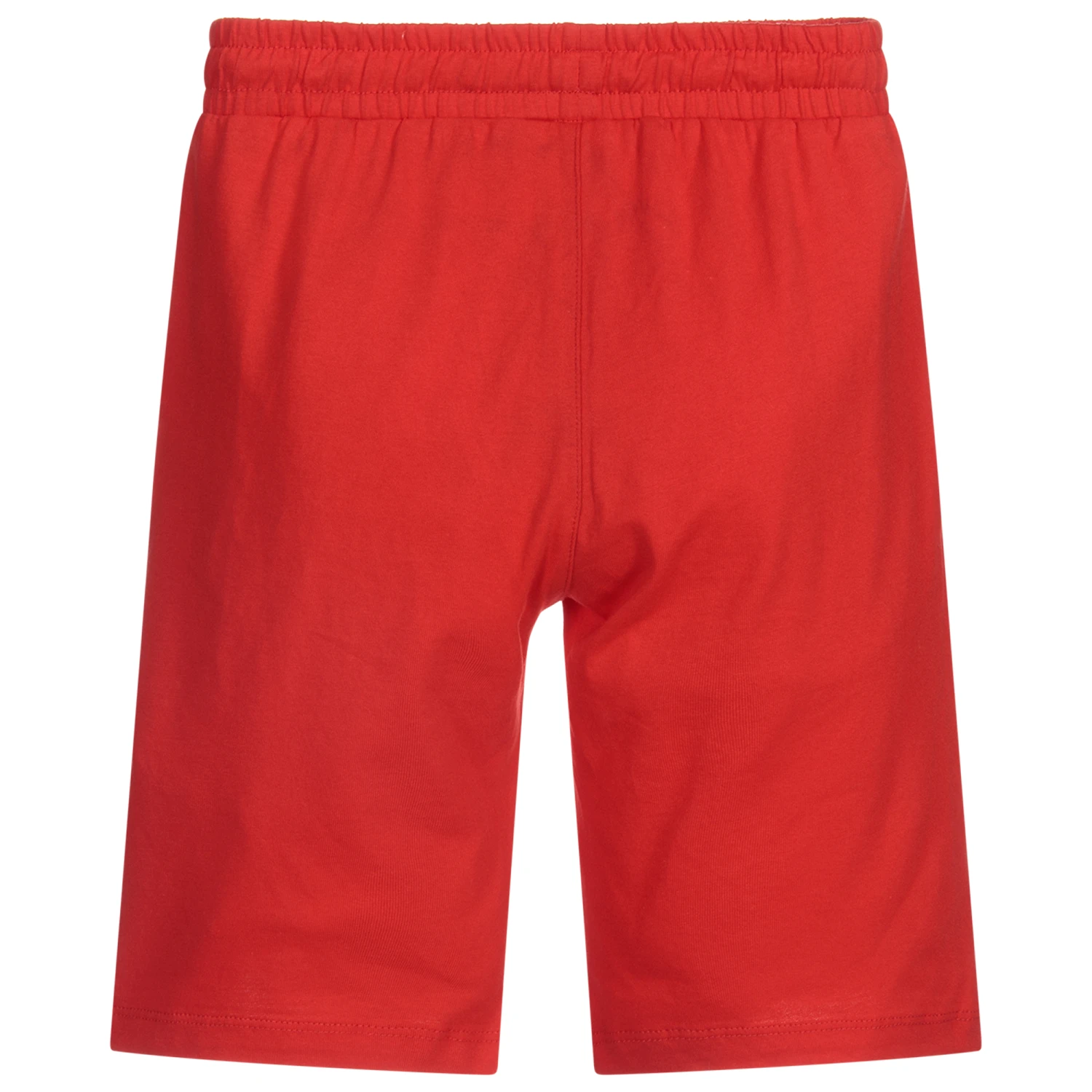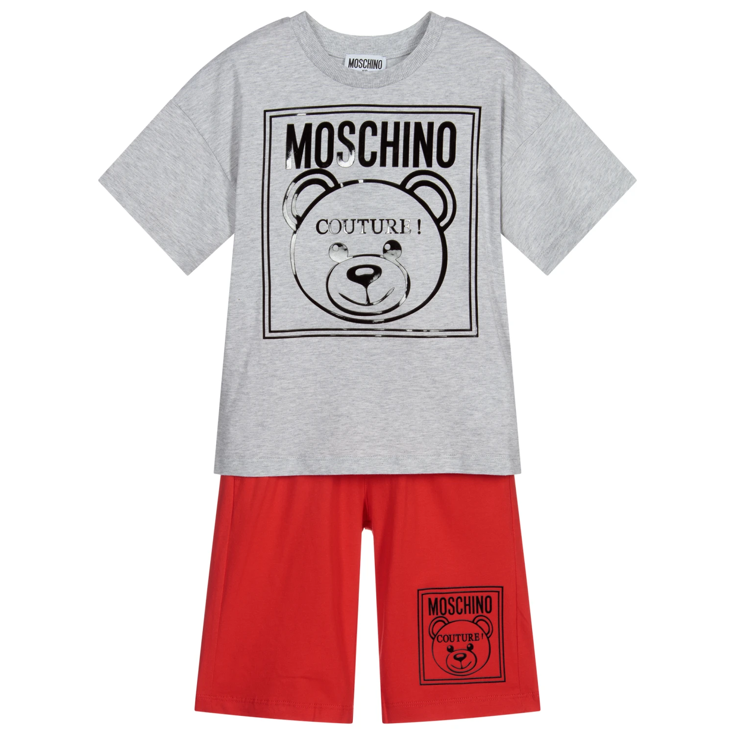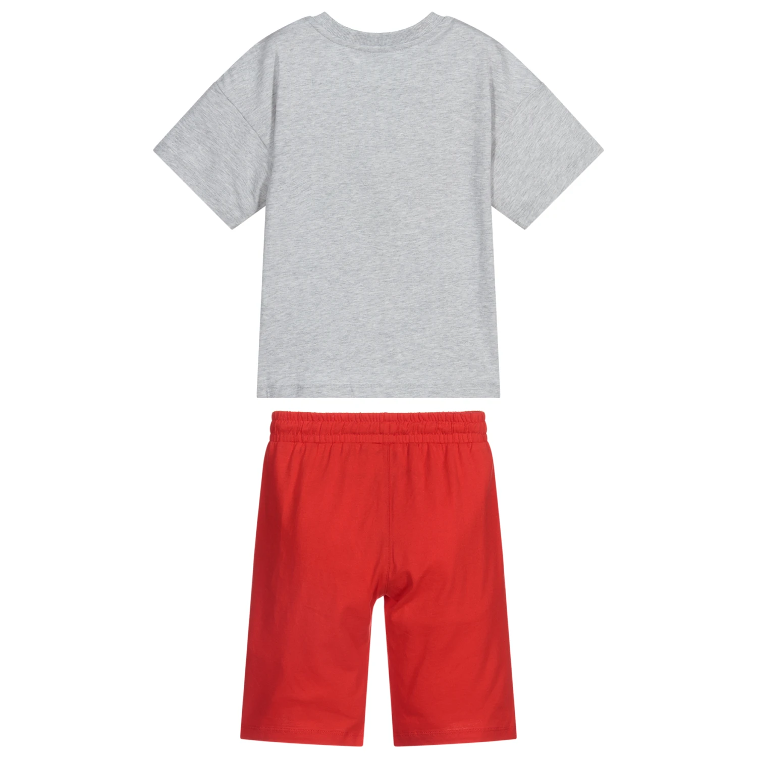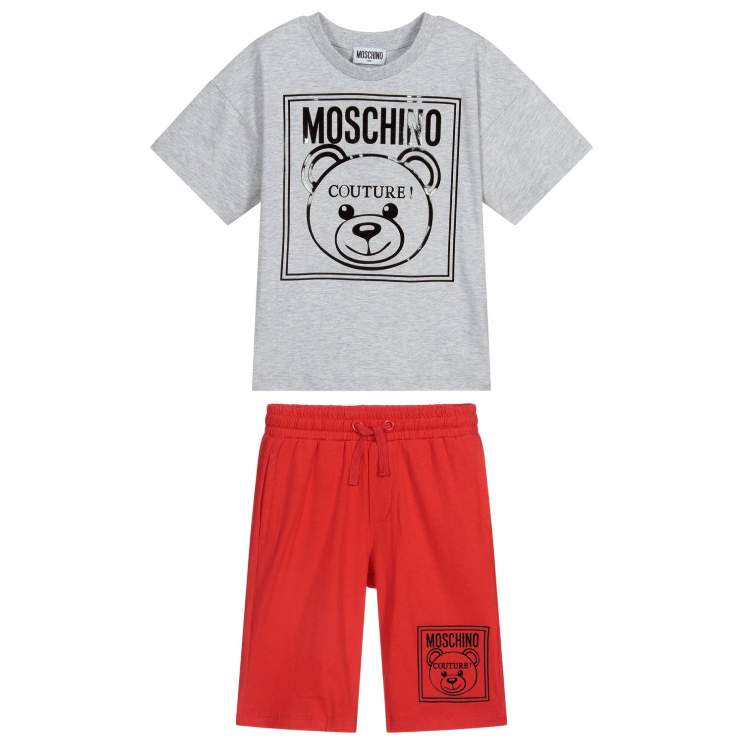 Boys grey top and red shorts set by Moschino Kid-Teen, made in soft cotton jersey. The shorts have an elasticated drawstring waist and both pieces have a black rubberised Moschino Couture Teddy Bear logo.