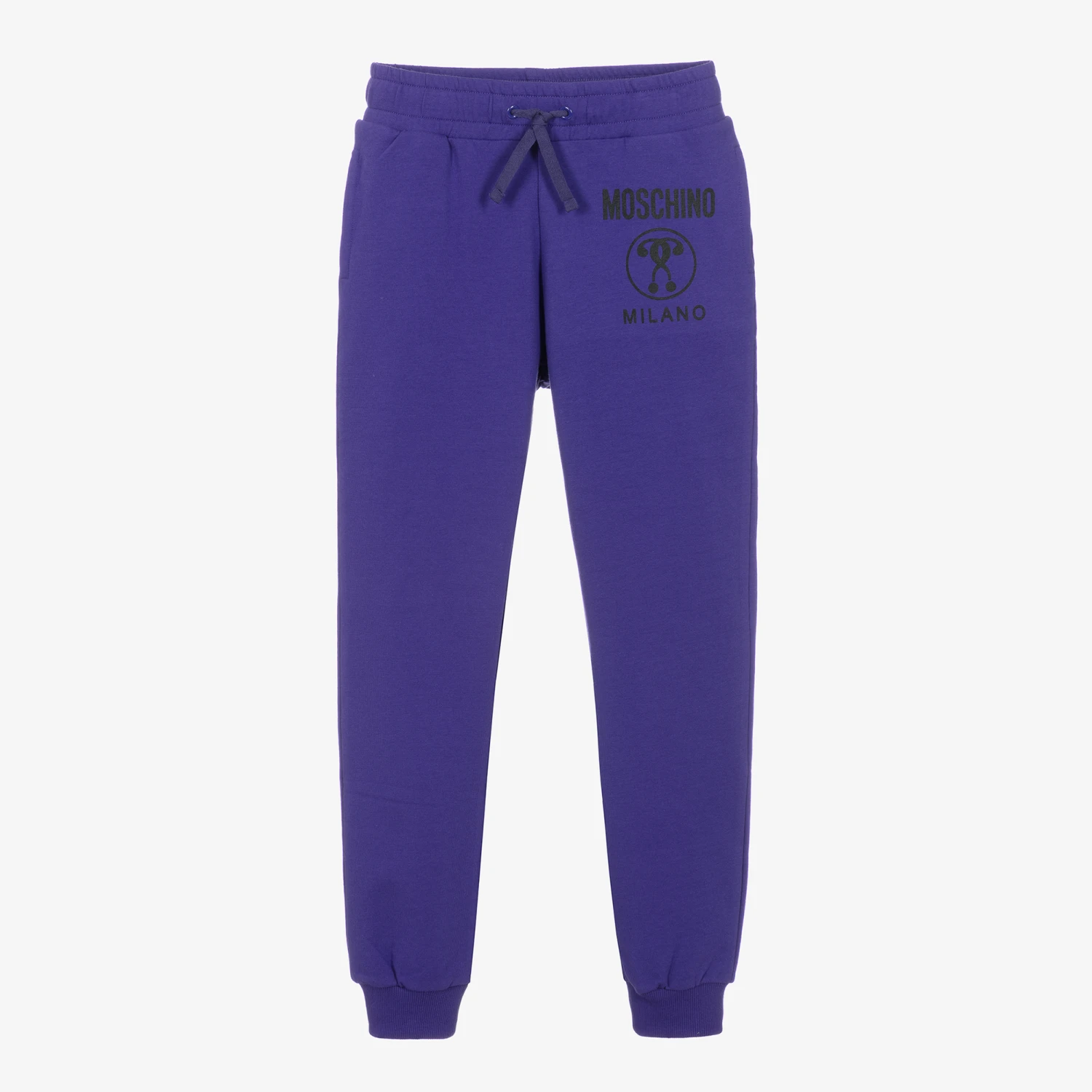 Purple cotton joggers for boys and girls by luxury Italian brand Moschino Kid-Teen, with the designer’s black Double Question Mark logo printed on one side. Made in comfortable jersey with a war, fleecy inside, they have a useful, drawstring waist for a good fit, concealed side pockets and cosy, ribbed cuffs.