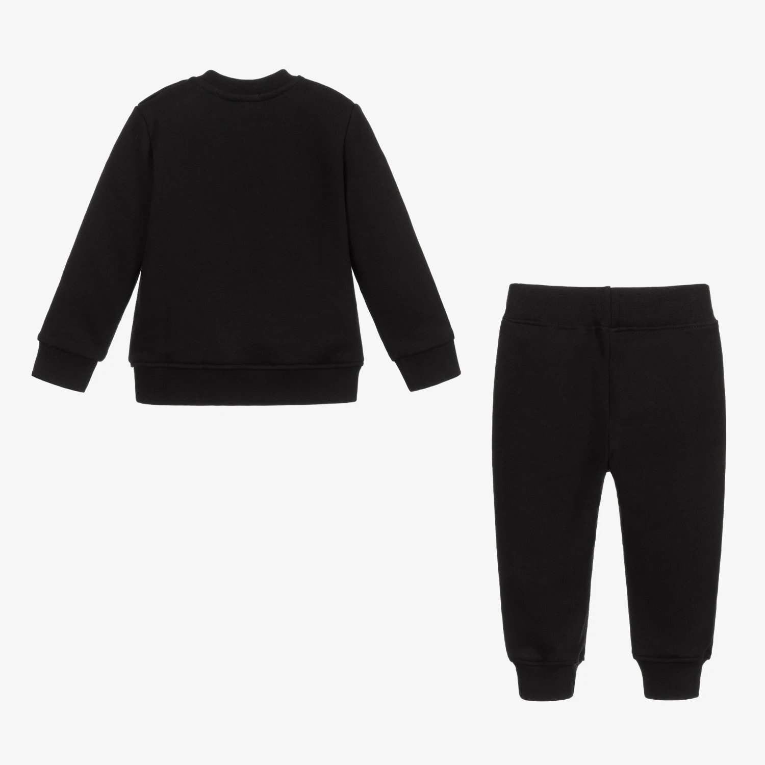 Black tracksuit for little boys and girls by MSGM, with the brand’s white logo on the front of the top and on one leg. It is made in comfortable, mid-weight cotton jersey with a cosy, fleecy inside and ribbed trims. The top has useful popper fastenings on one shoulder.