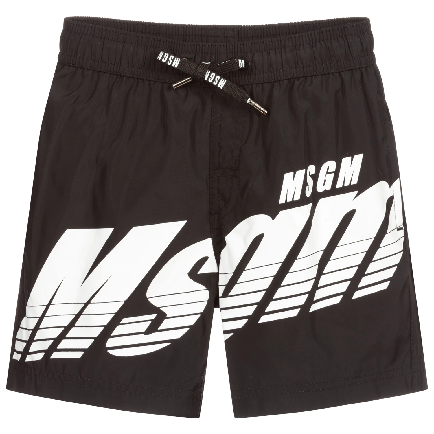 Black swim shorts for boys by MSGM, with bold white logo prints across the front. Lightweight and silky with a soft mesh lining, they have a branded drawstring tie and useful side pockets. There is an embroidered logo patch on the back.
