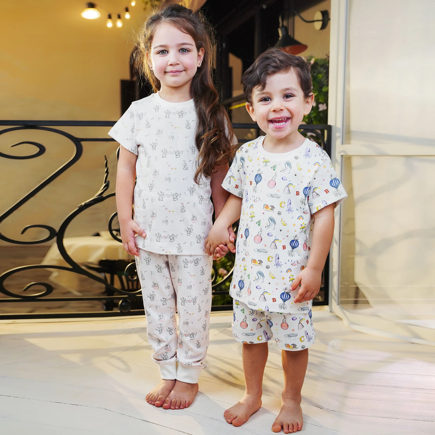 Boys & girls white shorts pyjamas by My Little Pie, with a multicoloured alphabet Imaginarium design. Beautifully soft against the skin, they are made in Supima cotton jersey. They have short sleeves, a gently elasticated waistband and the care details are printed, so there are no scratchy labels.