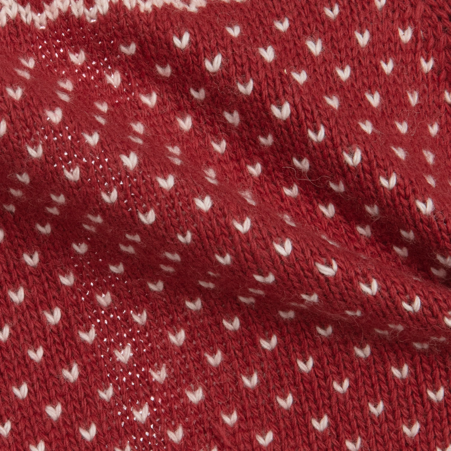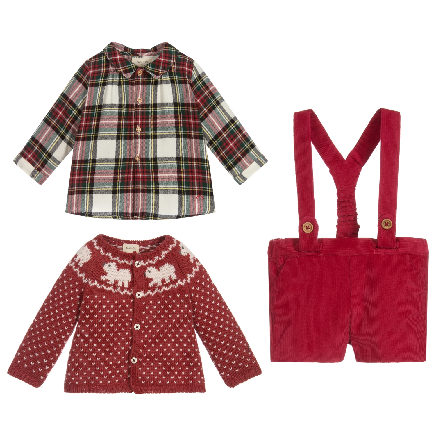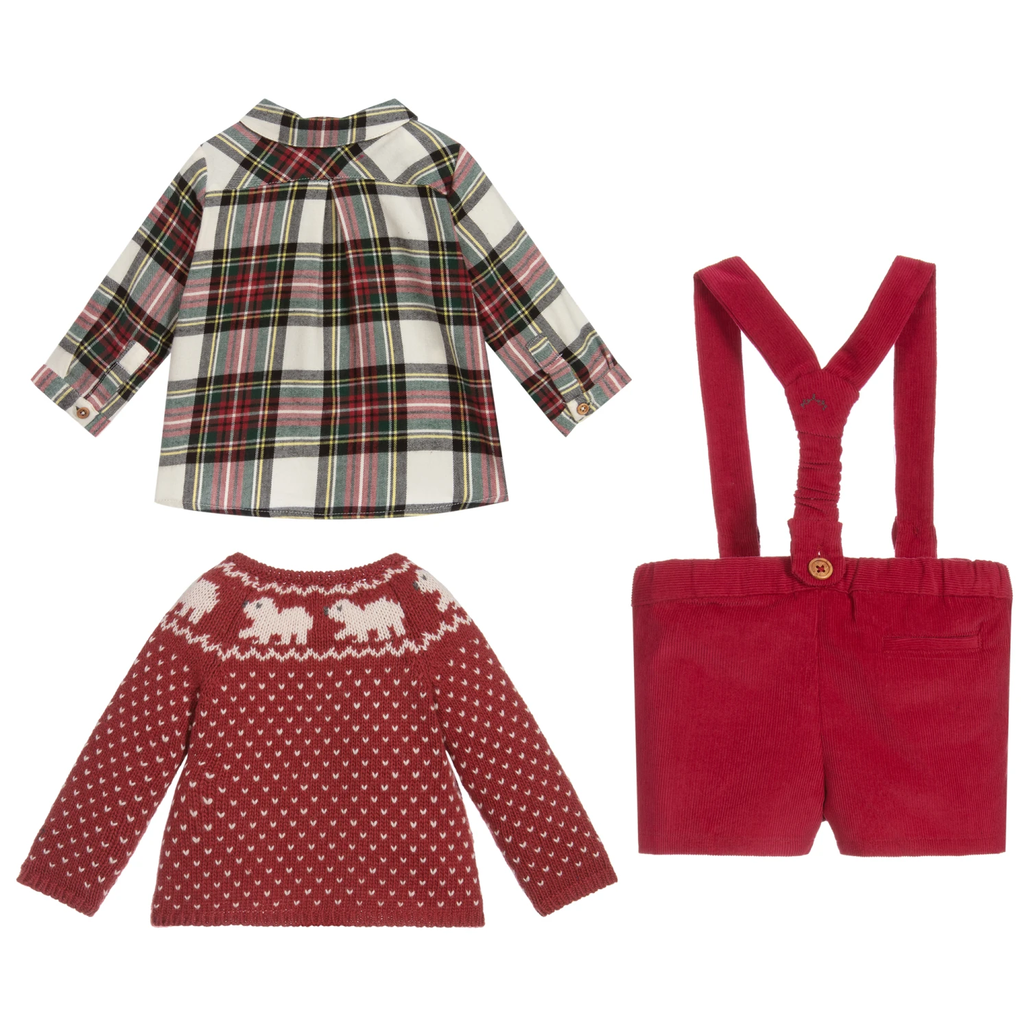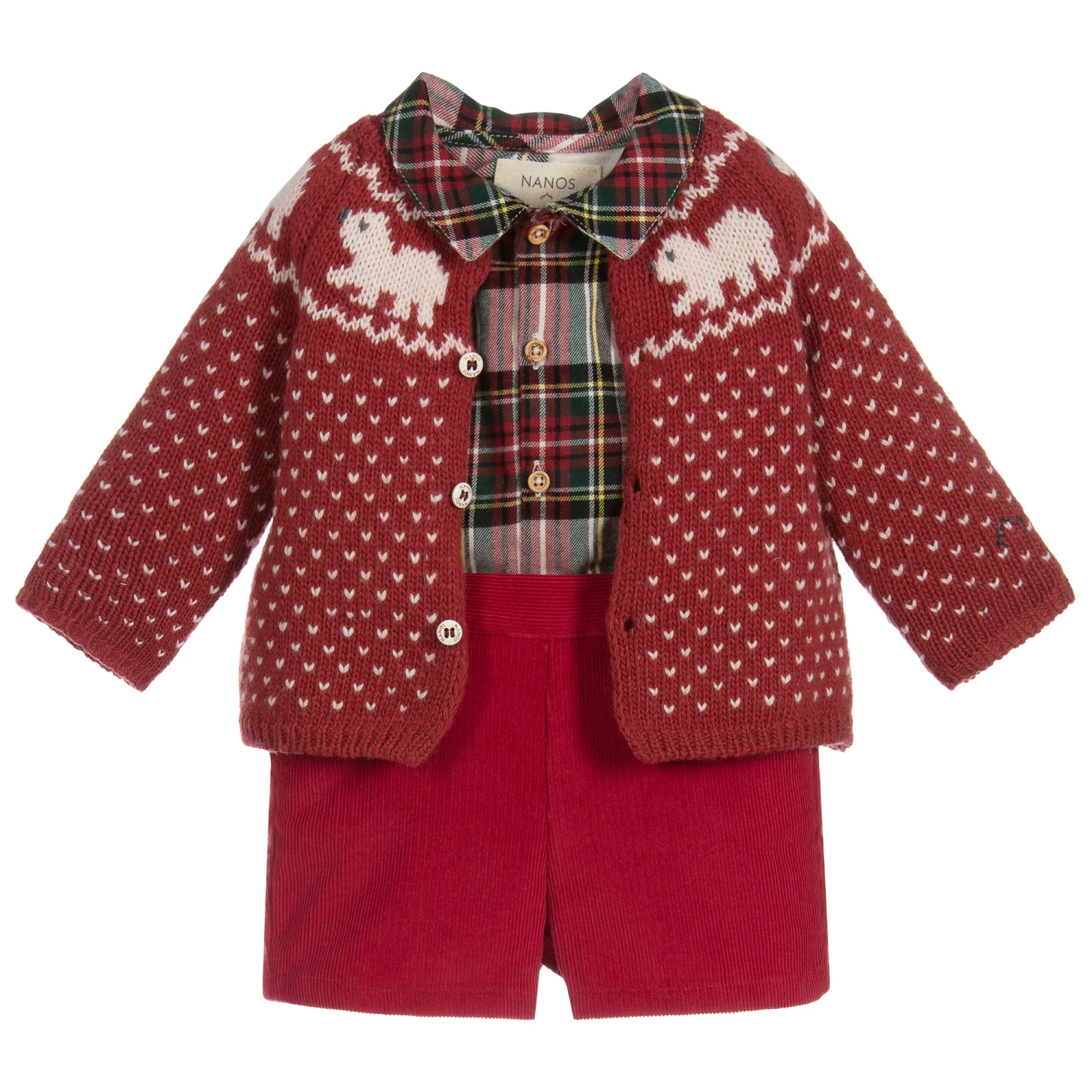 Sweet three-piece shorts set for little boys by Nanos. The red shorts are made in soft cotton corduroy, with button fastening braces. The ivory, red and green tartan shirt is made in soft flannel, with button fastenings. The red cardigan is knitted in a soft cotton and wool blend, with an interwoven ivory pattern.