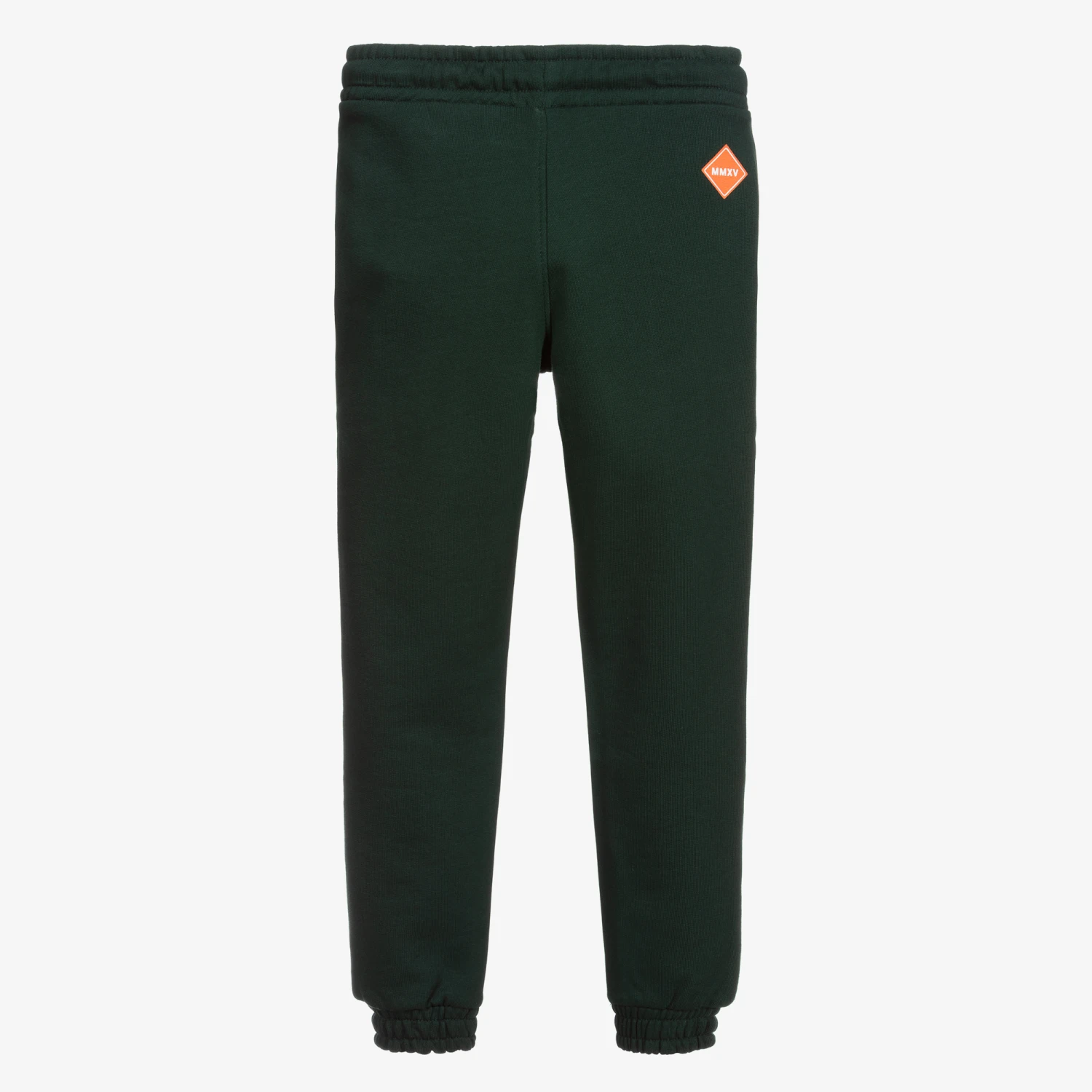 Dark green joggers for boys by NIK&NIK, made with midweight cotton jersey. Soft and comfortable, these trousers have orange contrast graphic logo prints on the front and the back. They have an elasticated waist and cuffs, two front pockets, and a drawstring fastening.
