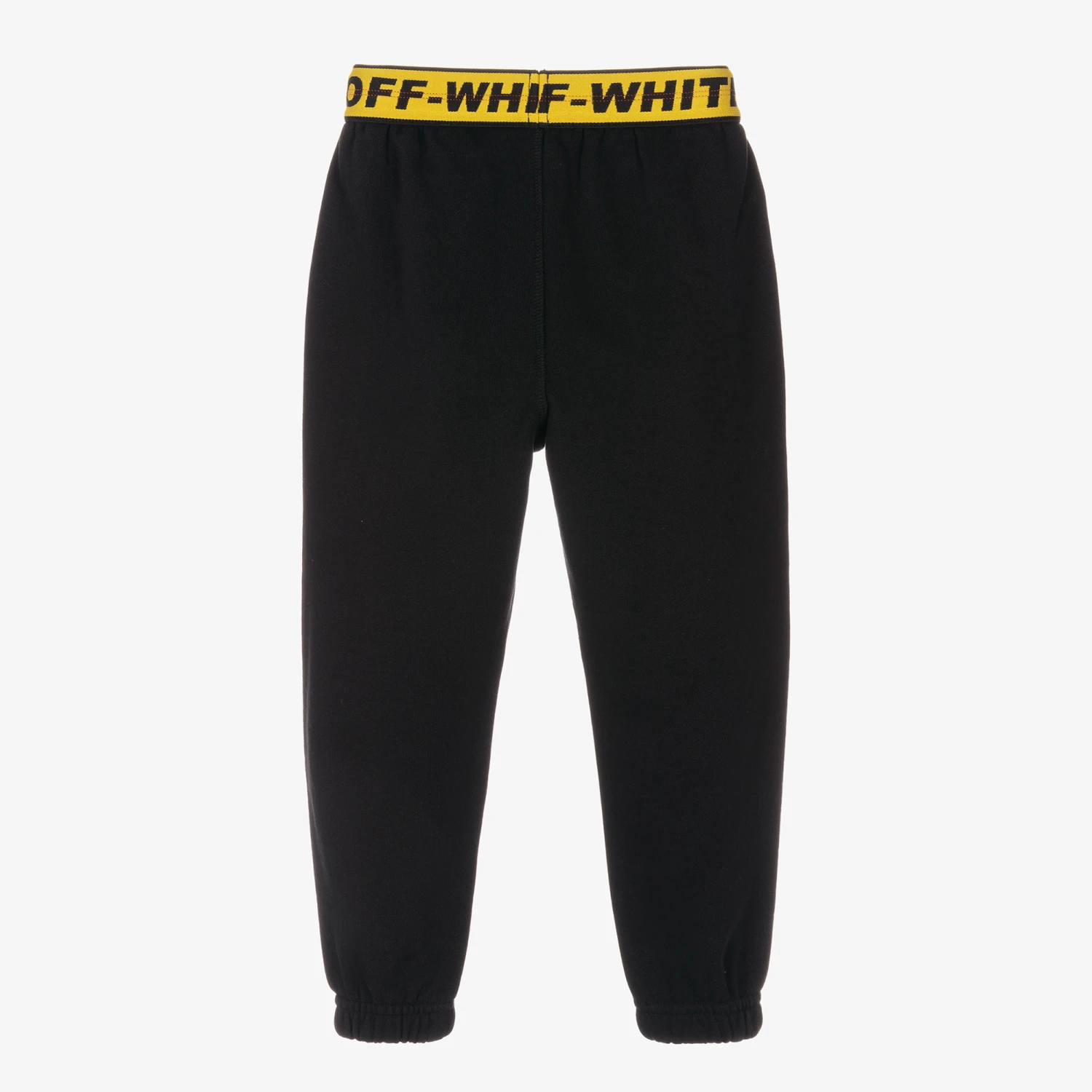 Streetwear-inspired black joggers for boys and girls by luxury brand Off-White, in an effortlessly cool, laid-back vibe. Made in soft organic cotton jersey, this easy-to-wear style has a minimalist white logo print on one leg and side seam pockets. The striking black and yellow Industrial logo taping can be seen on the elasticated waist, finishing the look with instant designer appeal.