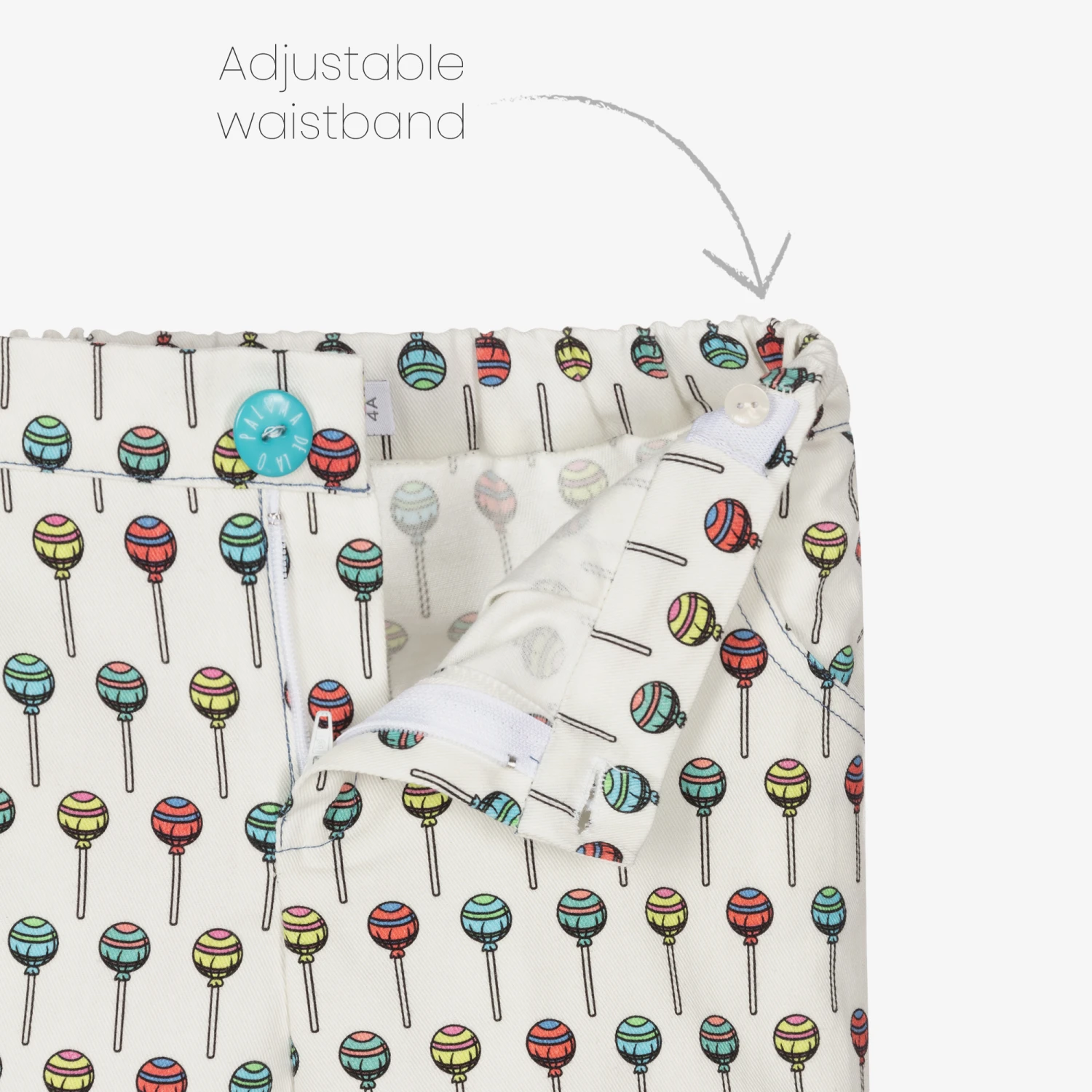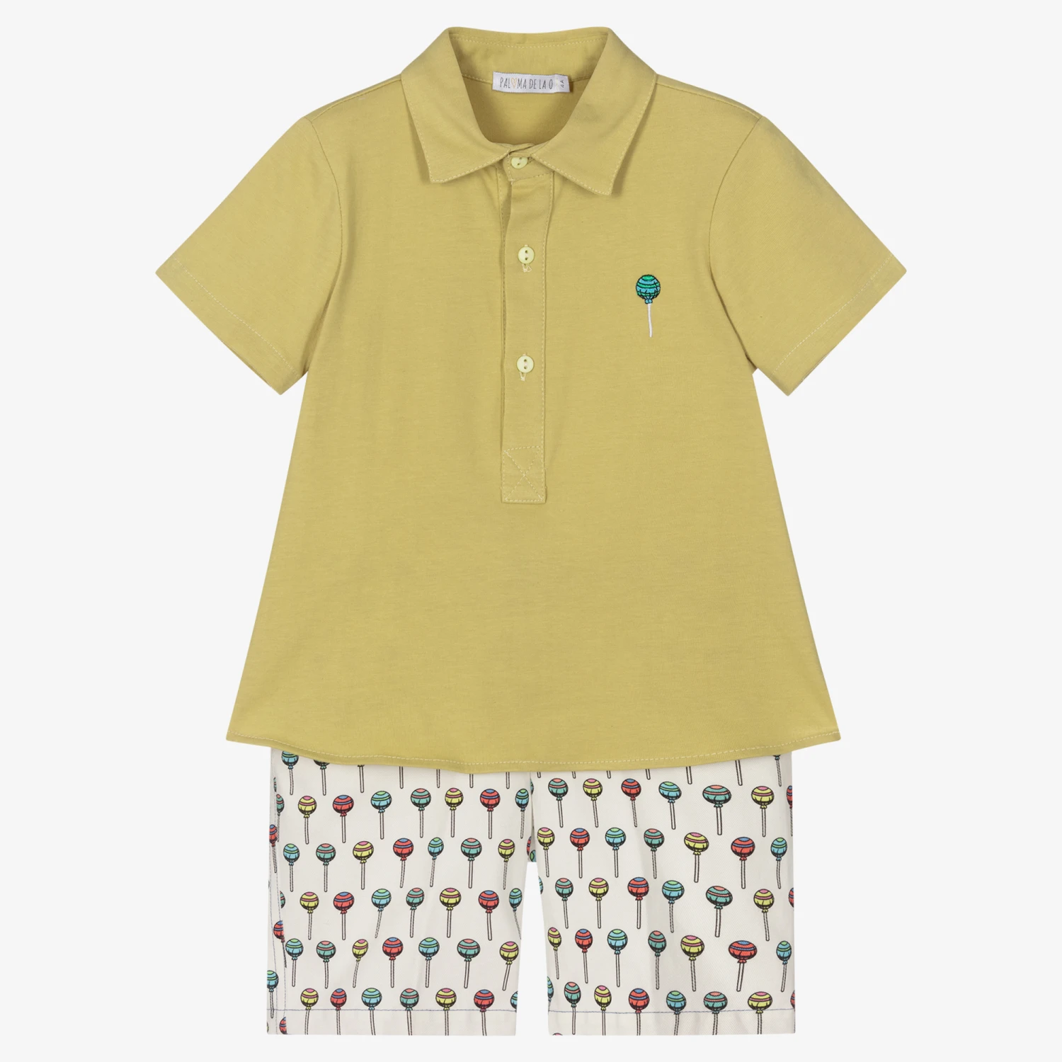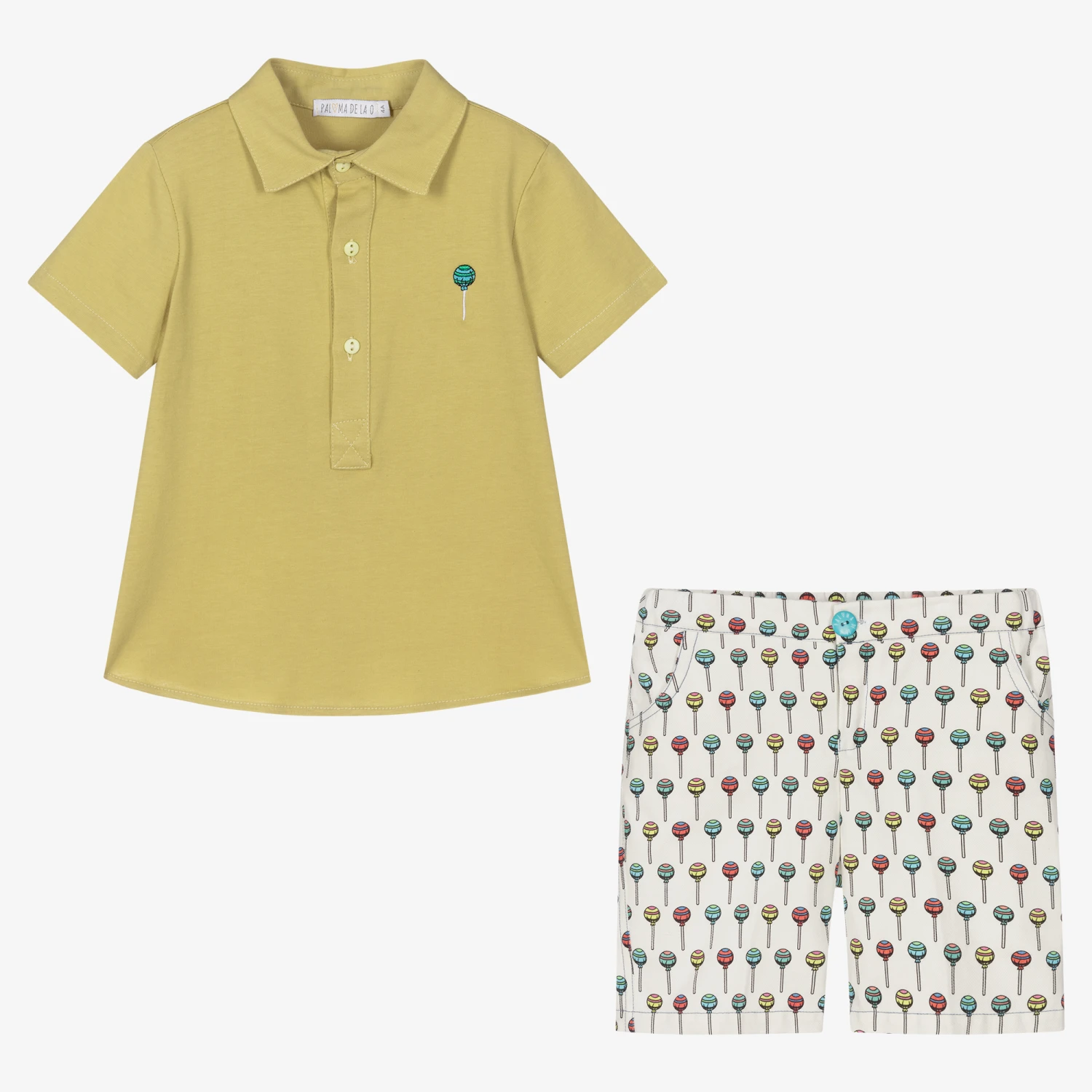 Green and ivory shorts set for boys by Paloma de la O. Made in soft cotton jersey, the green polo shirt has a sweet embroidered balloon on the front, and a smart pointed collar. It pairs with ivory shorts with a fun, colourful balloon pattern all-over, to complete the casual look.
