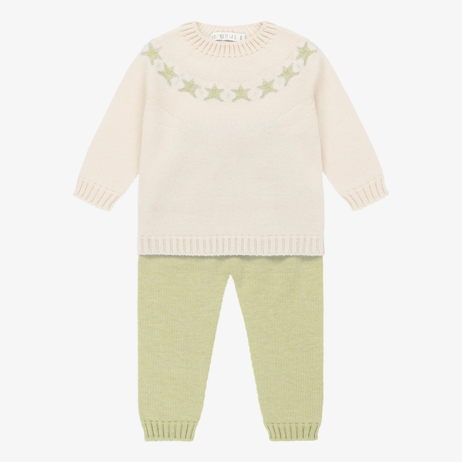 Ivory sweater and green trouser set by Paloma de la O. Suitable for boys and girls, the jumper has a jacquard green stars pattern and is knitted in a soft wool blend. The matching trousers have a stretchy waistband and ribbed ankles.