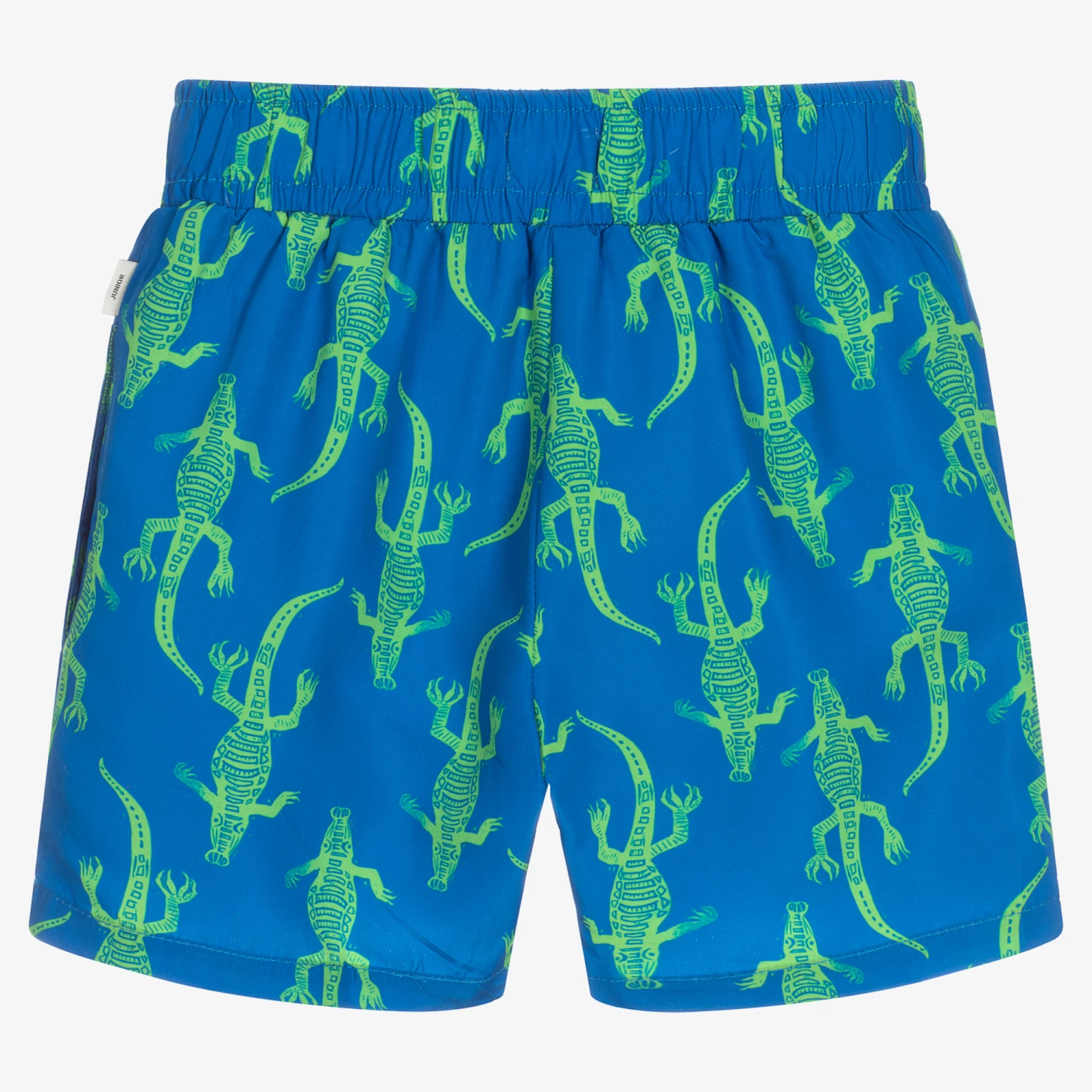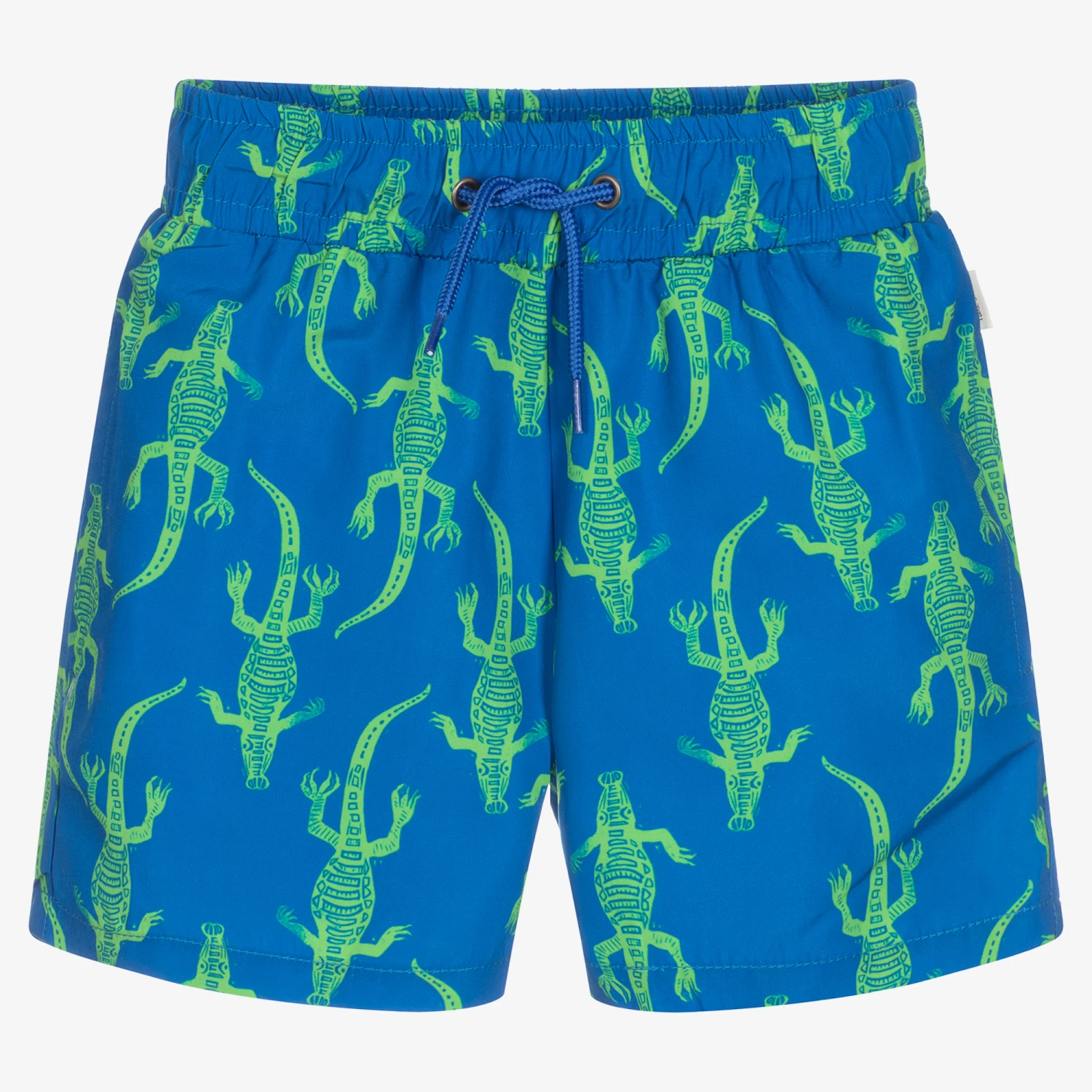 Boys blue Mini-me swim shorts by Paul Smith Junior, made in smooth polyester. They are patterned with a green crocodile print. There are side pockets, a mesh lining and an adjustable drawstring waistband.