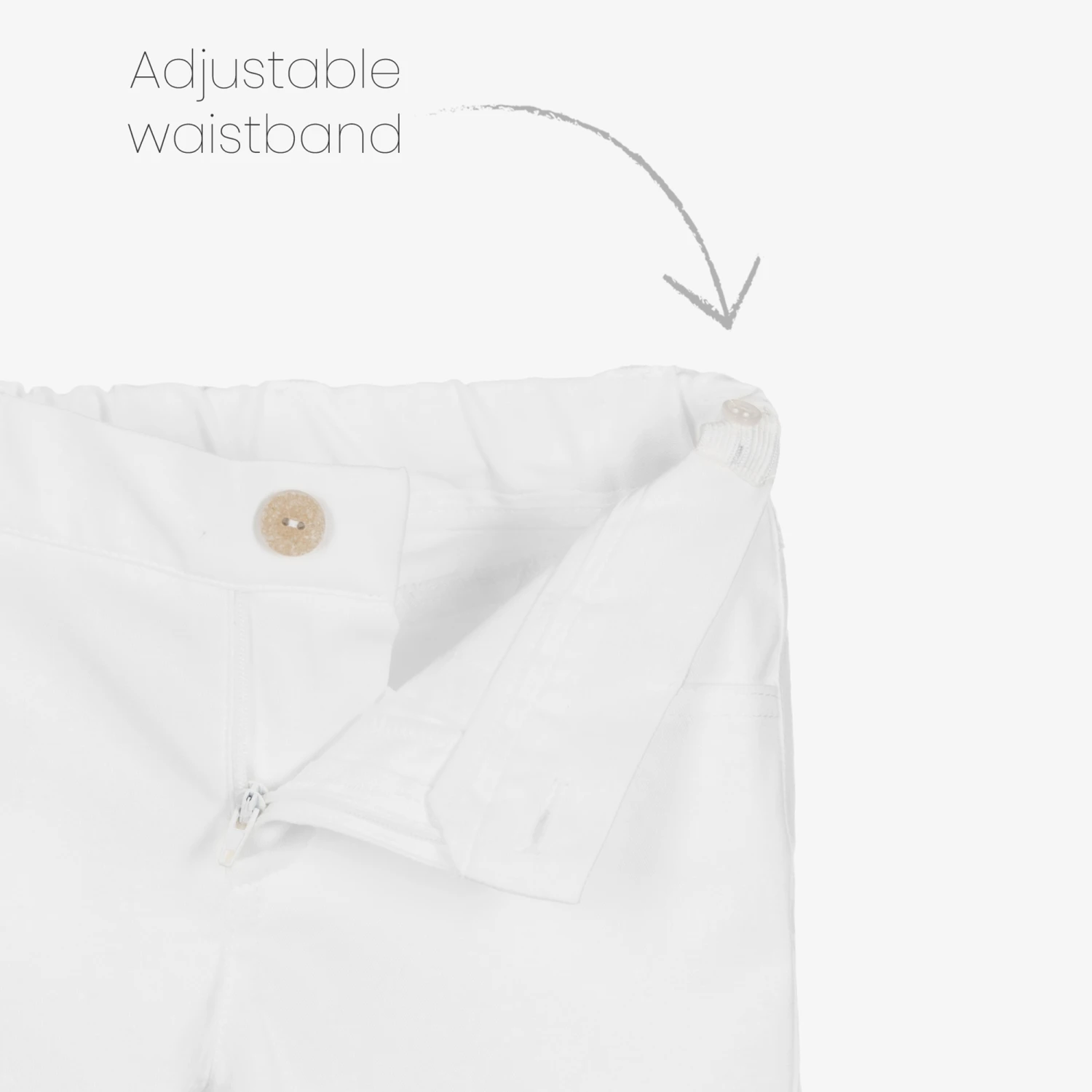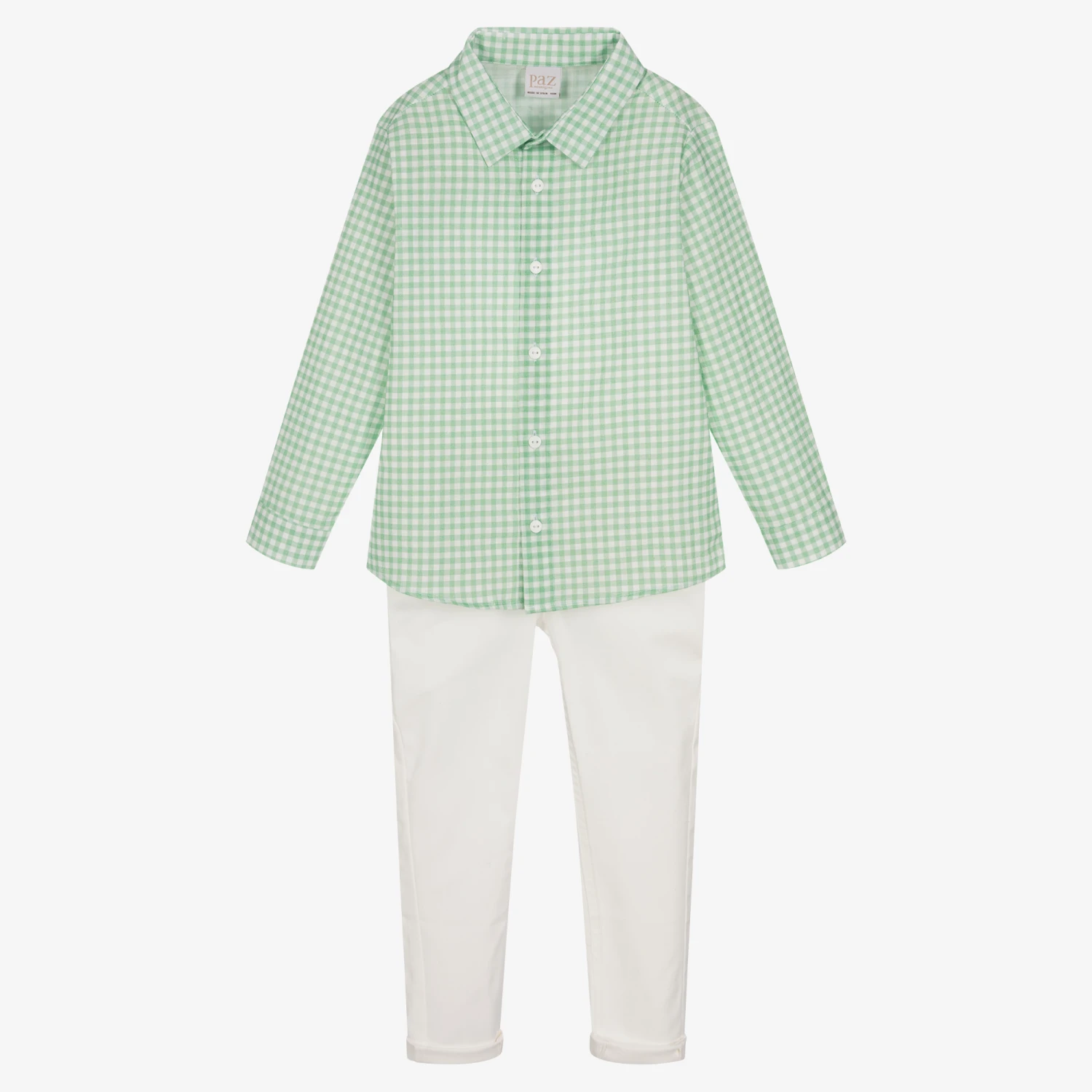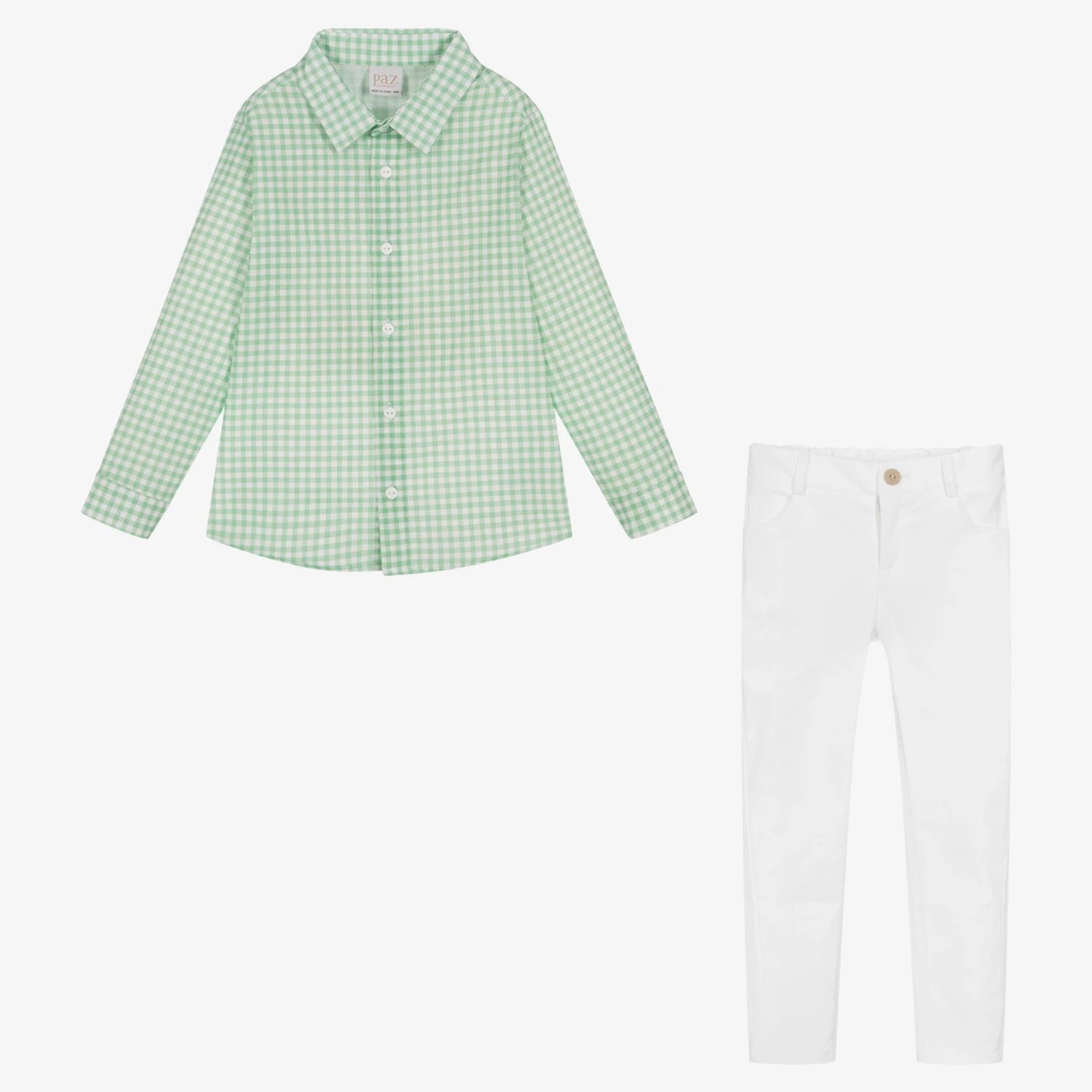 Smart-casual cotton jeans set by traditional Spanish brand Paz Rodriguez. The green and white gingham shirt has a soft, linen-feel and fastens with logo buttons on the front and cuffs. The lightweight cotton trousers have a five-pocket jeans style, with a useful, adjustable waistband and a logo badge around the back.