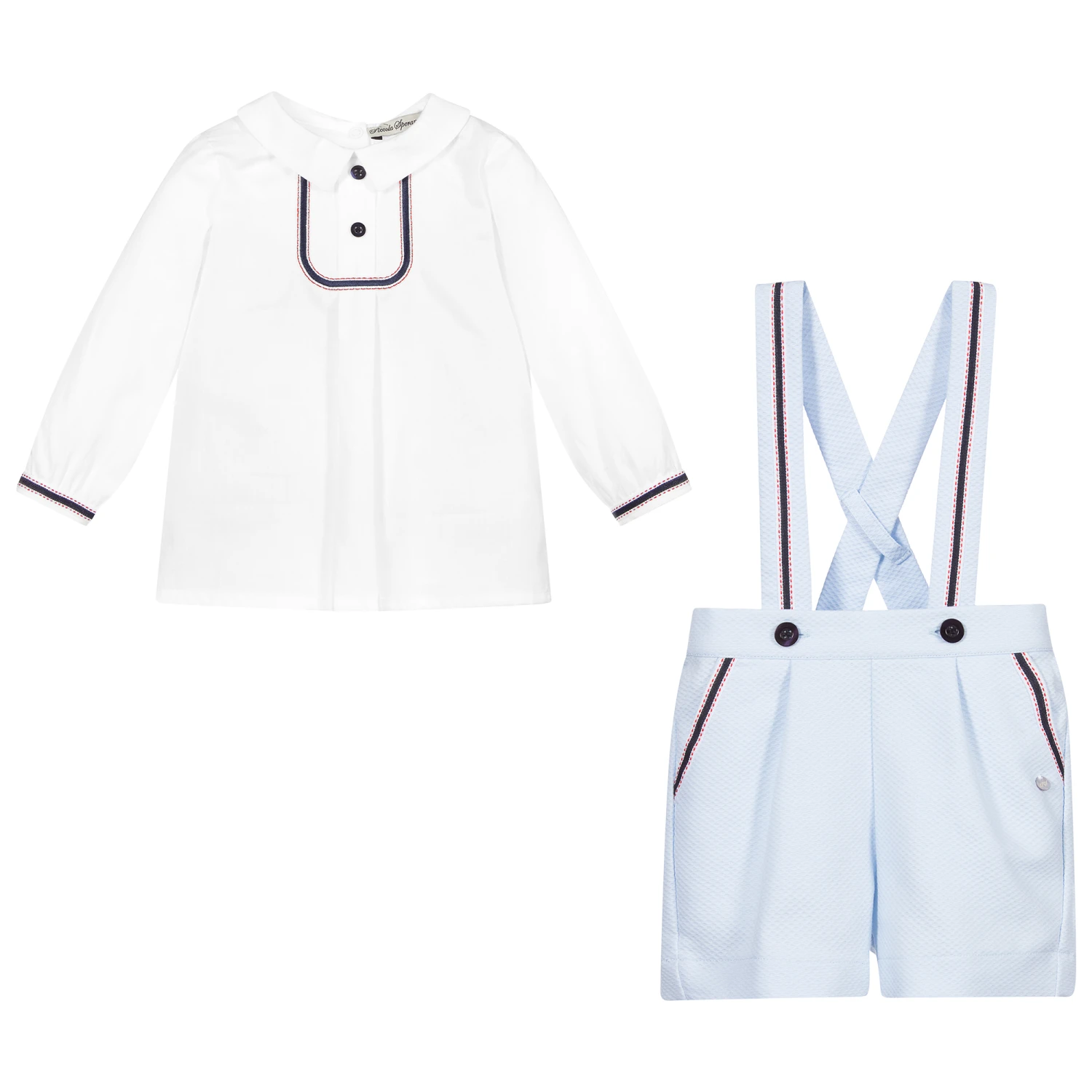 Little boys pale blue shorts and white shirt set by Piccola Speranza. The soft, lightweight cotton shirt has smart navy blue and red tape trim and decorative buttons. The cotton blend shorts have a raised waffle pattern and matching navy blue and red trim. The straps are adjustable and the waistband is elasticated.