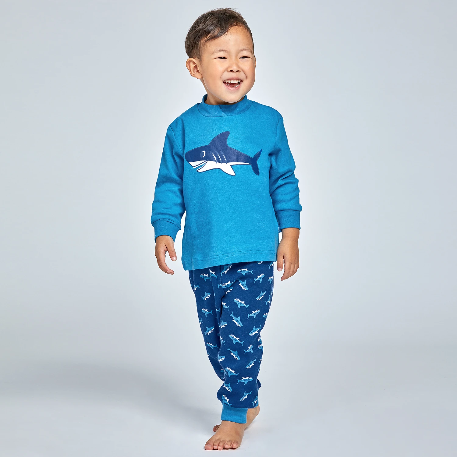 Comfortable pyjamas for boys by Playshoes, made in comfortable cotton jersey. The bright blue top has ribbed cuffs and a ribbed, split crew neck with a fun shark design on the front. The dark blue trousers have an elasticated waist, ribbed cuffs and an all-over shark print.