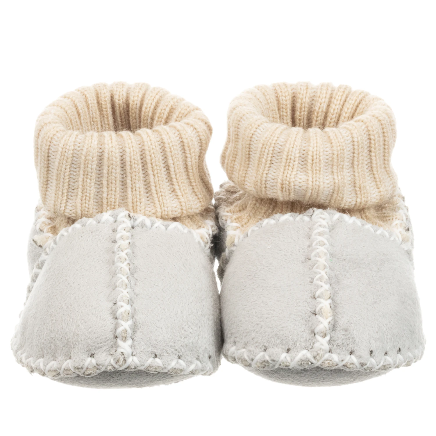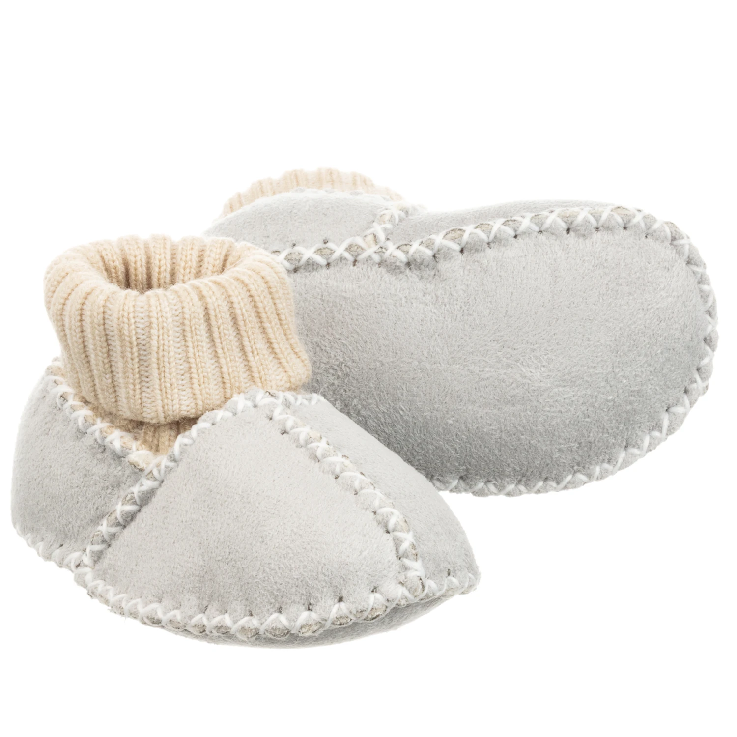 Baby boys and girls grey slipper socks from Playshoes, with beige ribbed cuffs. They are made in a suede-feel microfibre and are lined in fluffy wool.