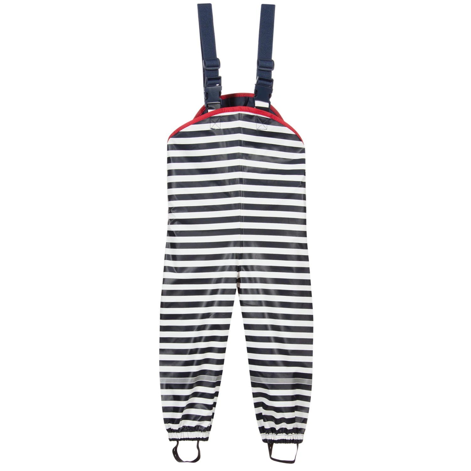 Suitable for boys and girls, a navy blue and white striped pair of salopettes by Playshoes, with fun red trims. Wind and waterproof, they have elasticated cuffs with removable boot straps. There are fully adjustable shoulder straps with clasp fastenings and red poppers on each side of the waist.