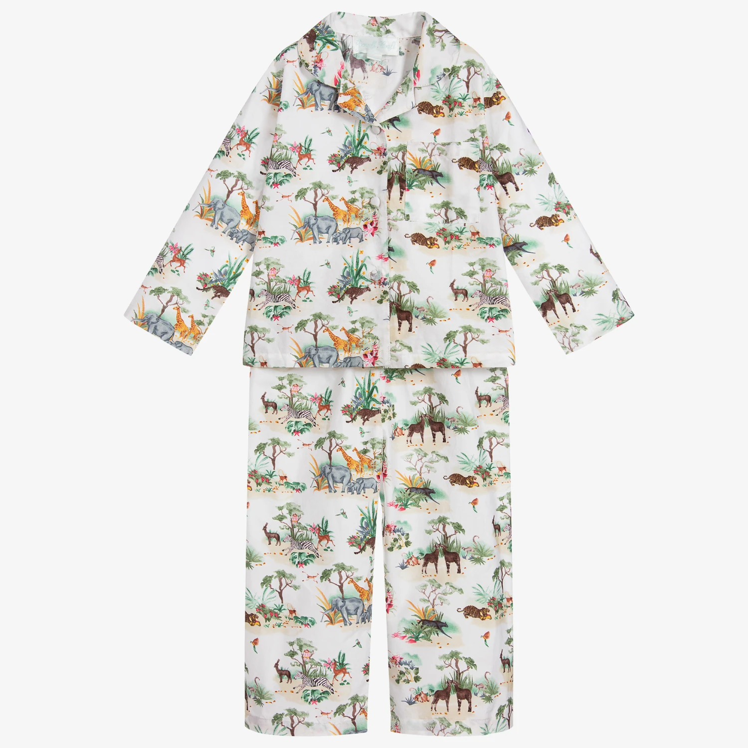 Ivory and green cotton pyjamas for boys and girls by Powell Craft. They have a colourful vintage jungle print in shades of green, yellow and red. The top has fabric covered button fastenings and a patch pocket on the front. The trousers have an elasticated drawstring waist.