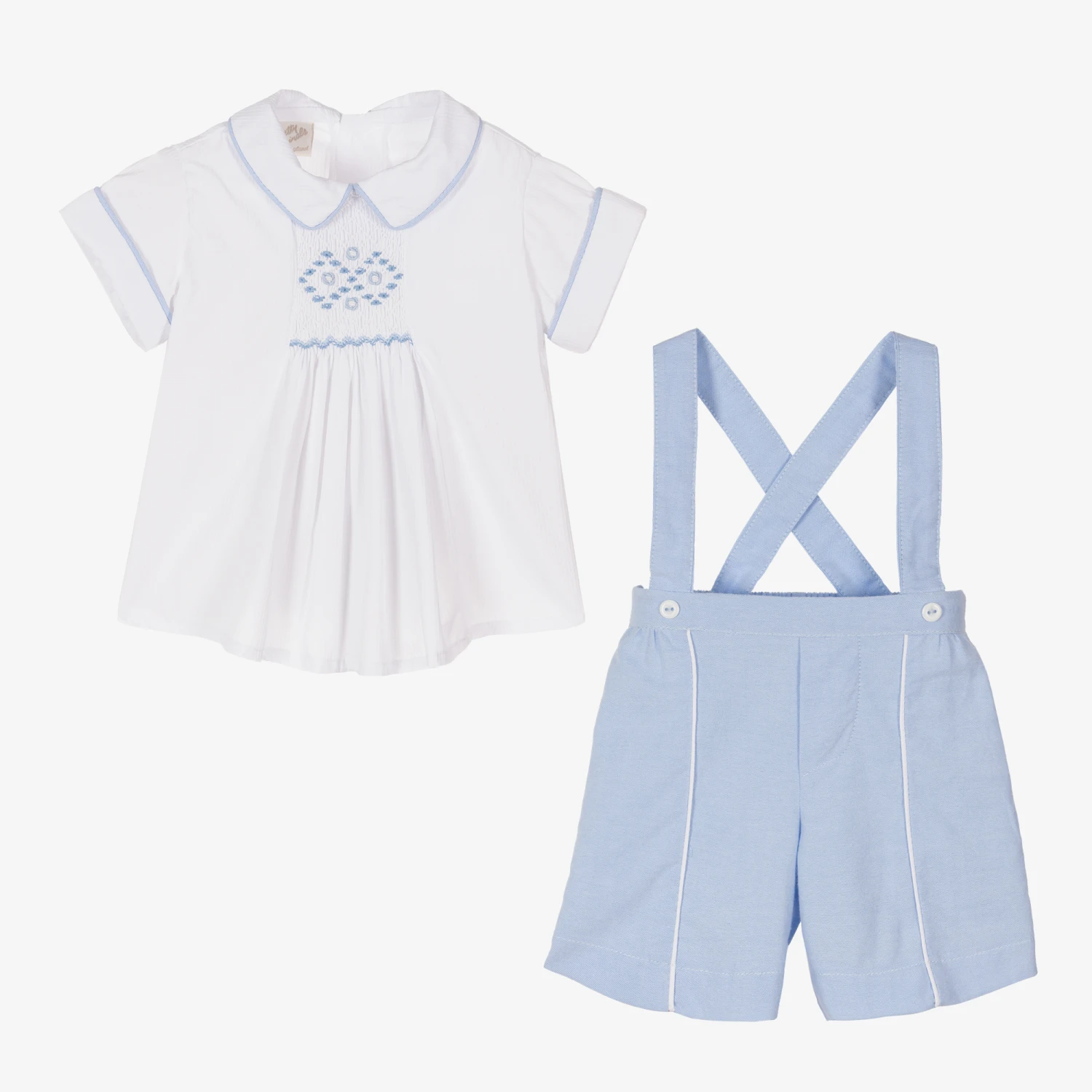 White and blue traditional shorts set for younger boys from British brand Pretty Originals. Made in a soft cotton-blend waffle-weave, the white shirt features pale blue piped edging and a classic hand-smocked panel, with delicate blue hand-embroidered detailing. The blue shorts are woven in soft and comfortable Oxford cotton, with smart white piping, adjustable shoulder straps and a part elasticated waist for quick and easy dressing.