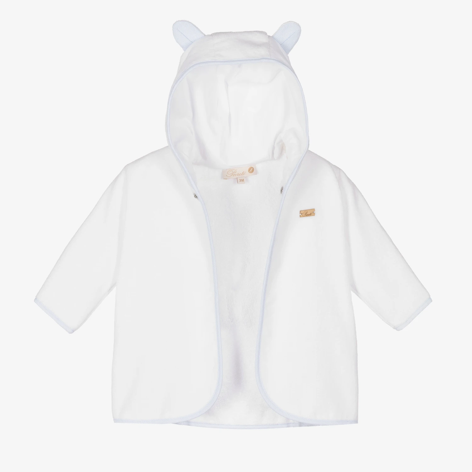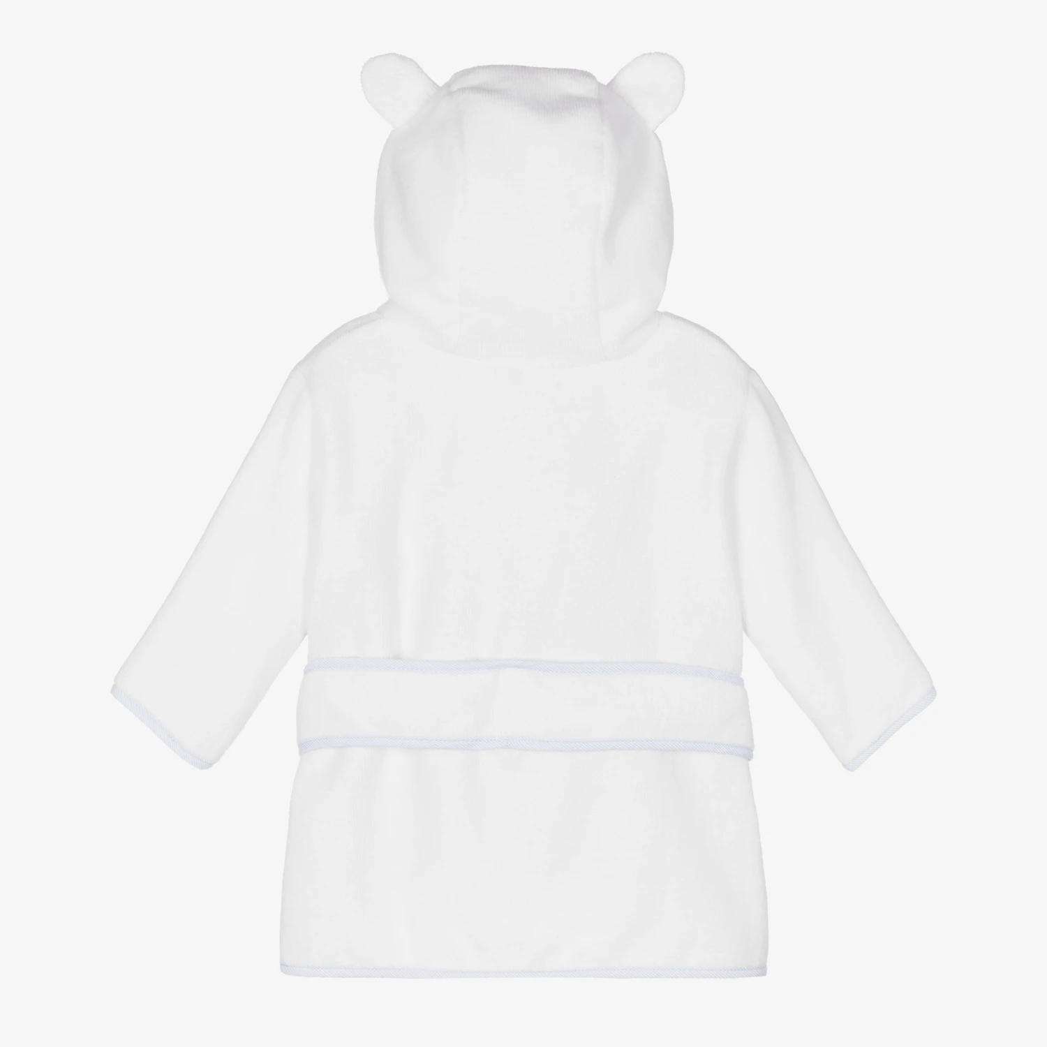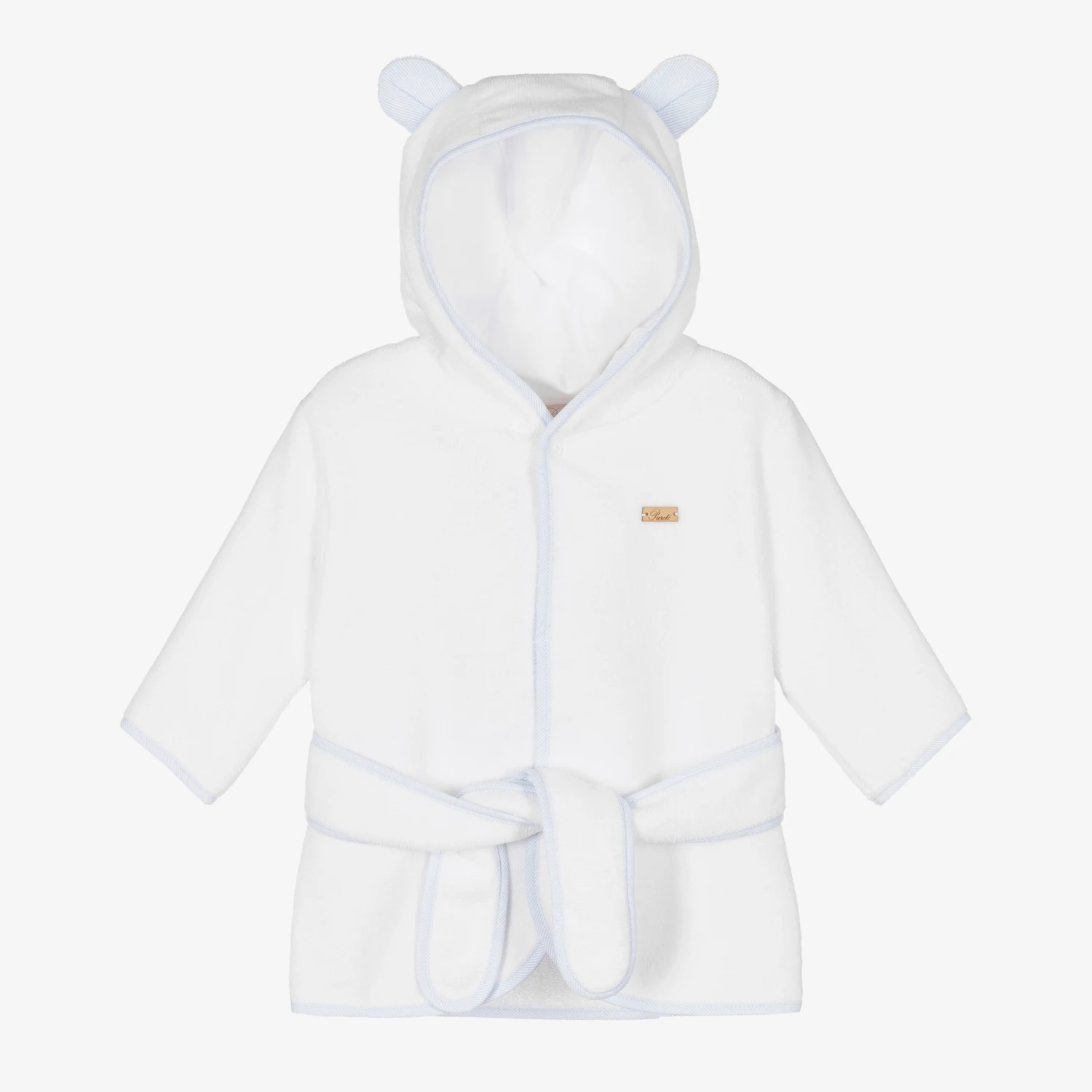 Lovely white hooded bathrobe for little boys and girls by Pureté Du… Bébe. It is made in beautifully soft cotton towelling, with blue striped trims. Fluffy and absorbent, it is just right for little ones to dry off and feel cosy and comfortable. There is fixed tie belt and a branded tab on the chest.