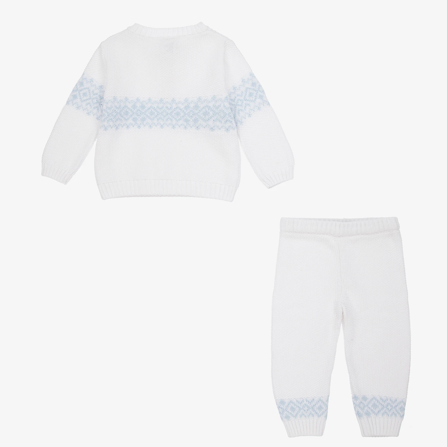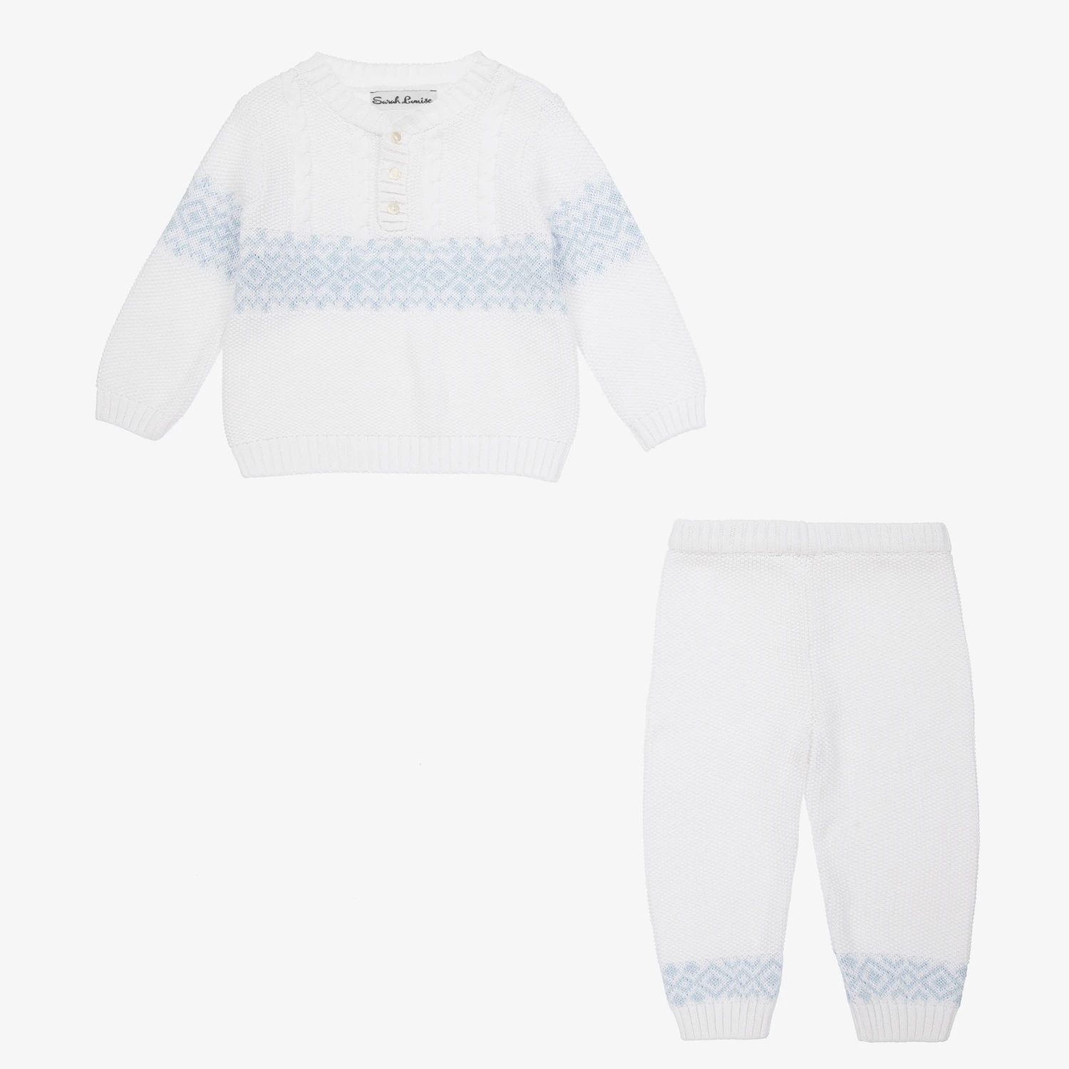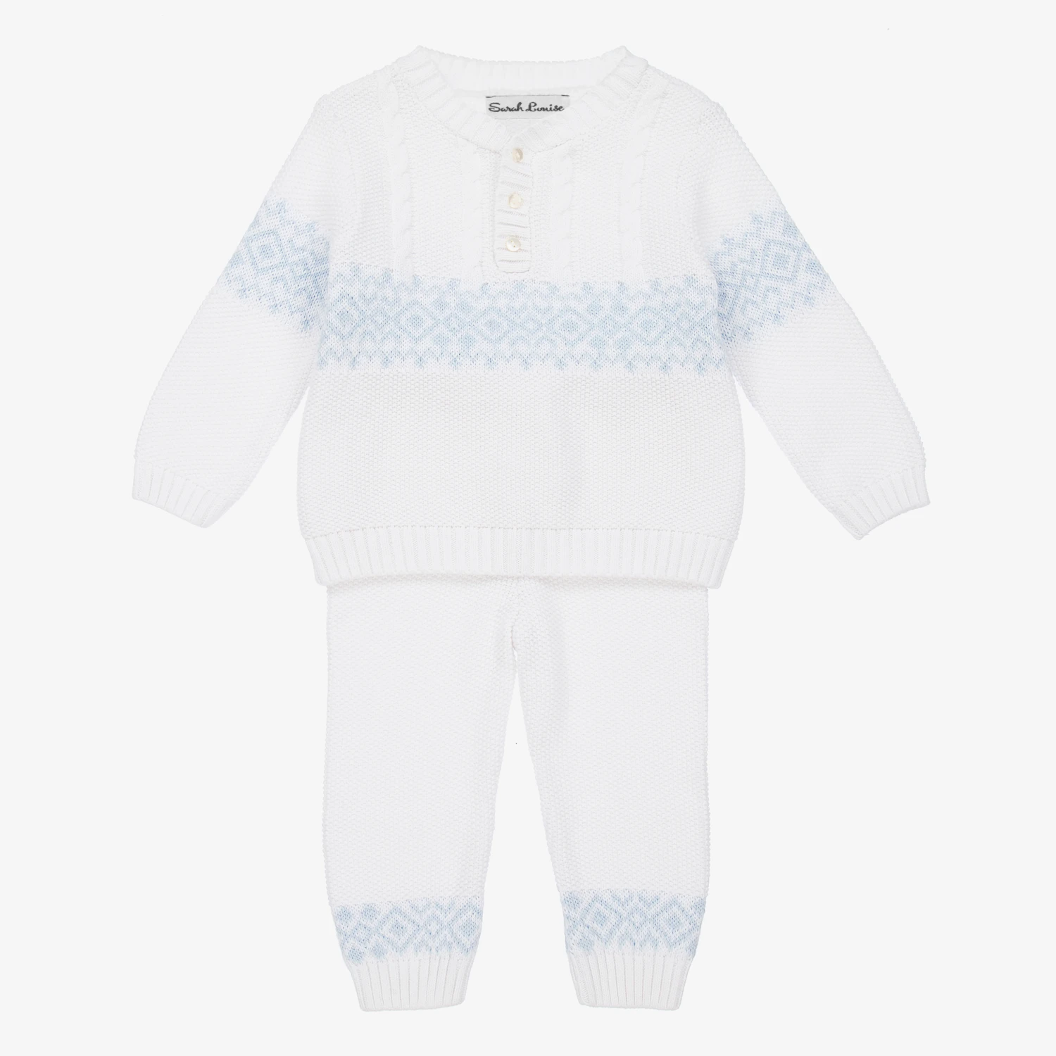 White top and trouser set for younger boys from Sarah Louise. Knitted in soft cotton moss stitch with cable detail, both pieces have a blue Fair Isle pattern. The top has button fastenings on the front and the trousers have a gently elasticated waistband.