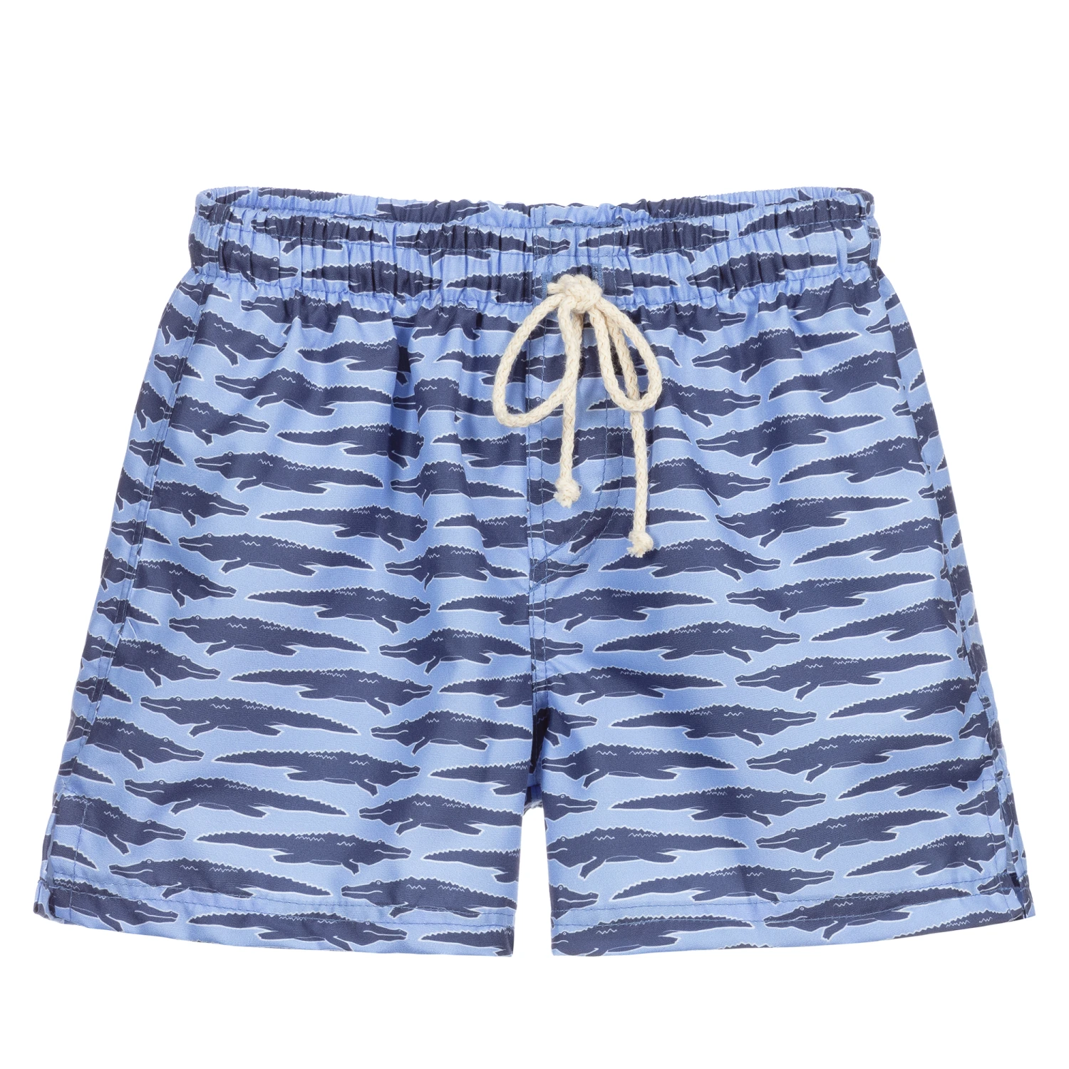 Boys swim shorts by Selini Action, in pale blue with navy blue crocodile print. Silky soft and lightweight, they have a comfortable mesh lining and an elasticated waistband with a woven drawstring. There are side vents for ease of movement and a back pocket with a blue and red logo patch